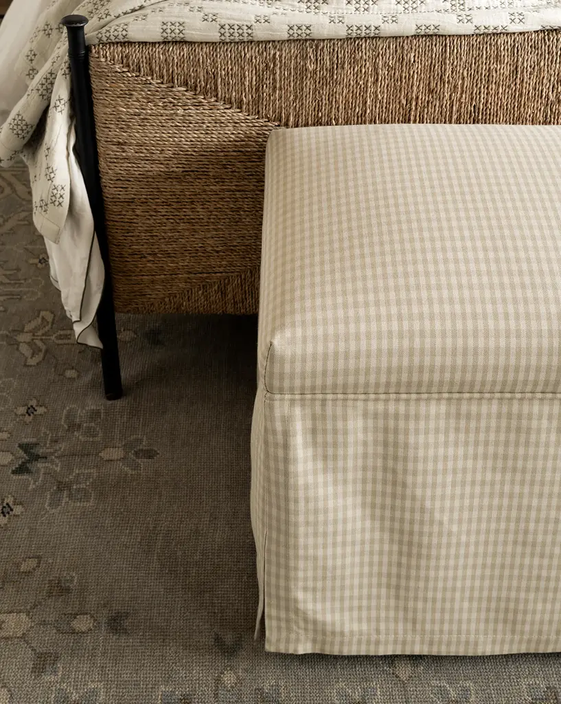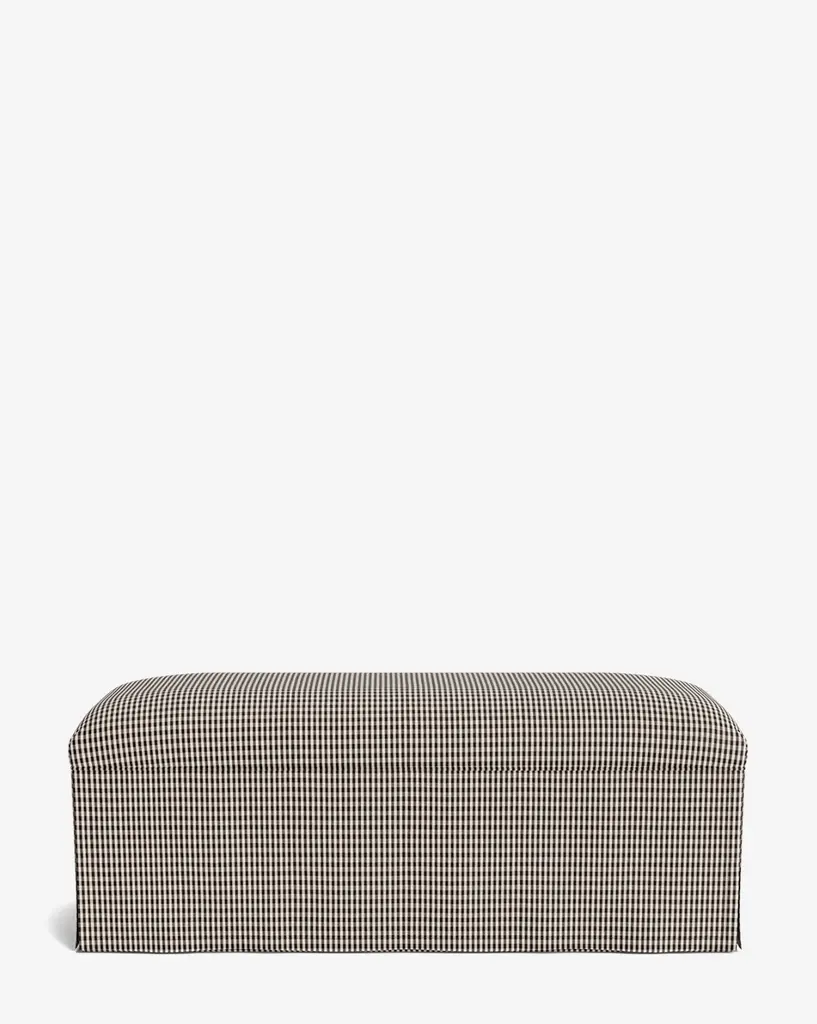 An updated take on a traditional design, our Latimer Bench features a fitted crown and faux slip skirt detailing. Soft and comfortable, the bench is a functional accent piece for your home styling. It is available in a classic yet playful Allspice Perennials Gingham or can be made-to-order with your choice of an array of high-quality fabrics.