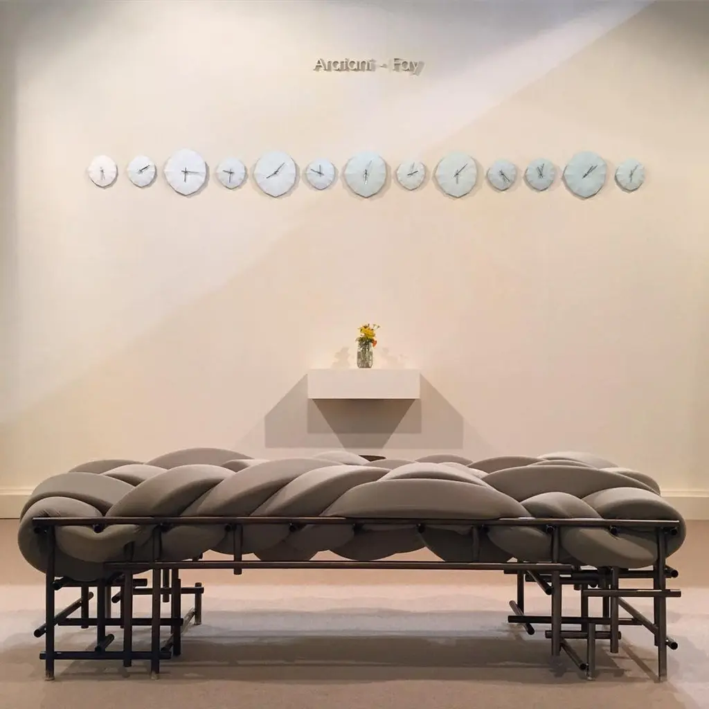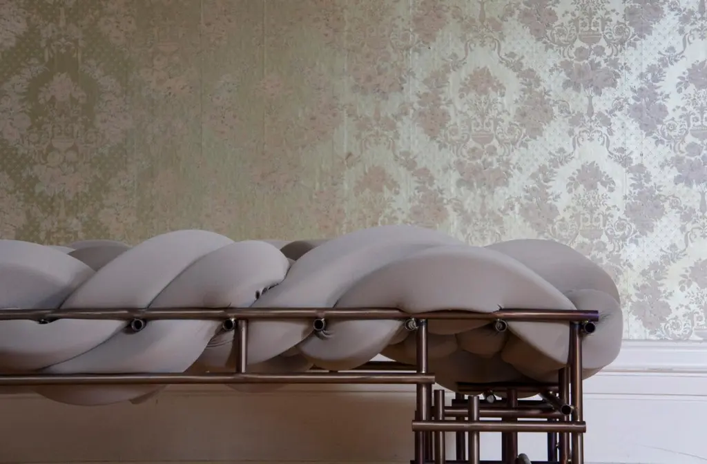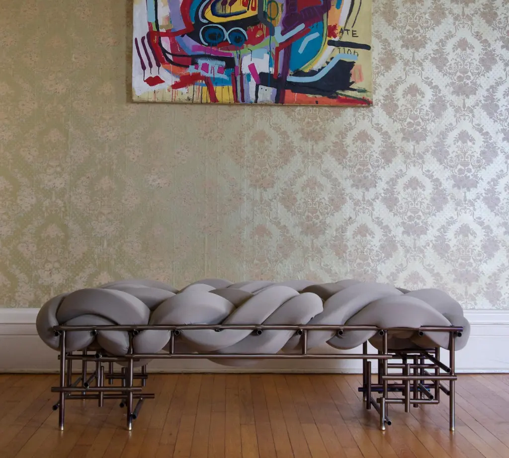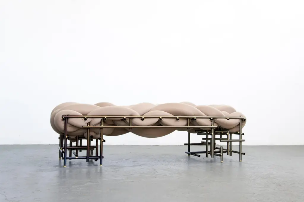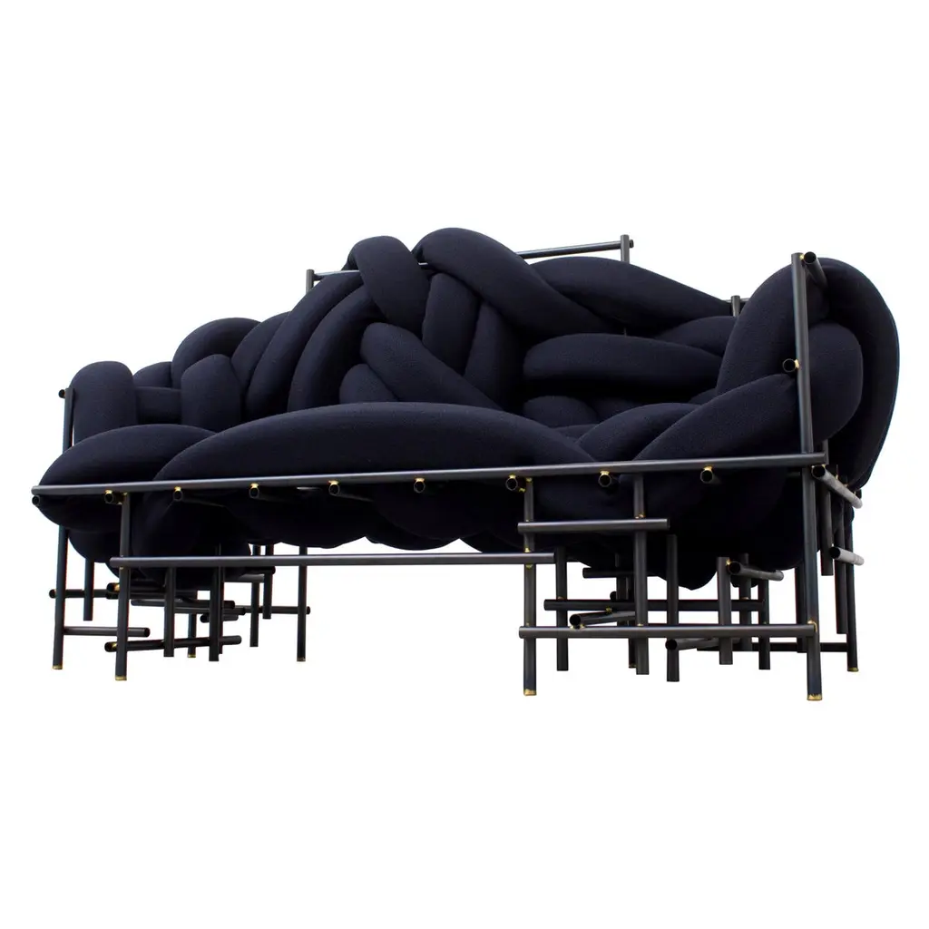 Lawless bench by Evan FayEach is a unique hand-sculpted creation Dimensions: W63” D25” H18” inchesMaterials: Steel, brass, foam, scuba knit.Lawless chair is a celebration of irregularity within a system, pursuing a more artful form that responds to the chaotic landscape within our structured society. The punk aesthetic within the chair contextualizes a poetic moment to reflect and voice through design, an attitude towards our hectically evolving environments and contemporary dilemmas. Taking ownership of truthful possessions, finding comfort in dystopia, and beauty in chaos may be a confronting reality and opportunity to embrace new expressions in design.