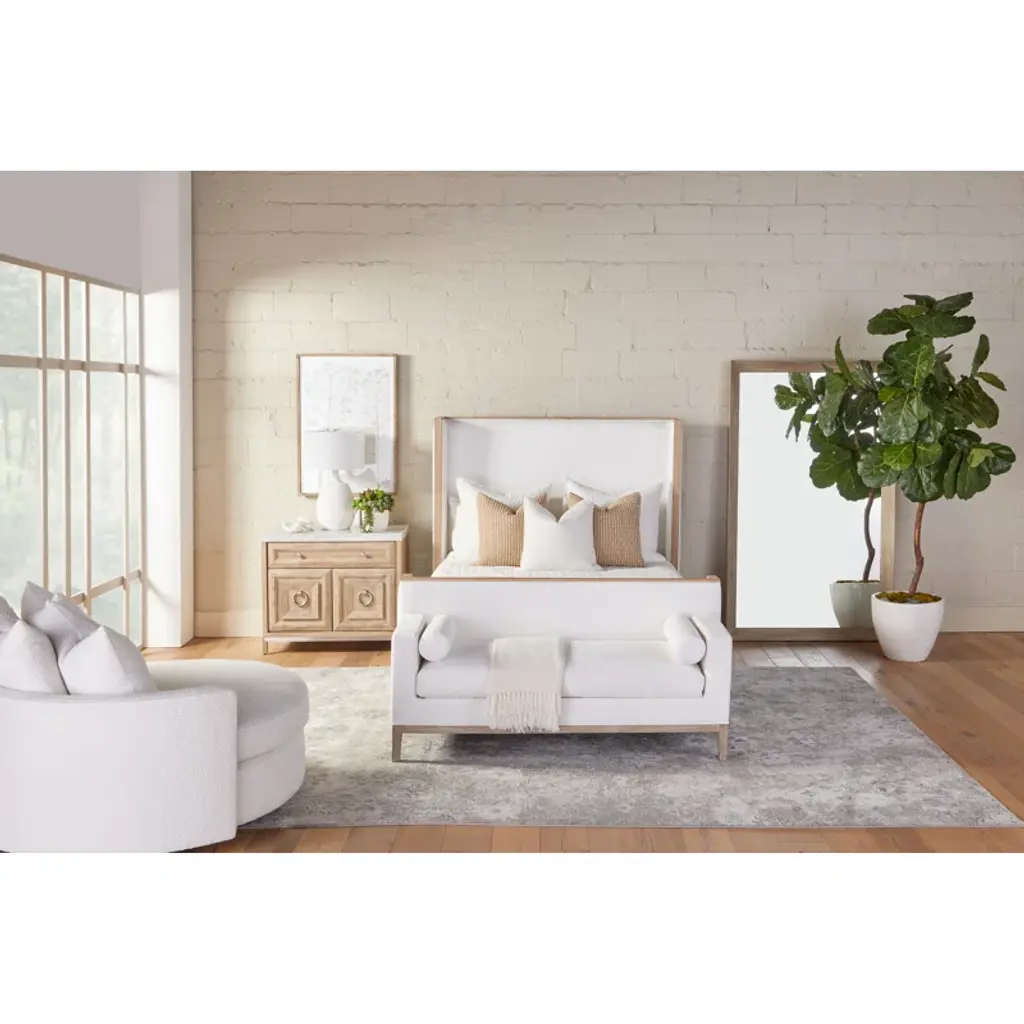 Offering comfortable, relaxing vibes, this upholstered bench is a must for spaces of all styles. It's made from solid wood and features a fabric-upholstered seat and track armrests. Included bolster pillows on each end add additional style-forward details, while the chamfered legs offer subtle mid-century elements. The cream upholstery goes with vibrant and neutral color palettes, while the natural finish on the feet makes it easy to pair this bench with all sorts of different decor.