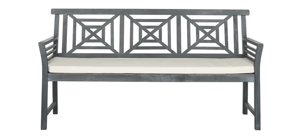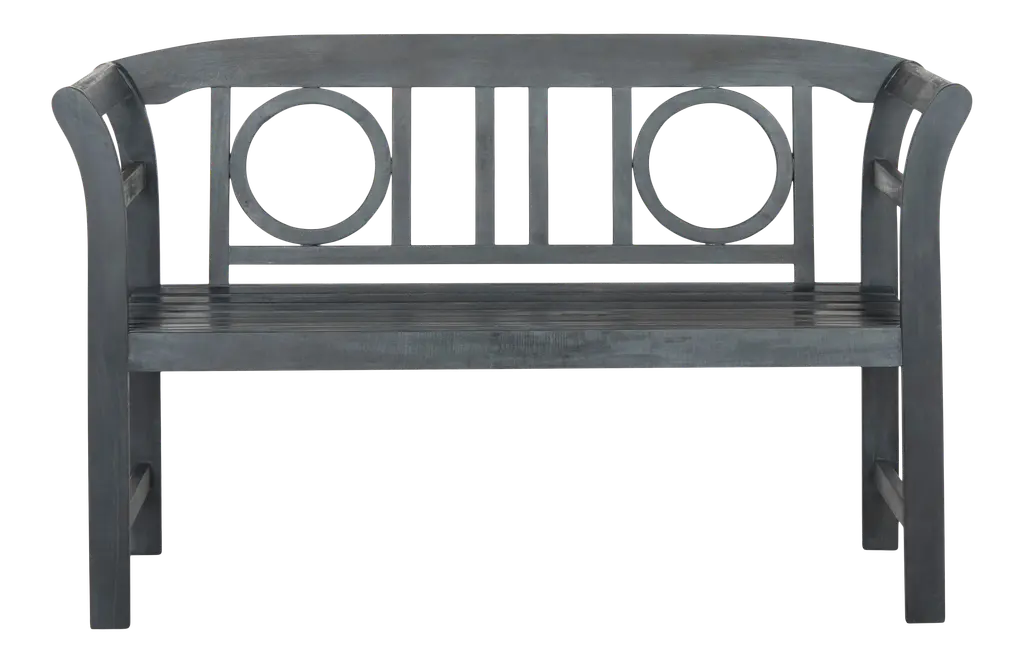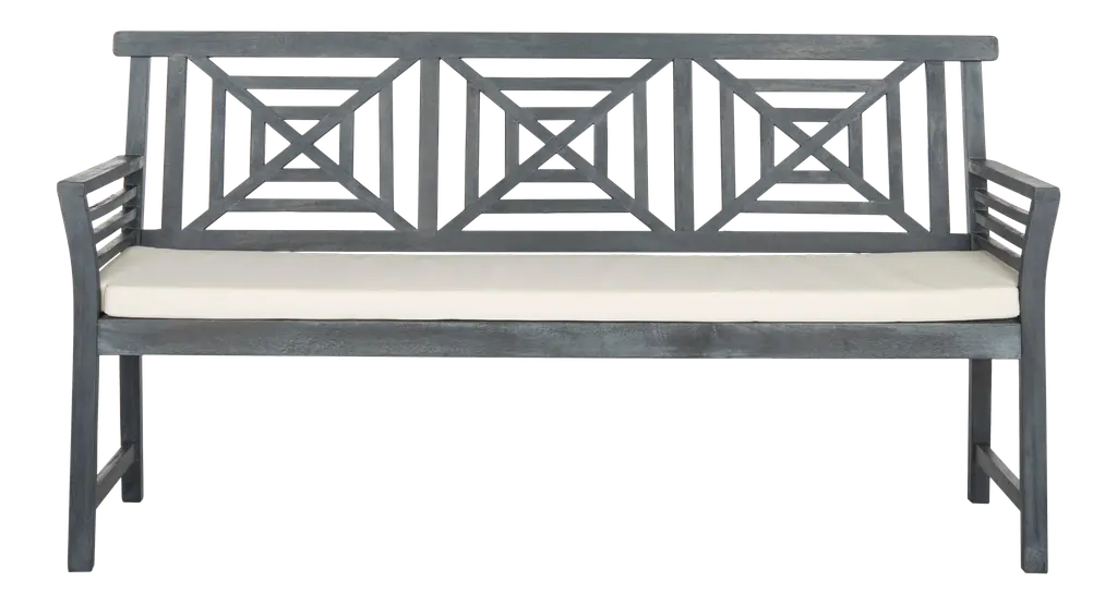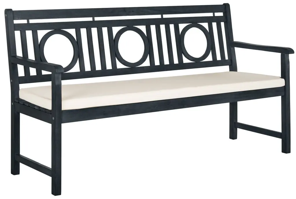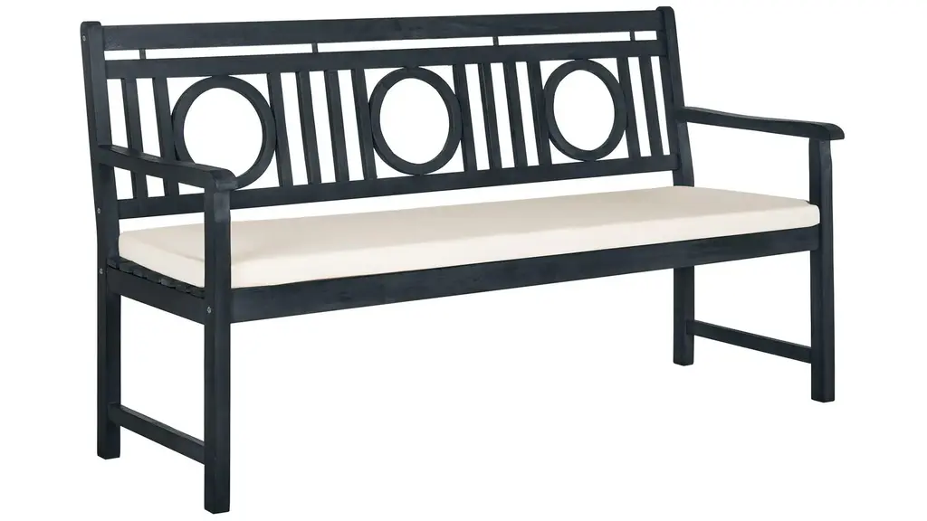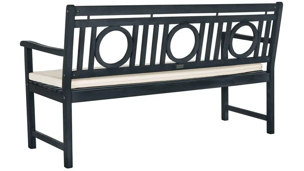 Inspired by furnishings used in the gardens of the great estates in the UK, this dark slate grey acacia wood 3 seat bench is a modern classic. Its circular geometric detail and plush cushion make it ideal for traditional or contemporary outdoor living.