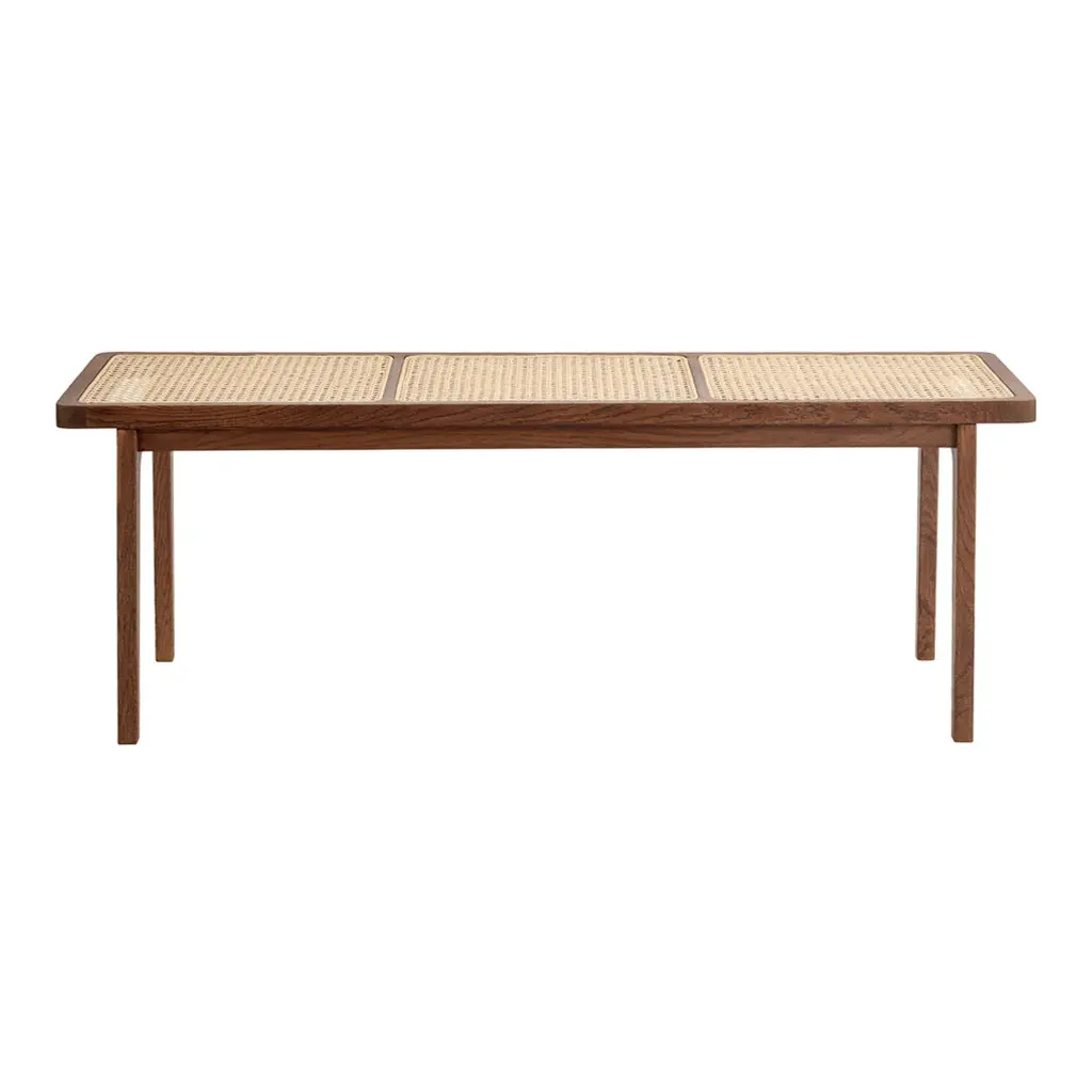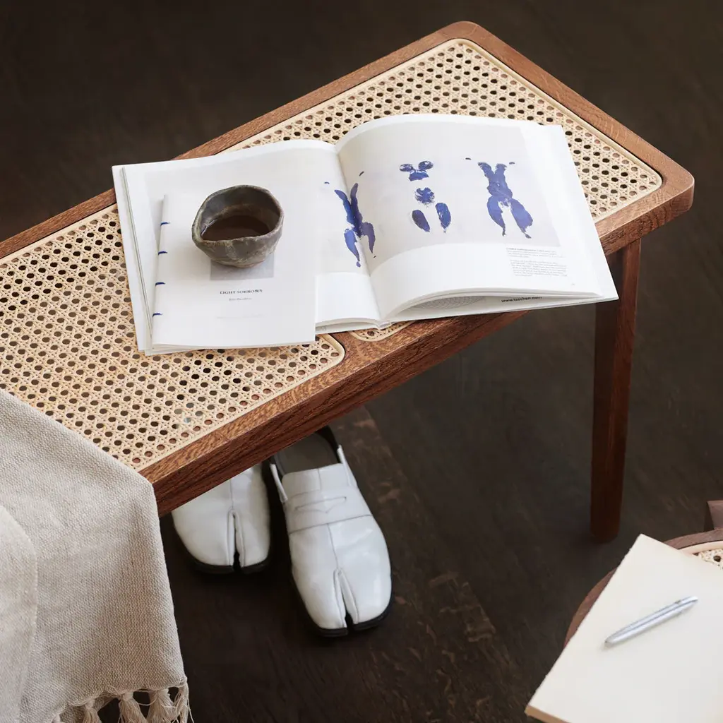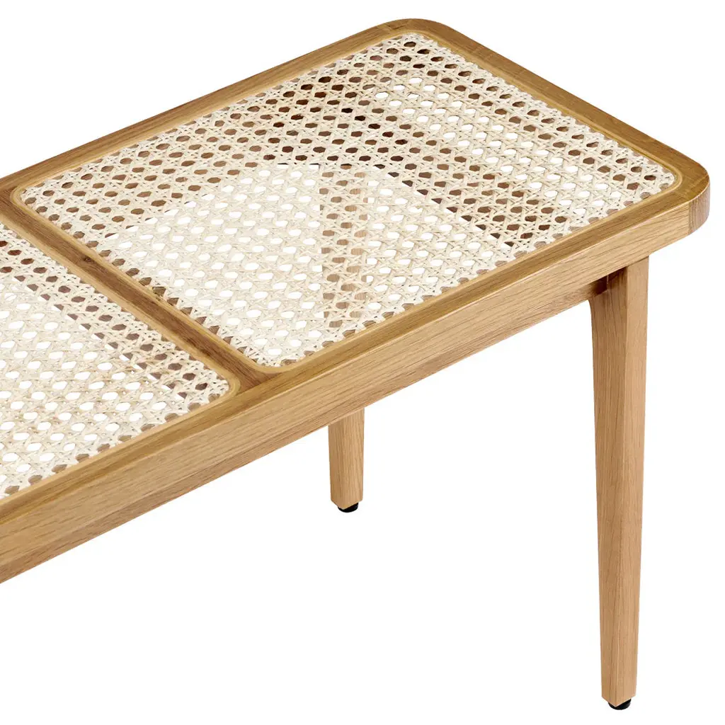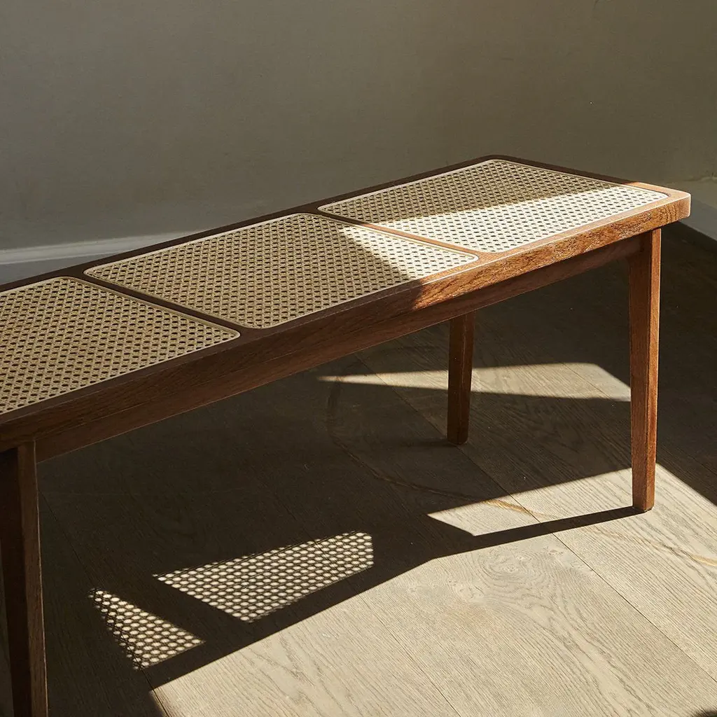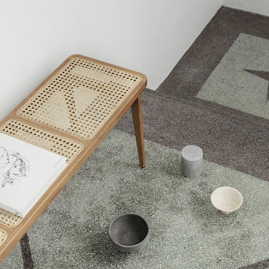 The Le Roi is a bench made from solid oak with inlaid French rattan mesh. Le Roi is the French word for King, and the series is a minimalistic interpretation of rattan furniture from the French colonial time, merged with well known Scandinavian furniture archetypes, such as the three-leg circle table and the rectangular bench. Le Roi is constructed as a frame geometry of solid oak, with French rattan mesh mounted with traditional methods. The tactile rattan mesh creates a translucent surface, which highlights the beautiful and simple construction.