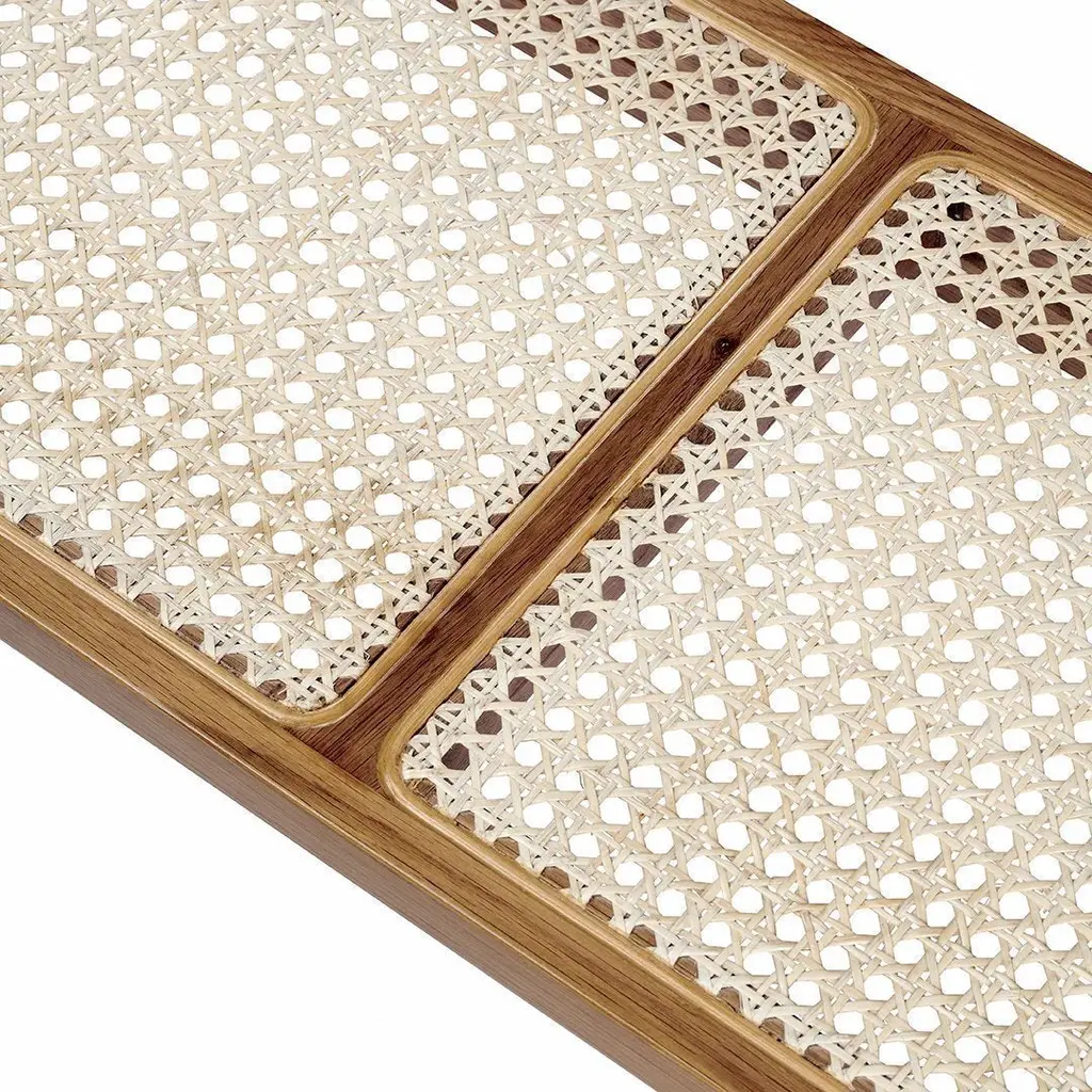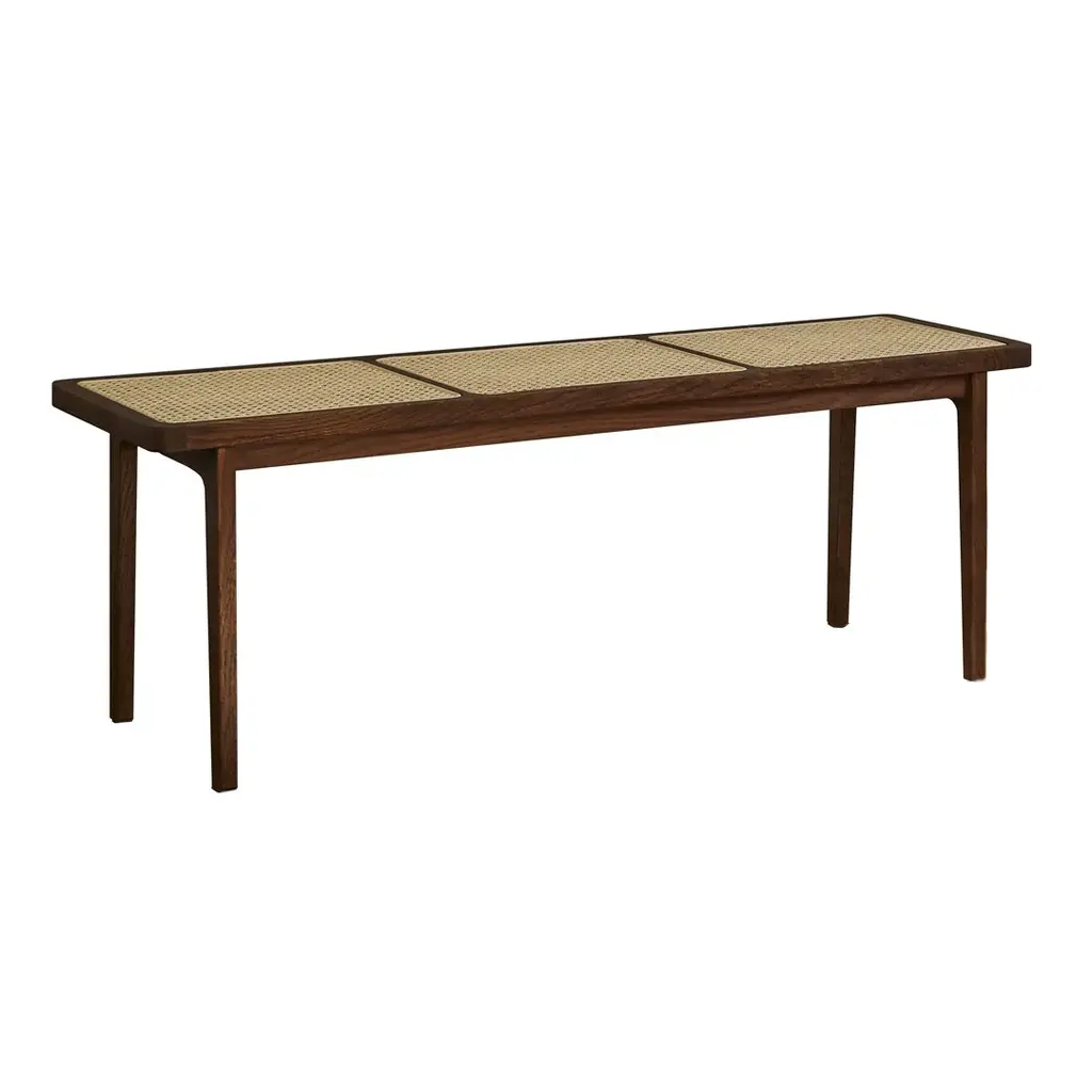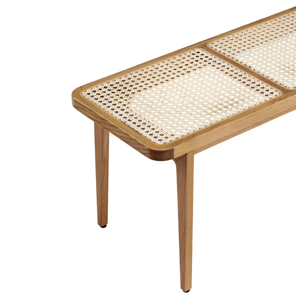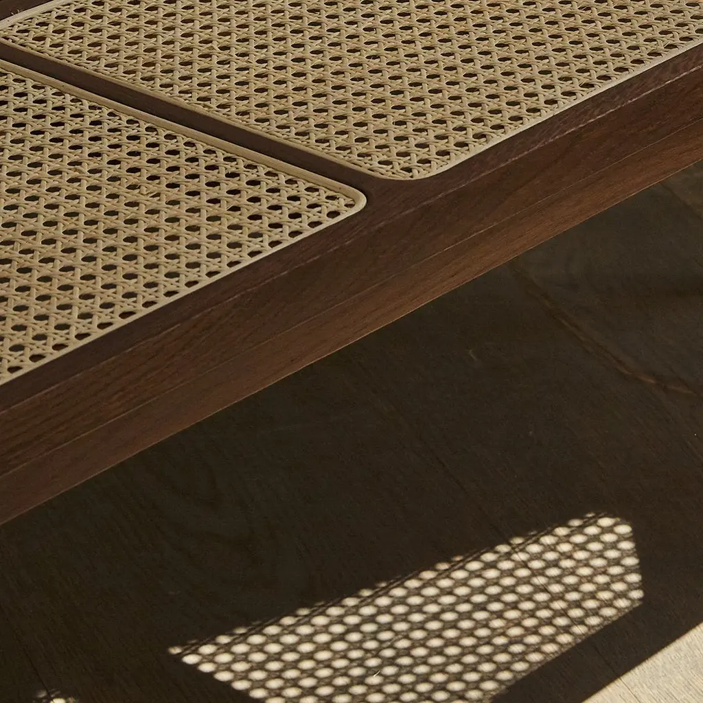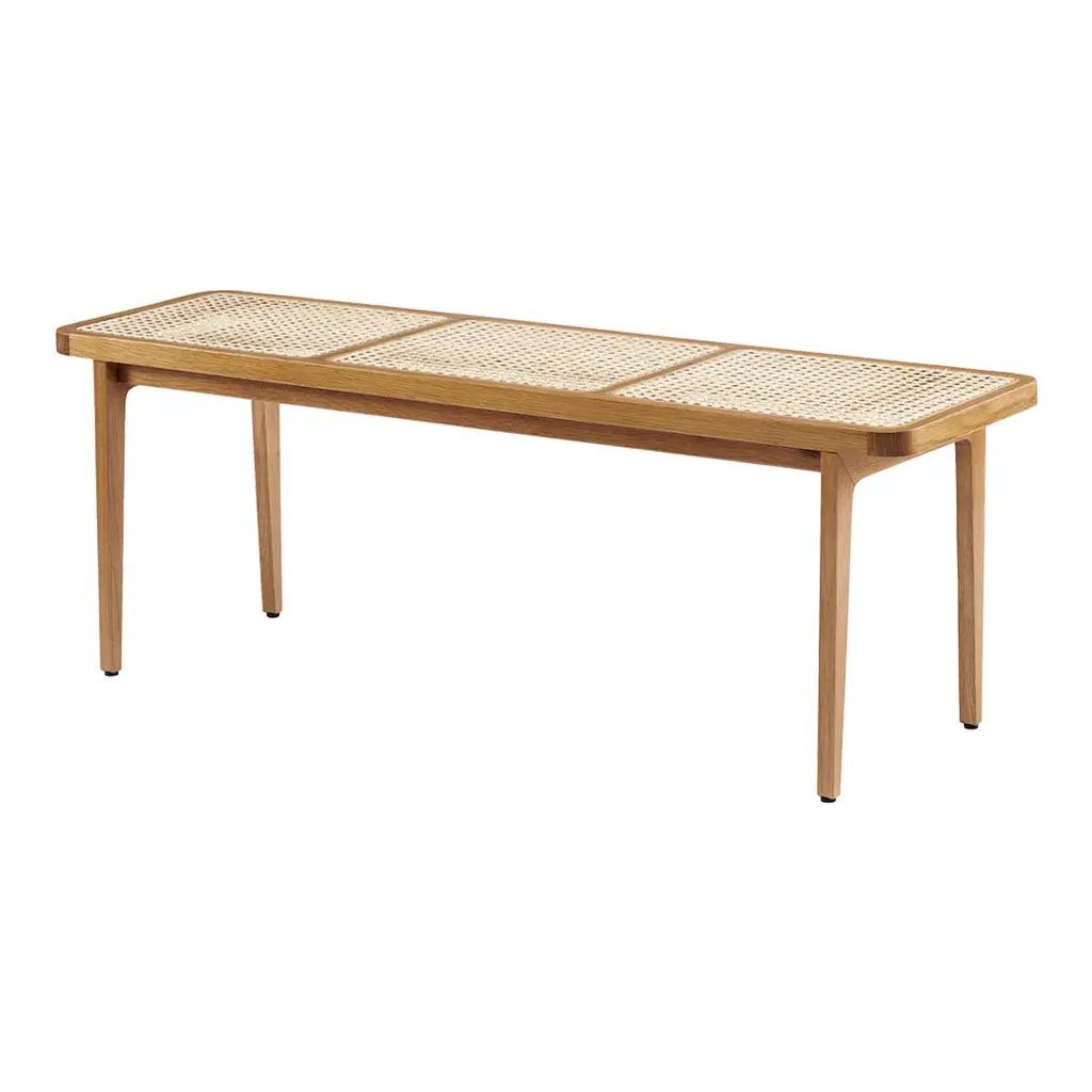 The Le Roi is a bench made from solid oak with inlaid French rattan mesh. Le Roi is the French word for King, and the series is a minimalistic interpretation of rattan furniture from the French colonial time, merged with well known Scandinavian furniture archetypes, such as the three-leg circle table and the rectangular bench. Le Roi is constructed as a frame geometry of solid oak, with French rattan mesh mounted with traditional methods. The tactile rattan mesh creates a translucent surface, which highlights the beautiful and simple construction.