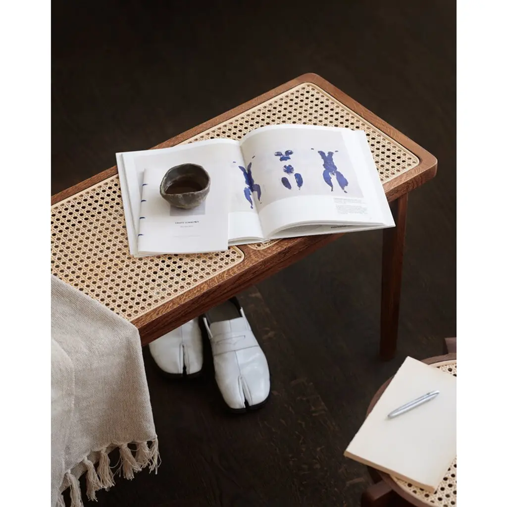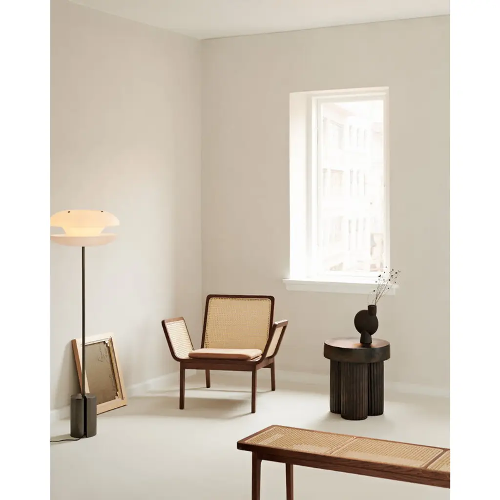 NORR11's Le Roi bench features a sleek solid wood base and a classic French rattan seat. The bench's downward tapering legs are crafted from solid ash, and the seat is woven by hand. In addition to seating, the Le Roi bench can also serve as a small side table for example next to a sofa, bed or window. Launched in 2018, the Le Roi collection was designed by Kristian Sofus Hansen and Tommy Hyldahl.