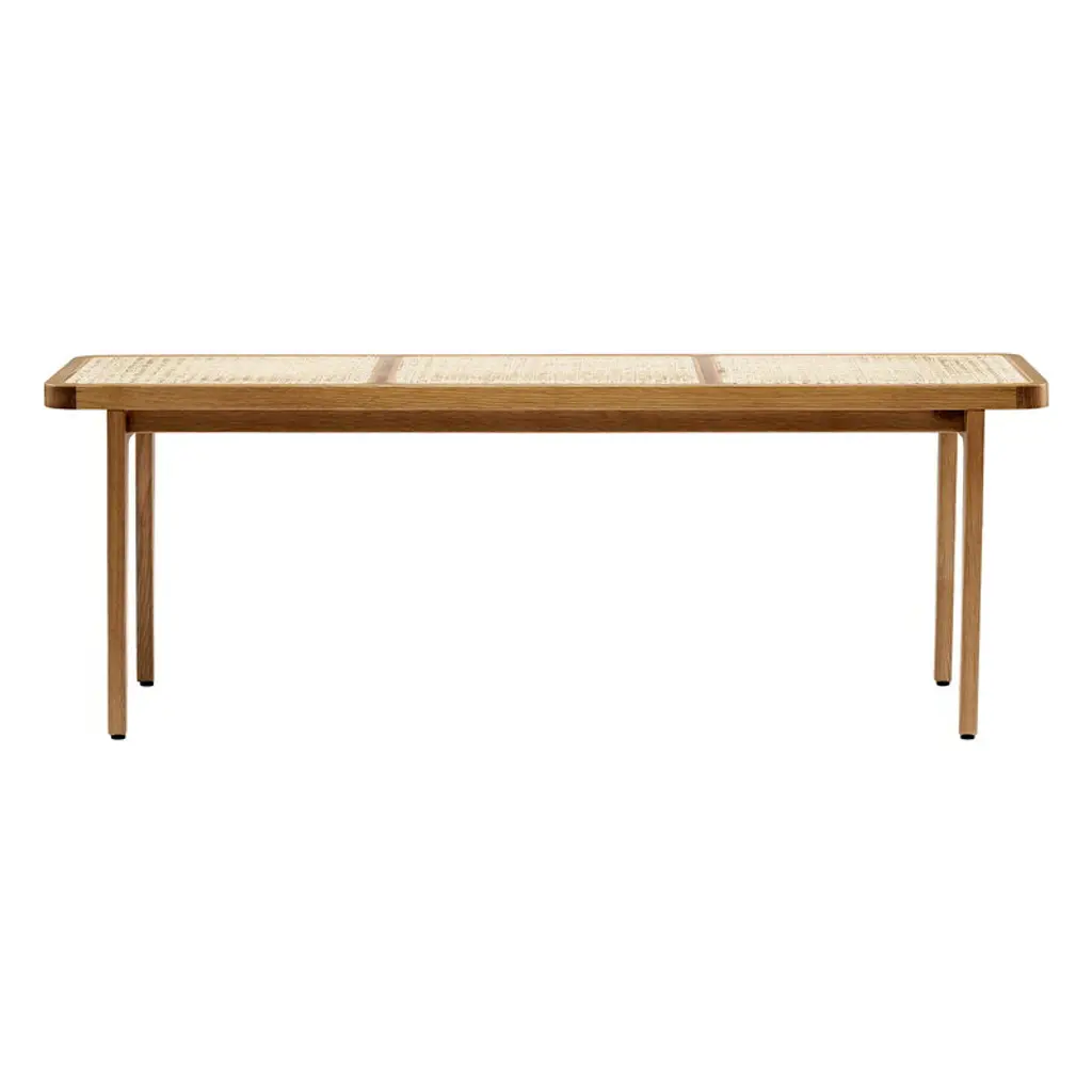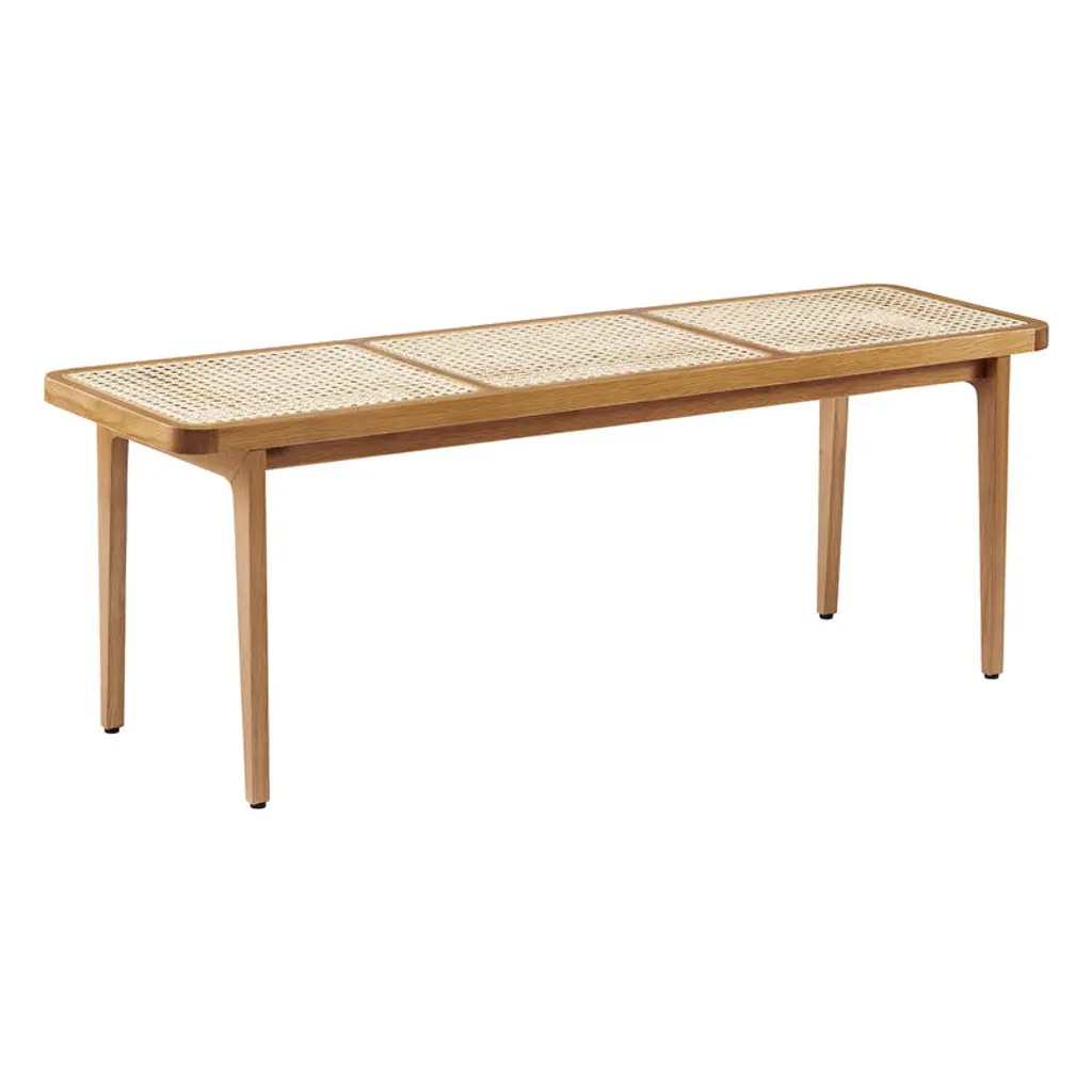 NORR11's Le Roi bench features a sleek solid wood base and a classic French rattan seat. The bench's downward tapering legs are crafted from solid ash, and the seat is woven by hand. In addition to seating, the Le Roi bench can also serve as a small side table for example next to a sofa, bed or window. Launched in 2018, the Le Roi collection was designed by Kristian Sofus Hansen and Tommy Hyldahl.