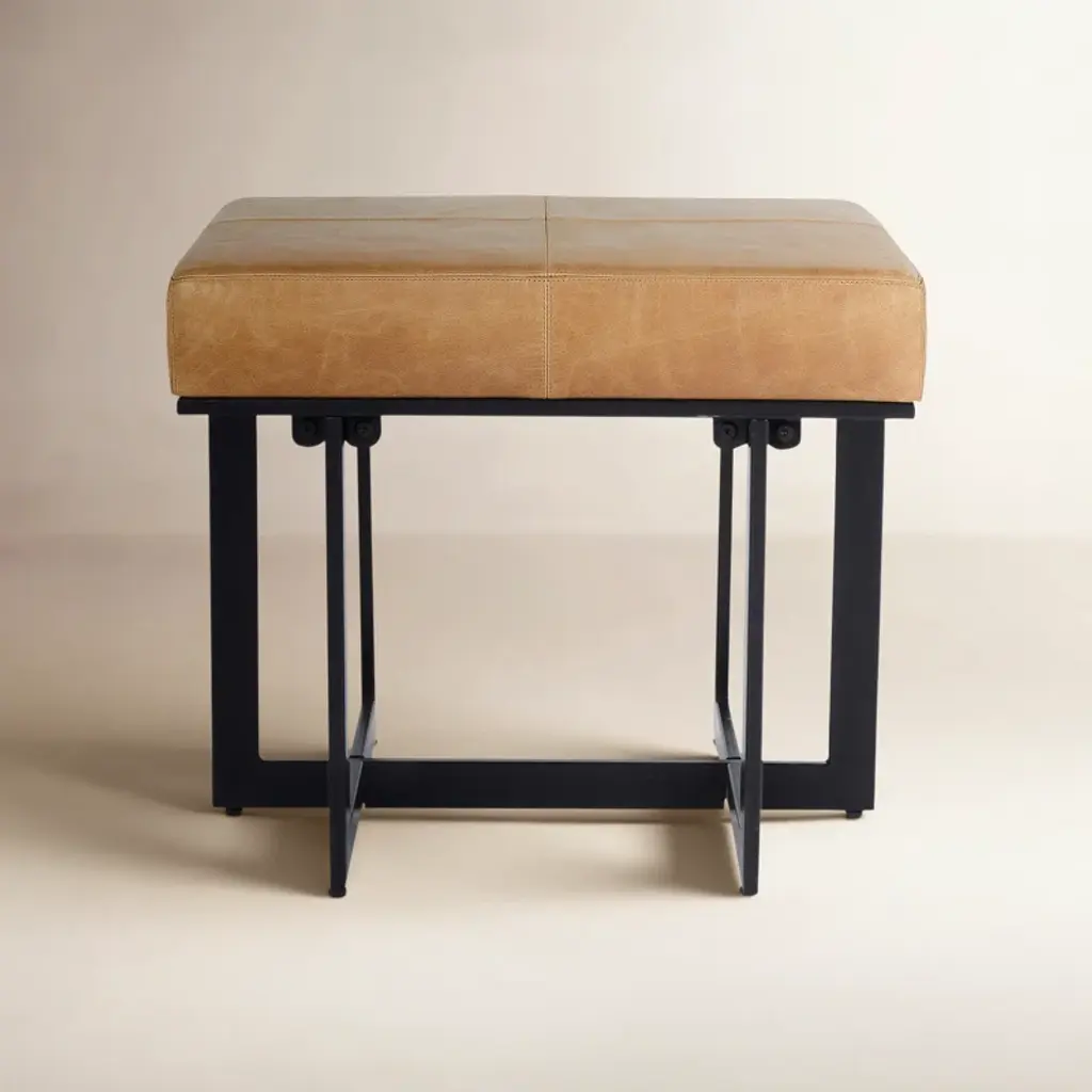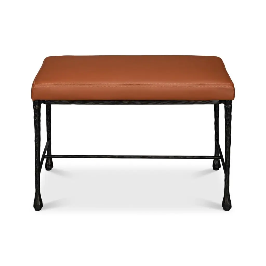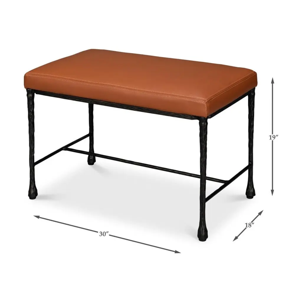 Its sturdy handwrought iron base features a textured finish and tapered legs, showcasing authentic artisanal design. Topped with a plush caramel-brown leather seat, this bench offers both comfort and style in equal measure.Ideal for entryways, bedrooms, or small living spaces, this versatile accent piece adds rustic charm and functionality to any room. Whether used as extra seating, a hallway accent, or a bedroom foot bench, the bench is a striking combination of durability, beauty, and versatility.Dimensions: 30" W x 18" D x 19" H