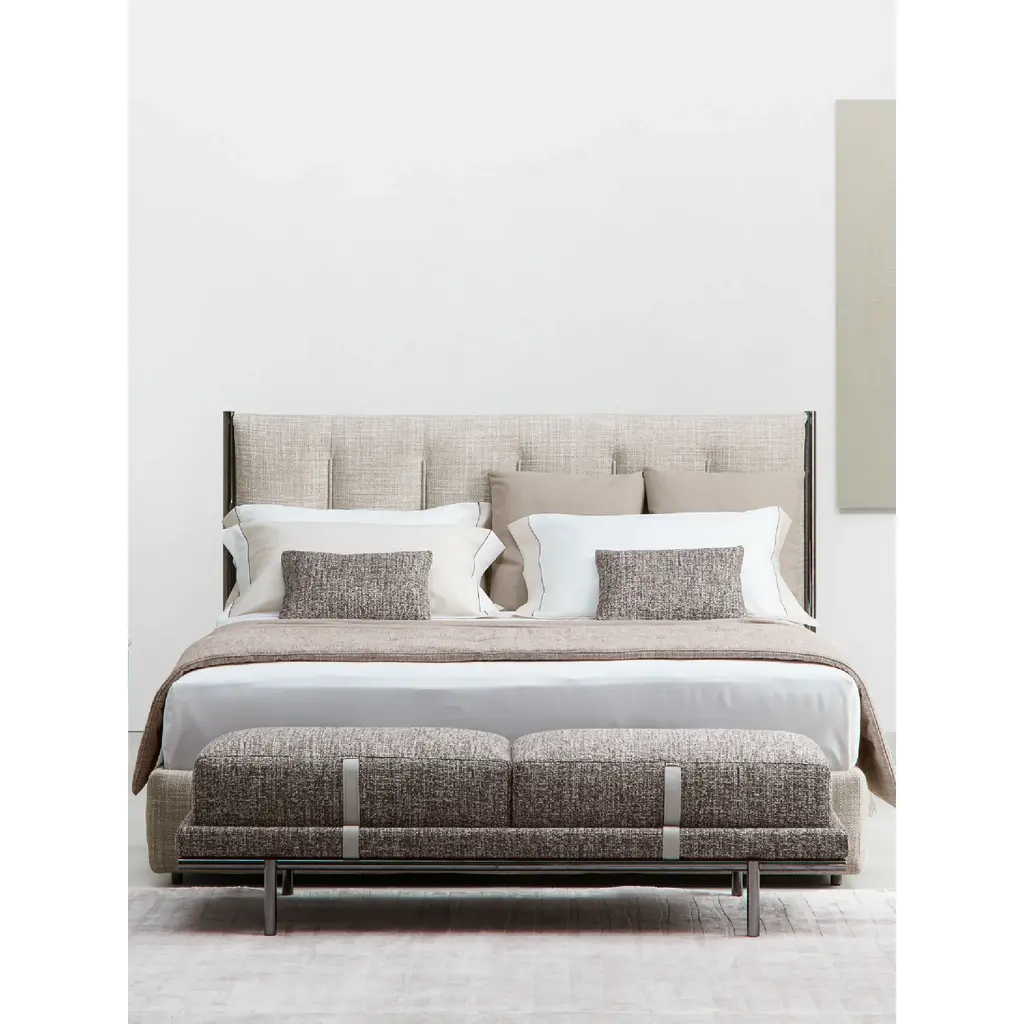 Embodying sophistication and exclusivity, the Flou New Bond Leather Strapped Bench displays the renowned bespoke artistry of Flou through its lavish fabrics and leather. Aiding its sleek cylindrical legs in a burnished or polished black nickel finish, the cushioned structure features chic exposed stitching and is adorned with tone-on-tone or contrasting leather straps. Elevating its class, the fabric or leather covers can be easily removed for effortless upkeep.
