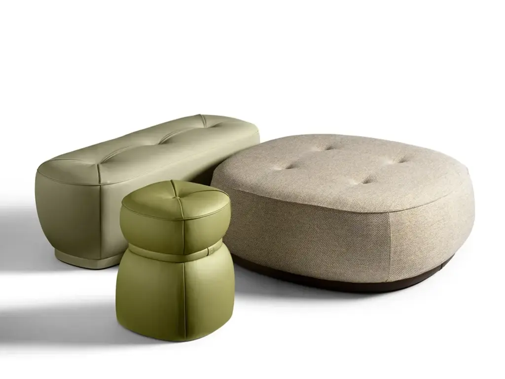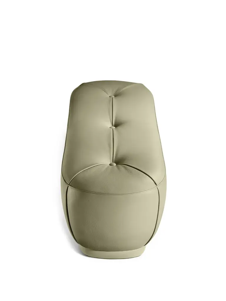 The structure of the Leplì pouf is in birch plywood and poplar with uprights in solid beech and infill in kraftliner. In the version with storage compartment, the side shells are in moulded rigid polyurethane, the metal parts of the opening mechanism and the zips are in nickel-plated steel and zamak, and the lid is in birch plywood. The base is in poplar plywood with a scratch-resistant black lacquered MDF bottom. The seat is padded with polyurethane foam and polyester wadding (the model with storage compartment has polyurethane foam padding for the structure and lid). The Leplì poufs can be upholstered in Pelle Frau® leather or fabric with an ornamental leather band. When the upholstery is in leather the ornamental band is always the same colour as the pouf. In the leather version four folds originate from the central button of the seat to define the profile of the pouf. In the fabric version the folds are replaced by stitching.Leplì is a stool, bench and pouf. Kensaku Oshiro designs four versatile pieces with a strong identity. The designer draws on traditional Poltrona Frau processes and decorations, combining them with sartorial details borrowed from the world of fashion. Classic stitching and soft folds bring out the sinuous simplicity of the design. The voluptuous curves of the stool, in particular, are inspired by the female form and, like in a dress, a slender belt highlights her “waist”.