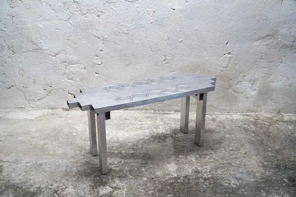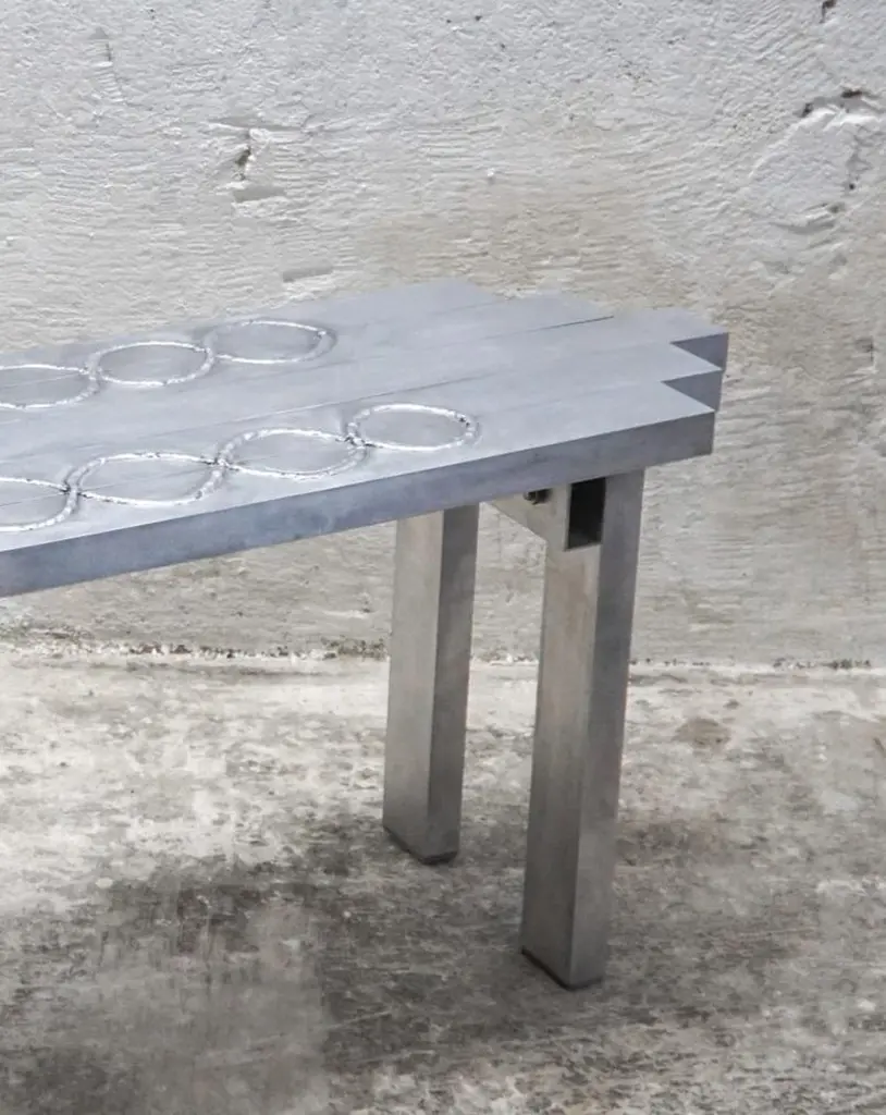 Les Savoyards Bench by Mélissa MarillerDimensions: D 45 x W 130 x H 35 cm.Materials: Aluminum.Inspired by regional vernacular furniture, Les Savoyards is a research project based on simple construction principles and «historical» motifs. Selected motifs are hybridized and used to solder and join the pieces together. The hybridization of period and contemporary furniture allows us to imagine the reintroduction of these neglected pieces into modern interiors.Mélissa Mariller, a resident of Marseille, resides at the captivating intersection of design and art, giving rise to a captivating world of functional sculptures and artistic marvels. Her work transcends boundaries, blurring the lines between form and function, crafting pieces that effortlessly marry beauty and purpose.In 2020, Mélissa embarked on a transformative journey, co-founding the espace Montebello in Lyon. This visionary space serves as a harmonious fusion of artists' and designers' studios—a dynamic hub where creative minds converge, exchanging ideas, and sparking new artistic dialogues.With an unwavering commitment to pushing the boundaries of her craft, Mélissa Mariller emerges as a luminary in the realm of contemporary design and art. Her pieces not only bear witness to her boundless creativity but also speak to the infinite possibilities that lie at the crossroads of function and artistry. Through her artful lens, she continues to inspire and redefine the artistic landscape, leaving an indelible mark on the creative world she so passionately shapes.