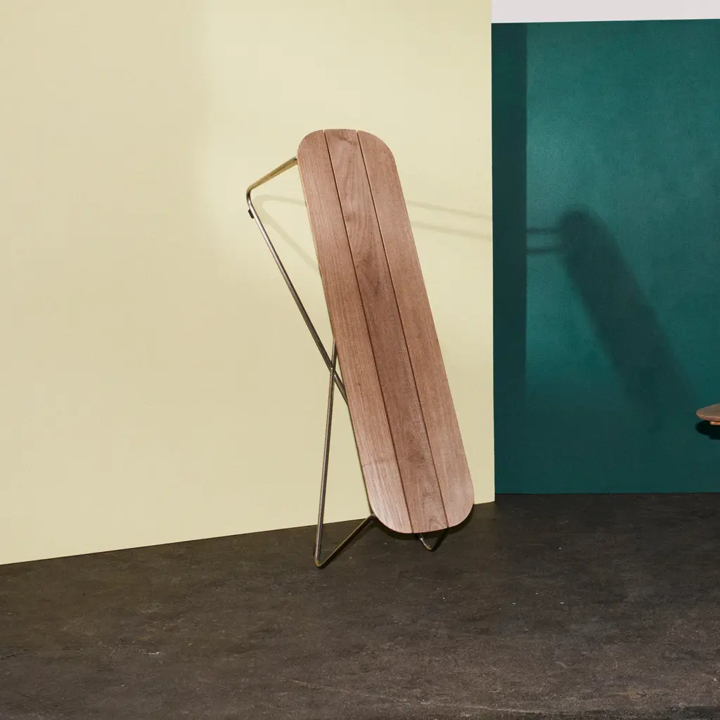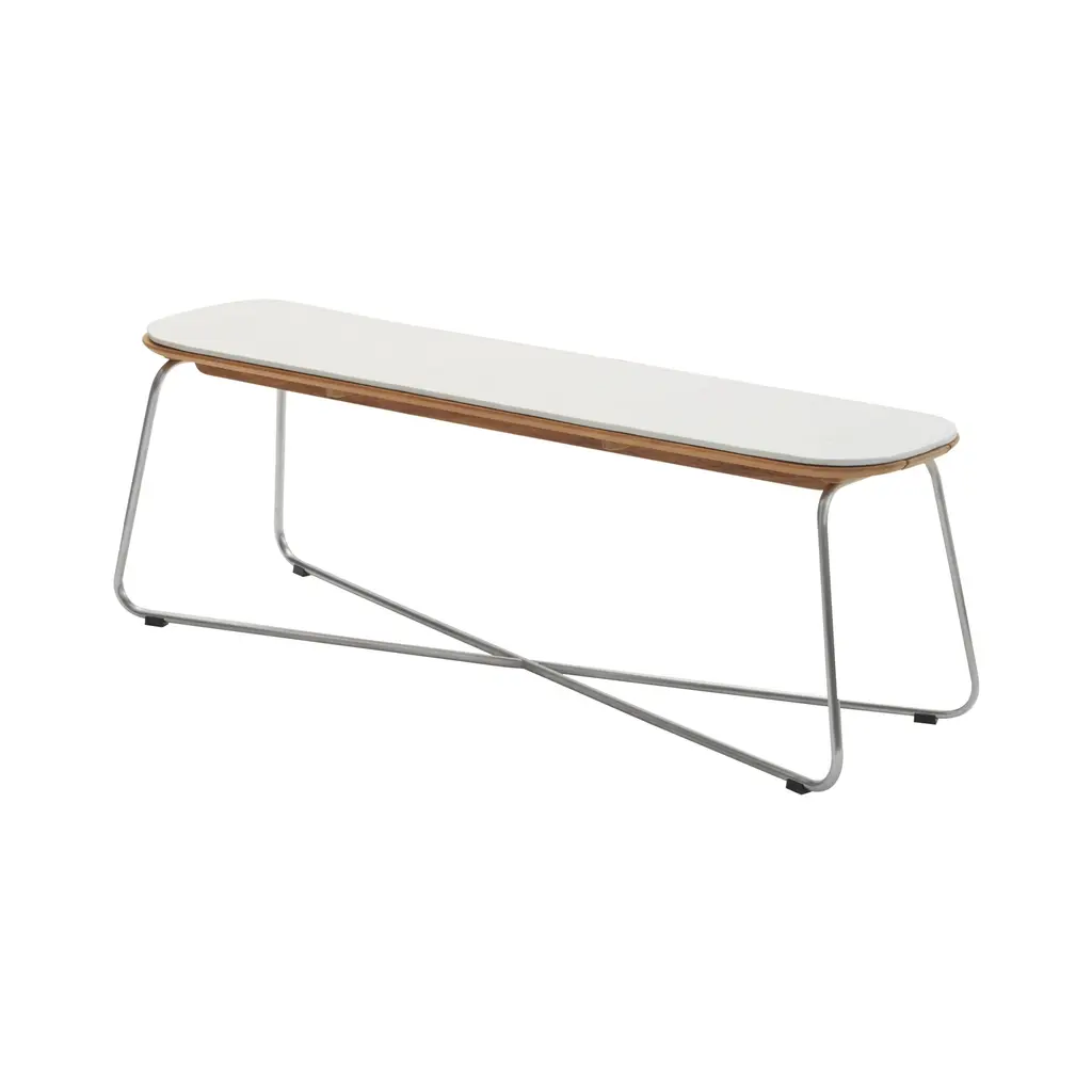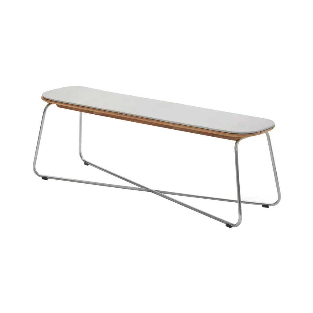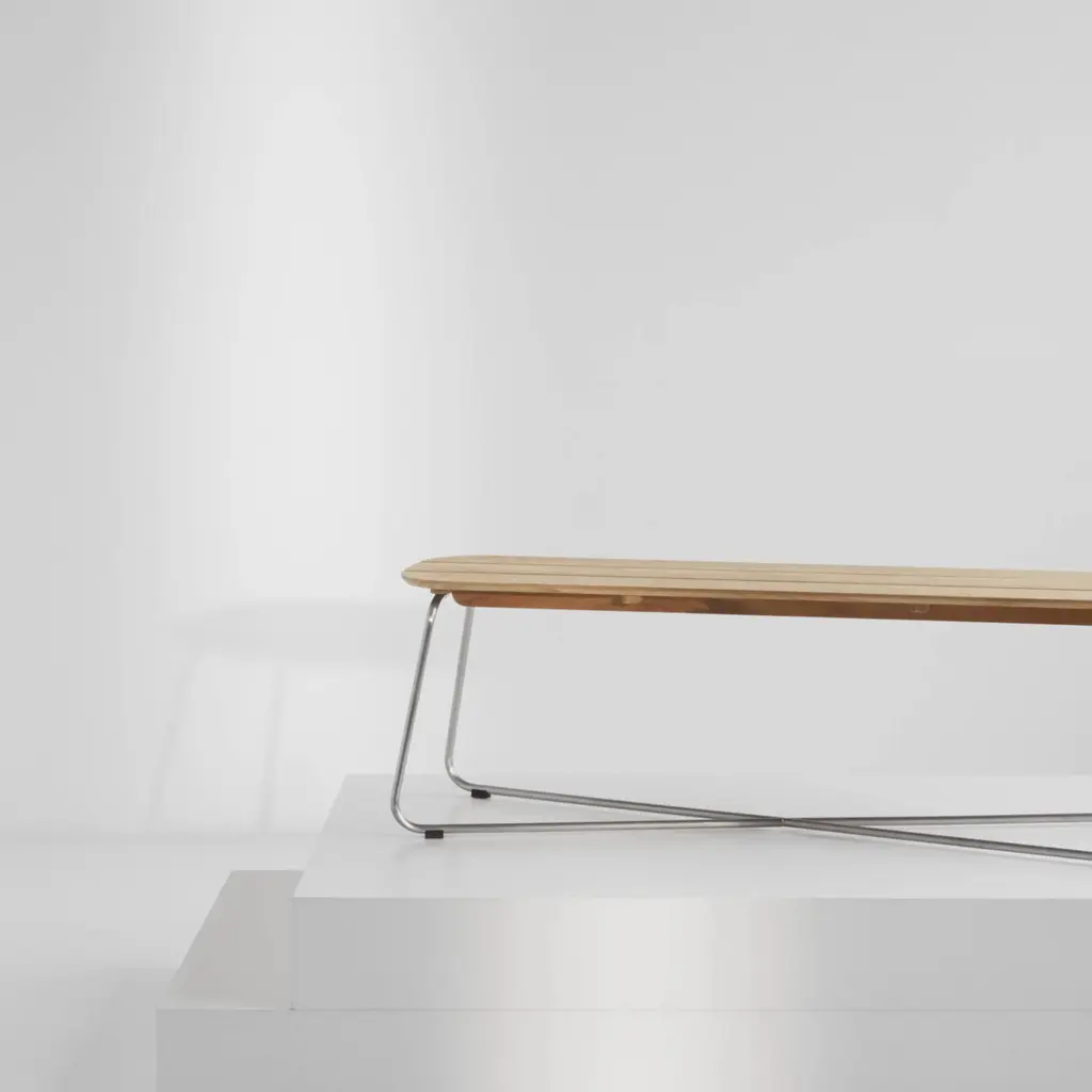 With its striking X-base, this bench has handsome possibilities not just as versatile seating but also as a smart lounge table. From Lilium—the first collection of outdoor furnishings designed by Danish-born Bjarke Ingels Group—the bench is both lightweight and sturdy, beautifully crafted in luxurious solid teak and stainless steel. Emphasizing the tabletop's long slender expanse, the wooden planks are placed lengthwise and graced with a gently curved edge.