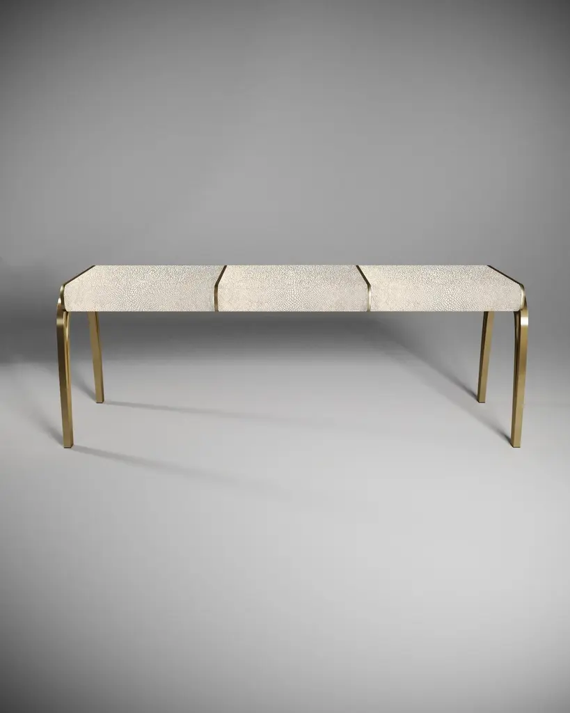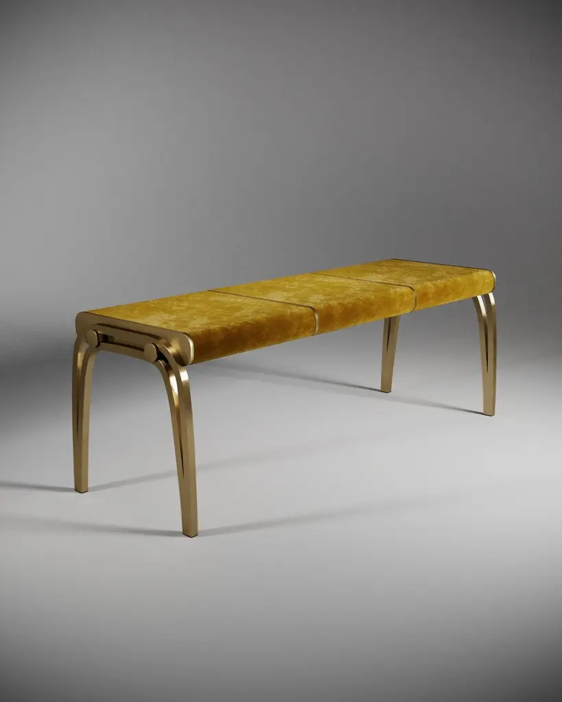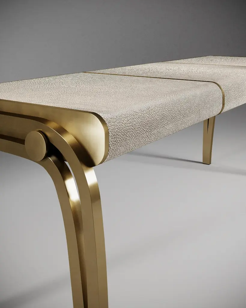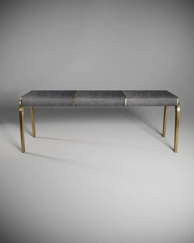 The Paris based label has distinguished themselves since their launch, with their iconic use of shagreen mixed with brass and other exotic materials. All furniture is handcrafted by skilled artisans, ultimately making each piece unique, designed in Paris and produced in the Philippines.The limited edition Victoria bench by R&Y Augousti is a sophisticated piece that provides comfort, whilst retaining its elegant and luxurious aesthetic. This piece is upholstered in a mustard-hue pierre frey velvet, with a bronze-patina brass frame. Available in other finishes and with shagreen inlay, see images at end of slide. This bench is a part of a 4-piece limited edition capsule collection by R&Y Augousti, see images at end of slide. The dimensions of this piece are 141 x 47 x 50 cm All R&Y Augousti pieces are handmade by artisans, ultimately making each piece unique. Wipe clean with soft dry cloth.Acclaimed design duo Ria & Yiouri Augousti have established themselves since the 1990s as pioneers of modern-vintage style through their luxurious Art Deco inspired collections.The Paris based label has distinguished themselves since their launch, with their iconic use of shagreen mixed with brass and other exotic materials. All furniture is handcrafted by skilled artisans, ultimately making each piece unique. All shagreen-covered items should be kept out of direct sunlight, color variants may occur on the stingray and other exotic finishes, but this showcases the Parisian label's commitment to creating authentic luxurious products using natural components.