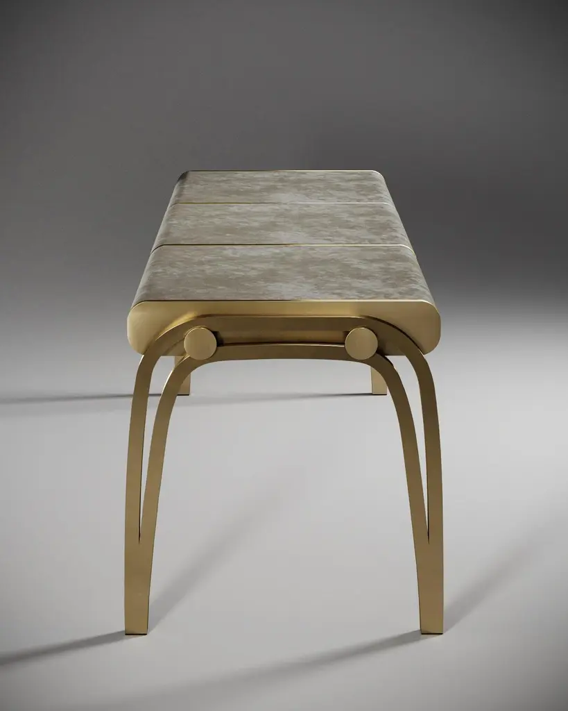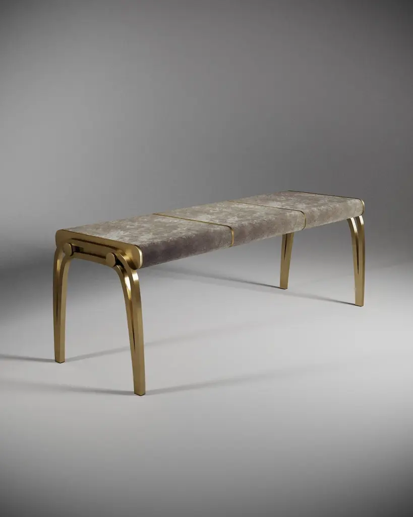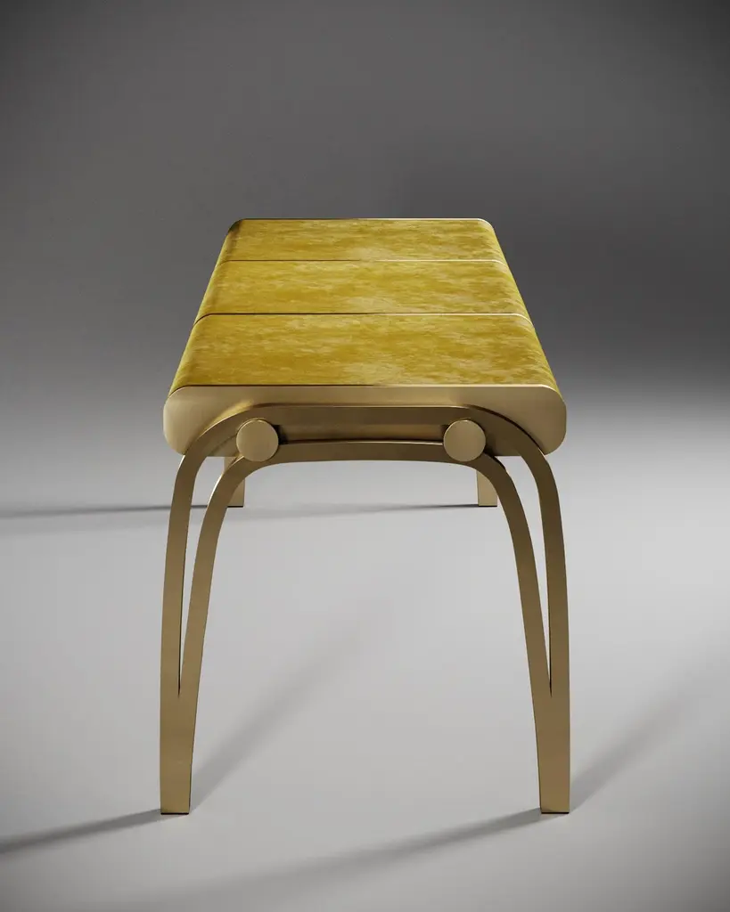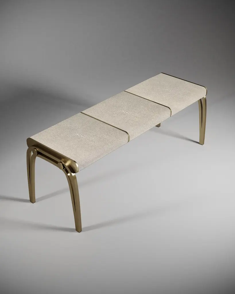 The Paris based label has distinguished themselves since their launch, with their iconic use of shagreen mixed with brass and other exotic materials. All furniture is handcrafted by skilled artisans, ultimately making each piece unique, designed in Paris and produced in the Philippines.The limited edition Victoria bench by R&Y Augousti is a sophisticated piece that provides comfort, whilst retaining its elegant and luxurious aesthetic. This piece is upholstered in a mustard-hue pierre frey velvet, with a bronze-patina brass frame. Available in other finishes and with shagreen inlay, see images at end of slide. This bench is a part of a 4-piece limited edition capsule collection by R&Y Augousti, see images at end of slide. The dimensions of this piece are 141 x 47 x 50 cm All R&Y Augousti pieces are handmade by artisans, ultimately making each piece unique. Wipe clean with soft dry cloth.Acclaimed design duo Ria & Yiouri Augousti have established themselves since the 1990s as pioneers of modern-vintage style through their luxurious Art Deco inspired collections.The Paris based label has distinguished themselves since their launch, with their iconic use of shagreen mixed with brass and other exotic materials. All furniture is handcrafted by skilled artisans, ultimately making each piece unique. All shagreen-covered items should be kept out of direct sunlight, color variants may occur on the stingray and other exotic finishes, but this showcases the Parisian label's commitment to creating authentic luxurious products using natural components.