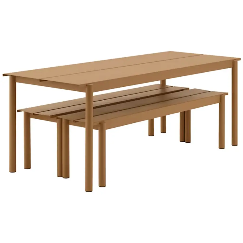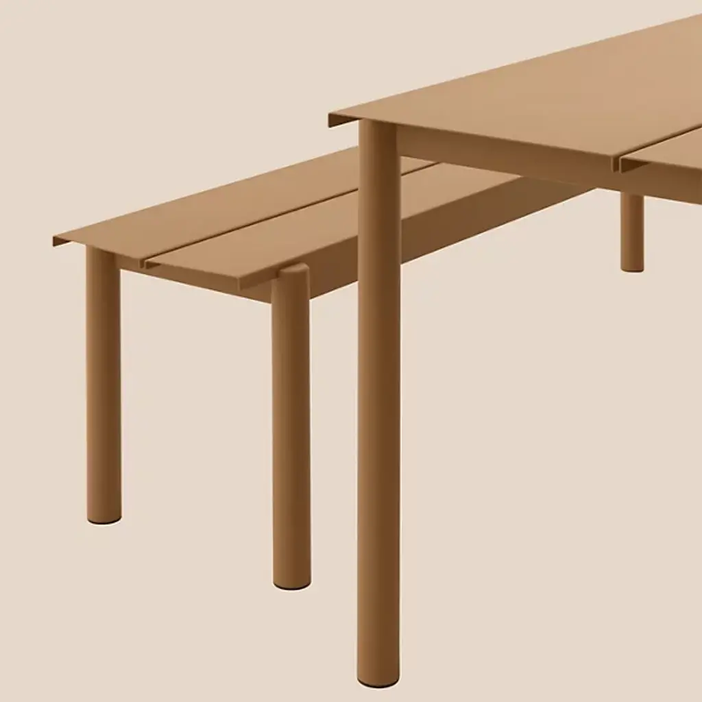 Add strong and stylish seating to outside spaces with the smooth and robust Linear Steel Bench from Muuto. The bench is a steel construction powder-coated with a matte texture, which adroitly blends cylindrical legs with flat planes of its support structure. A two-piece benchtop of steel brackets caps it off, spaced slightly to ensure water does not pool unpleasantly on its upper surface. Pair with the Linear Steel Table for an enduring and cohesive patio set.