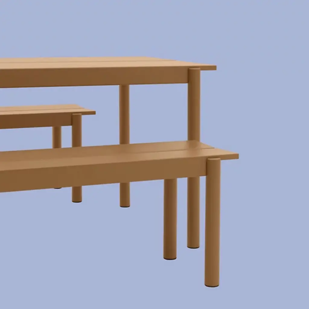 Add strong and stylish seating to outside spaces with the smooth and robust Linear Steel Bench from Muuto. The bench is a steel construction powder-coated with a matte texture, which adroitly blends cylindrical legs with flat planes of its support structure. A two-piece benchtop of steel brackets caps it off, spaced slightly to ensure water does not pool unpleasantly on its upper surface. Pair with the Linear Steel Table for an enduring and cohesive patio set.