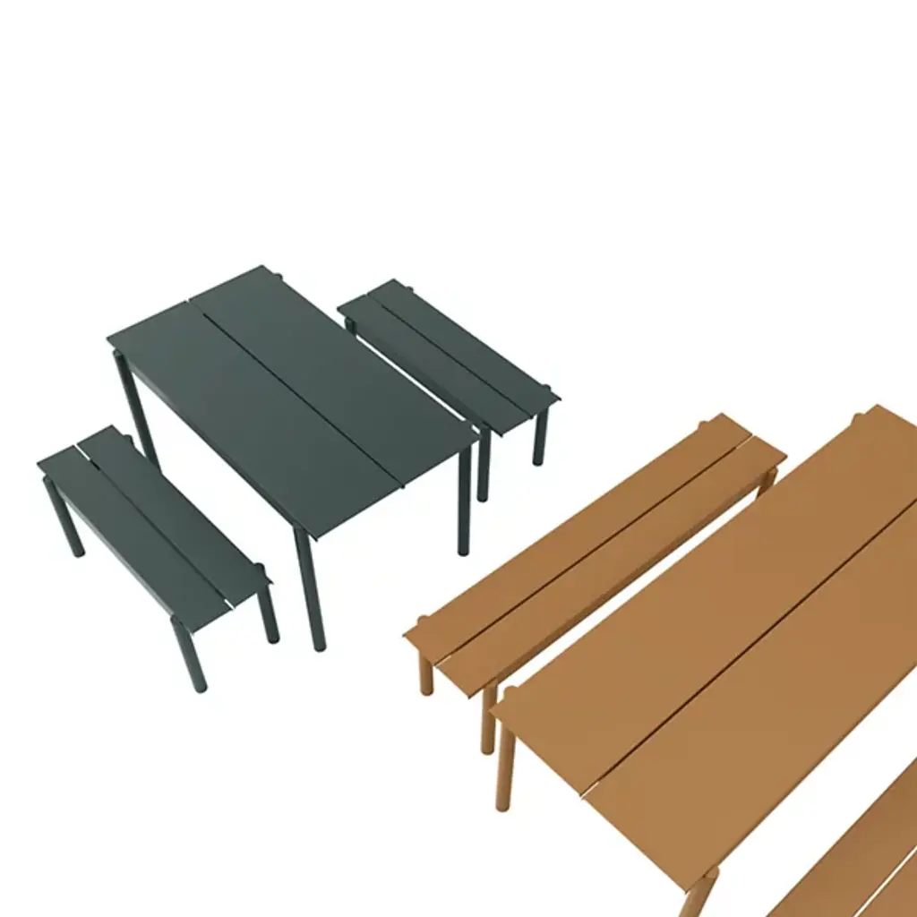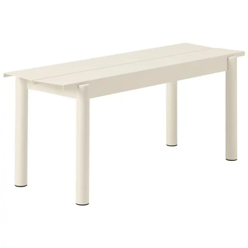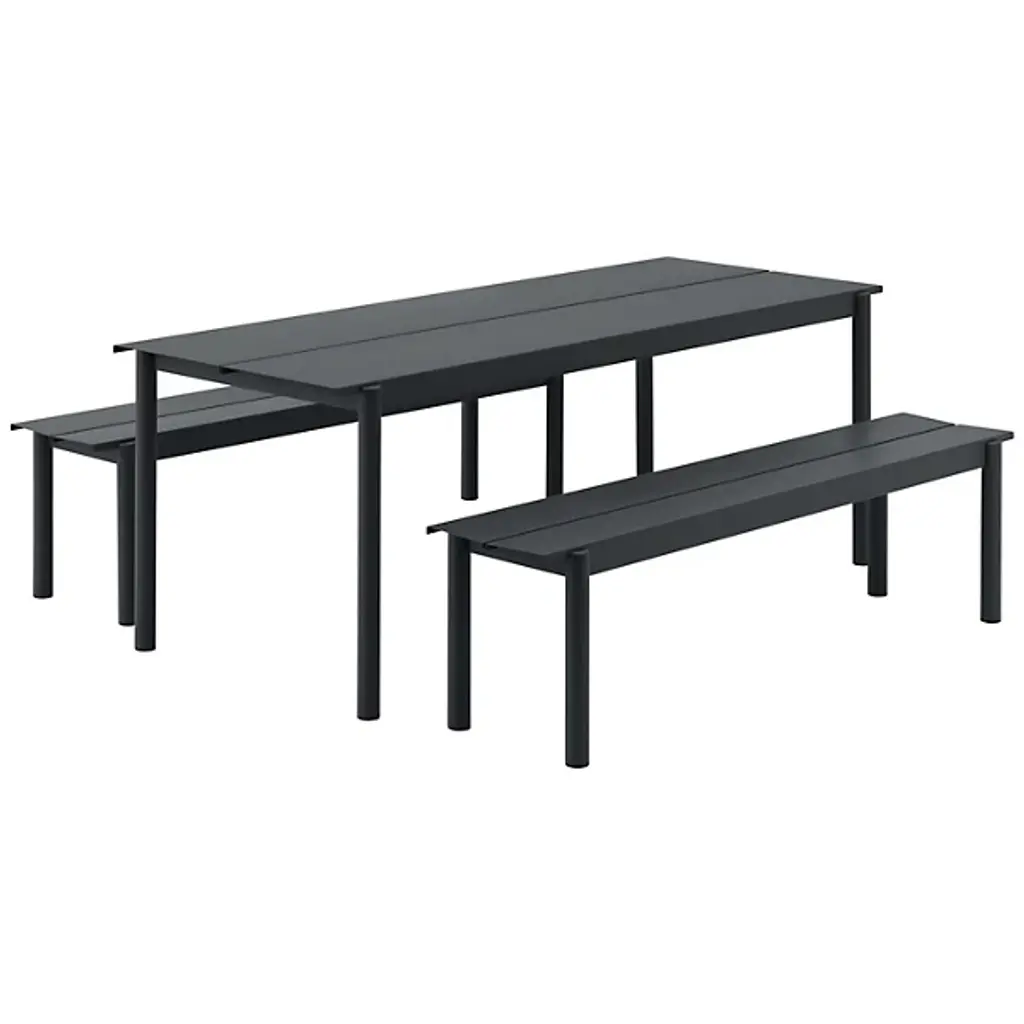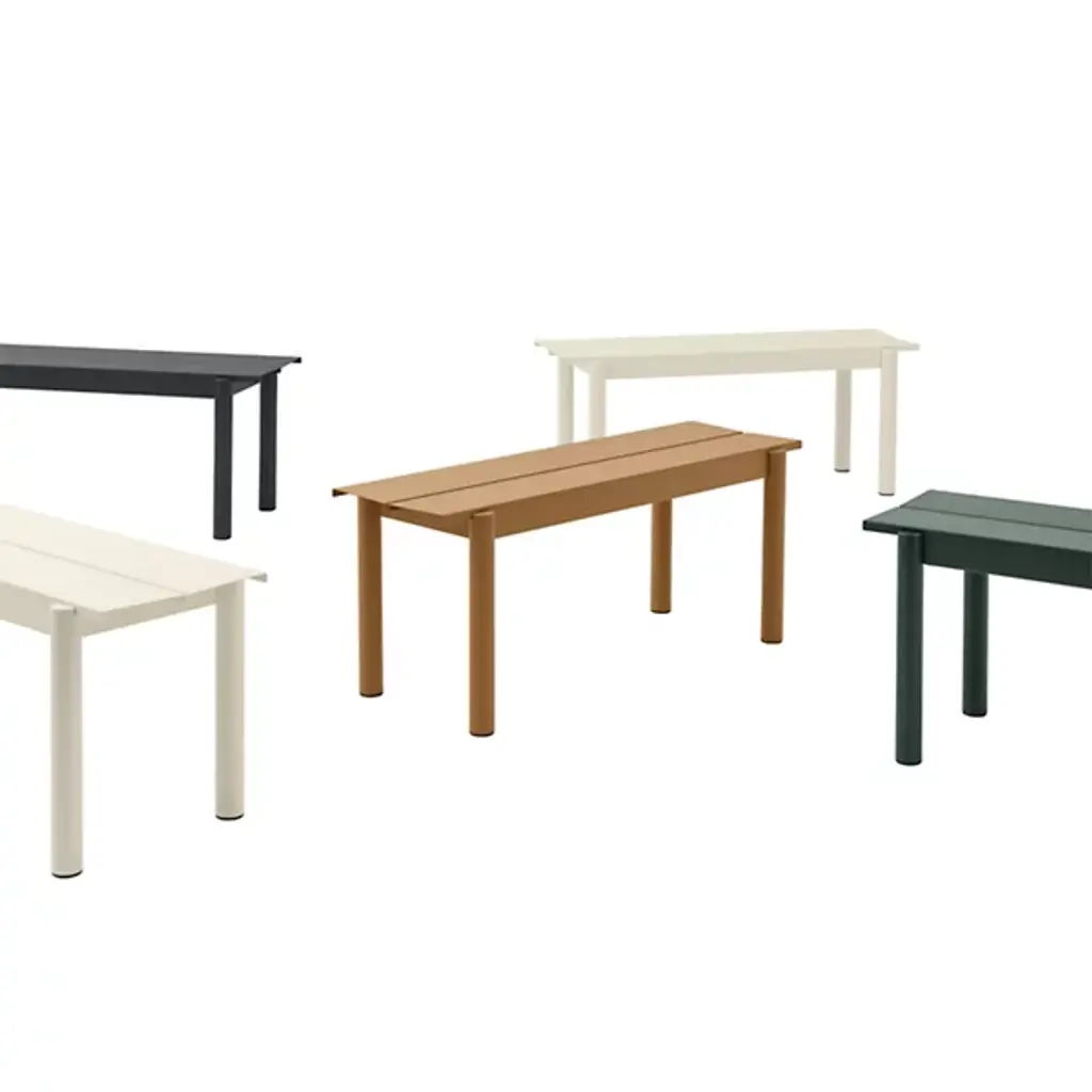 Add strong and stylish seating to outside spaces with the smooth and robust Linear Steel Bench from Muuto. The bench is a steel construction powder-coated with a matte texture, which adroitly blends cylindrical legs with flat planes of its support structure. A two-piece benchtop of steel brackets caps it off, spaced slightly to ensure water does not pool unpleasantly on its upper surface. Pair with the Linear Steel Table for an enduring and cohesive patio set.