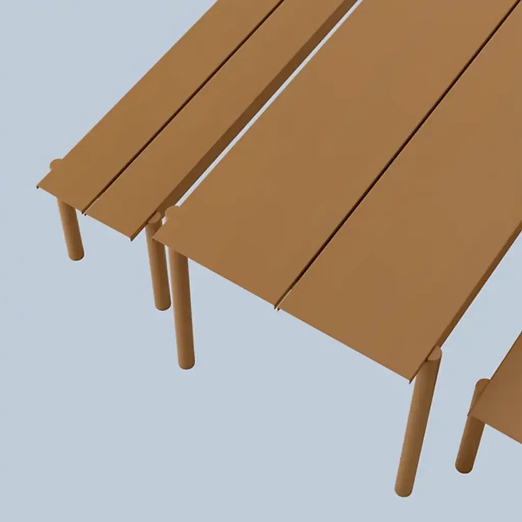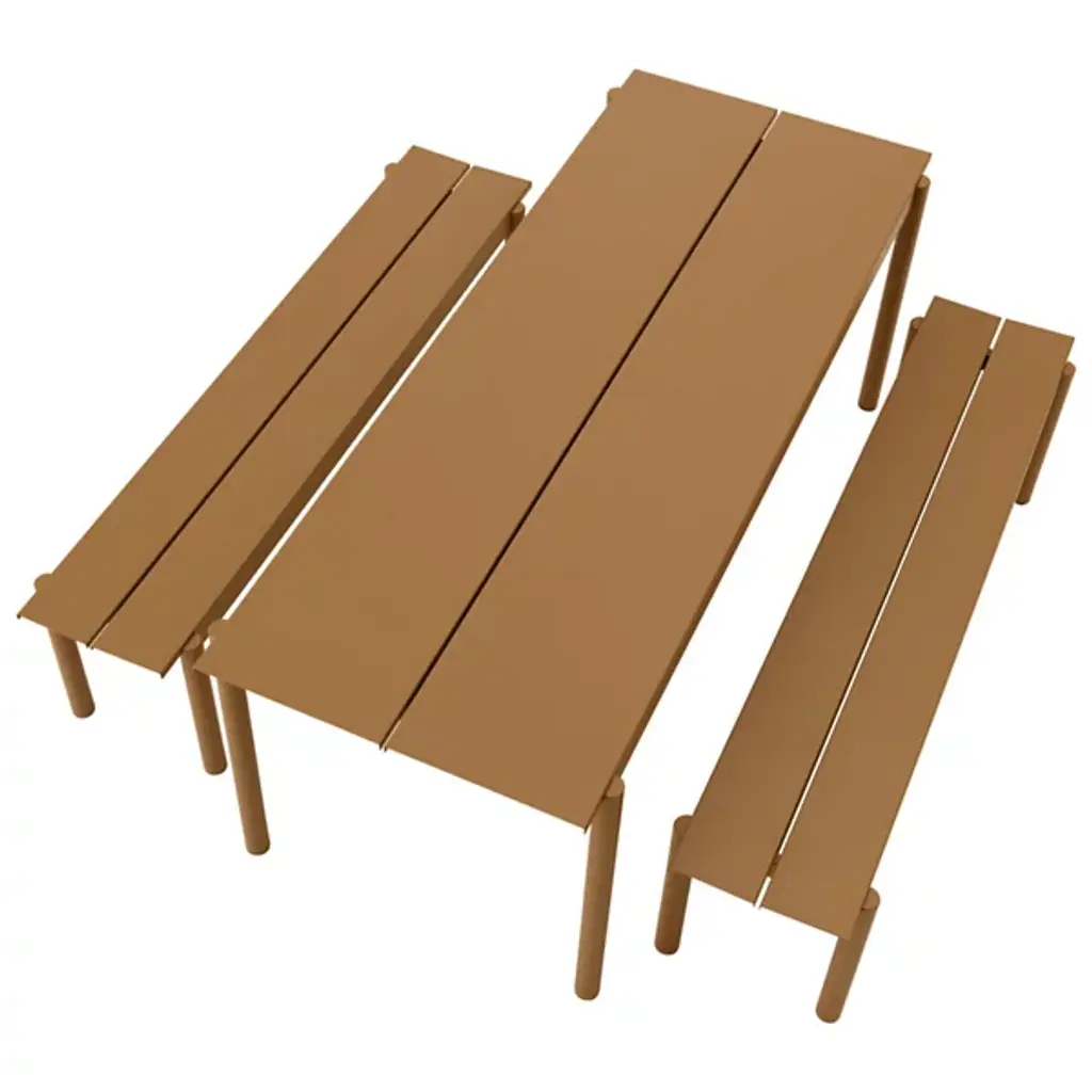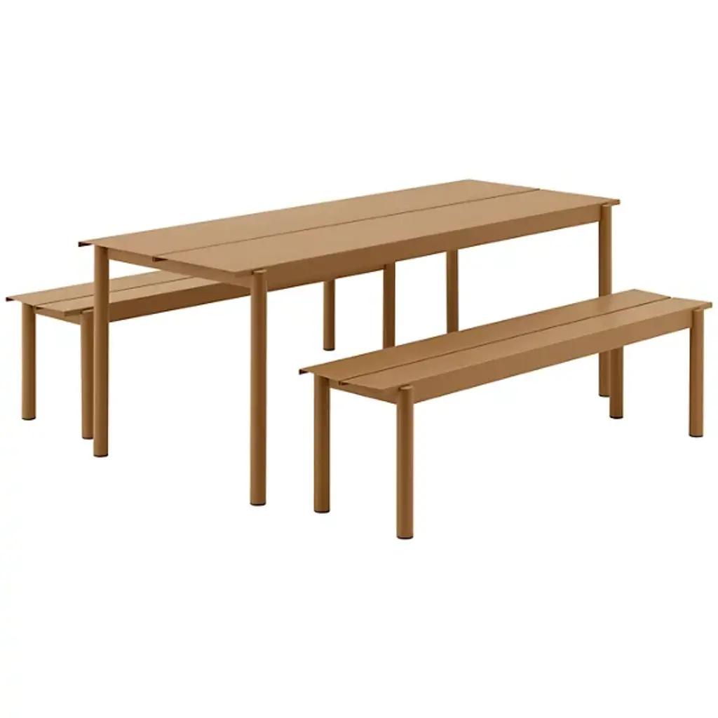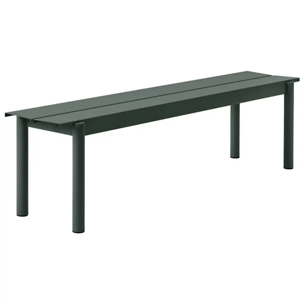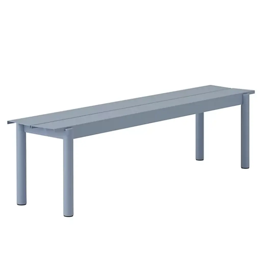 Add strong and stylish seating to outside spaces with the smooth and robust Linear Steel Bench from Muuto. The bench is a steel construction powder-coated with a matte texture, which adroitly blends cylindrical legs with flat planes of its support structure. A two-piece benchtop of steel brackets caps it off, spaced slightly to ensure water does not pool unpleasantly on its upper surface. Pair with the Linear Steel Table for an enduring and cohesive patio set.