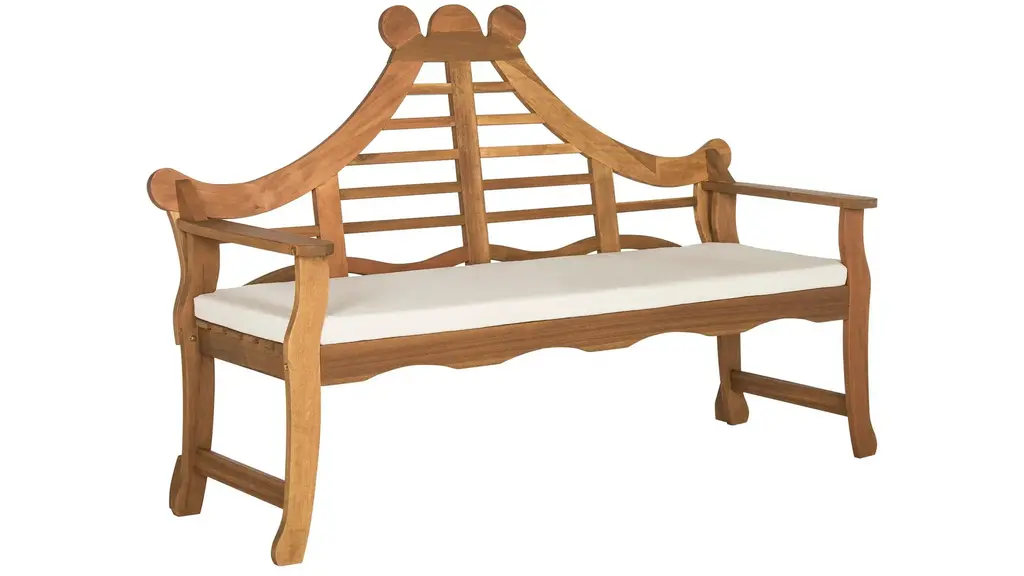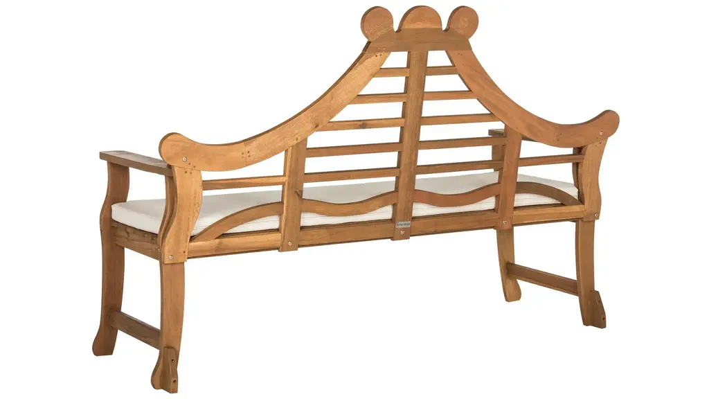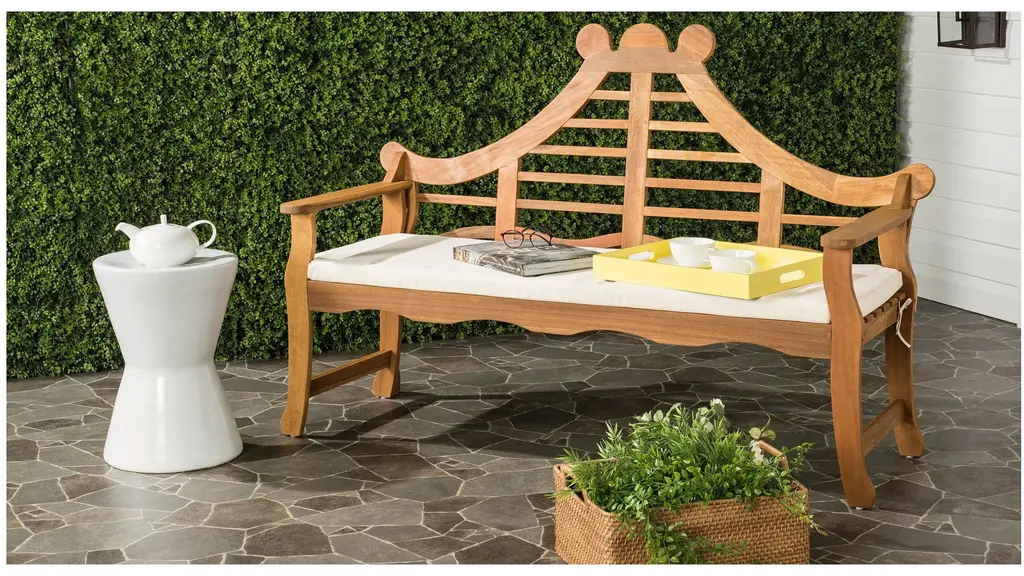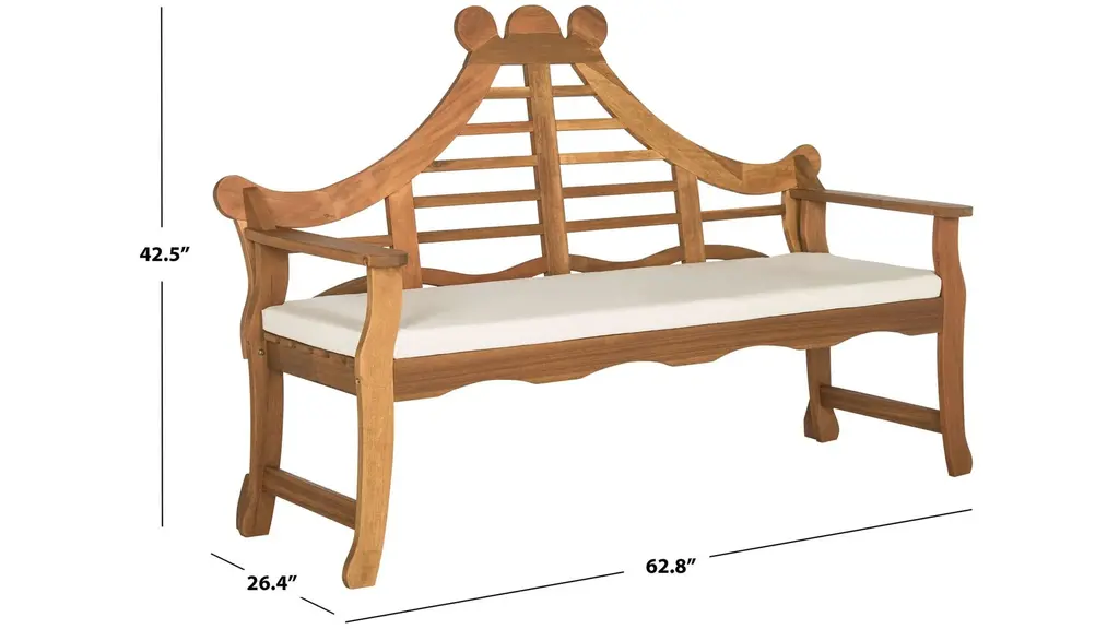 Inspired by Asia's majestic outdoor gardens, the exotic style of this bench is at home in traditional or classic outdoor decor. Its ornately carved details with rich natural finish and plush beige cushion make it a modern heirloom.