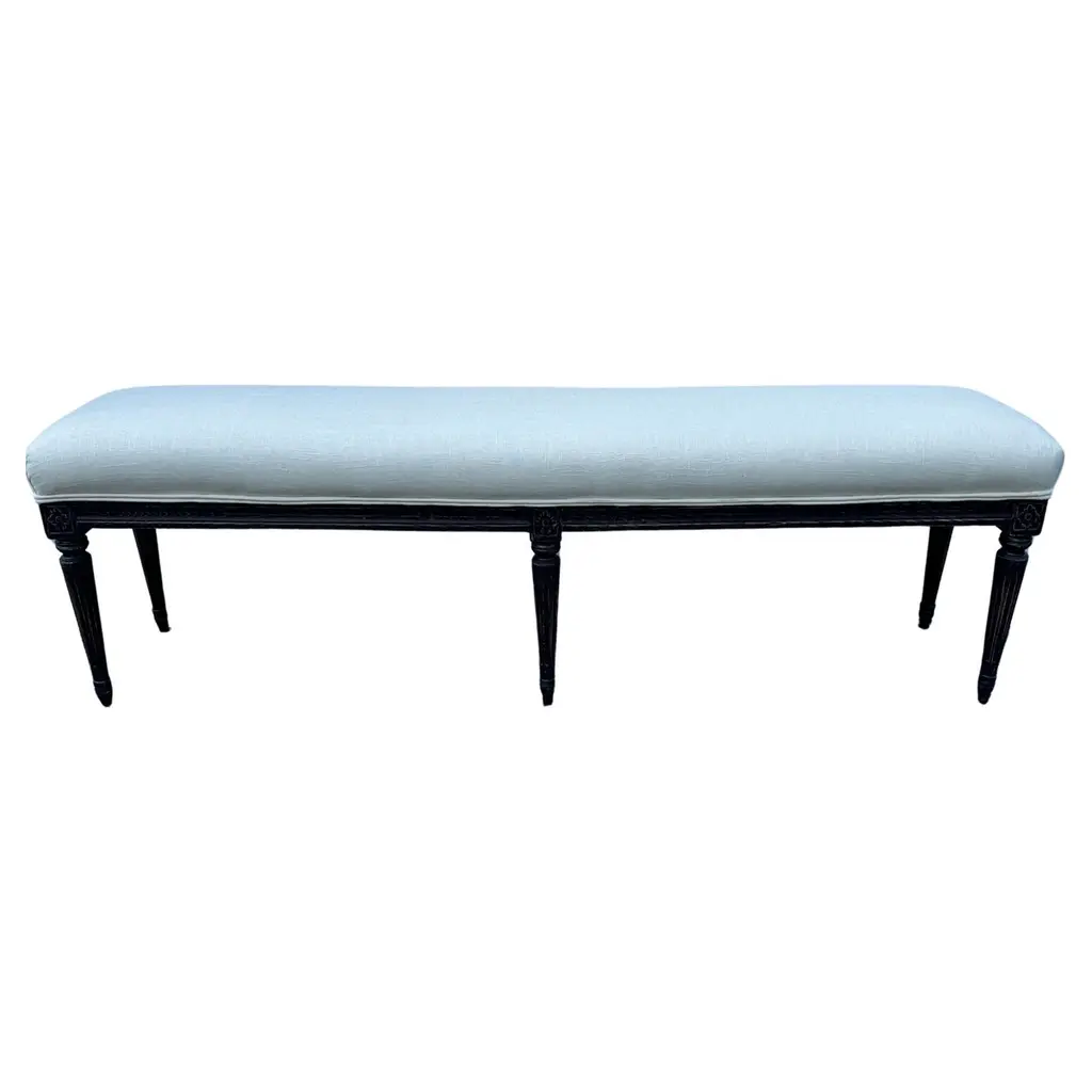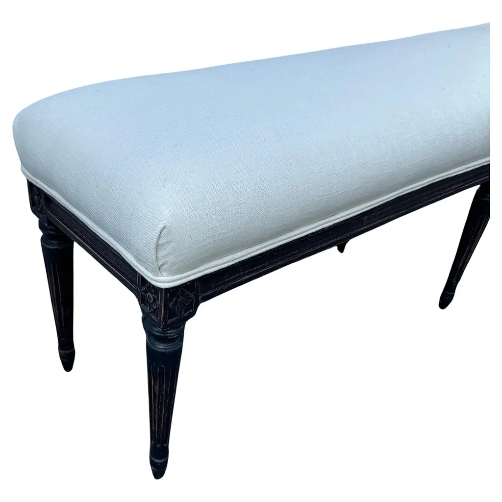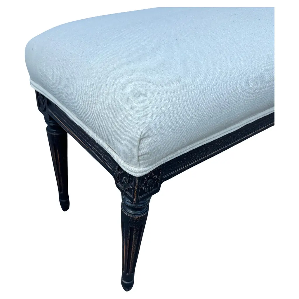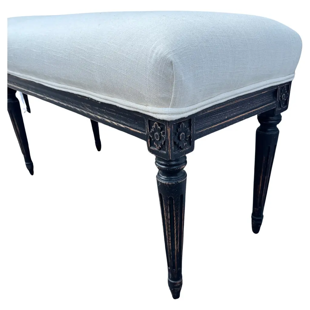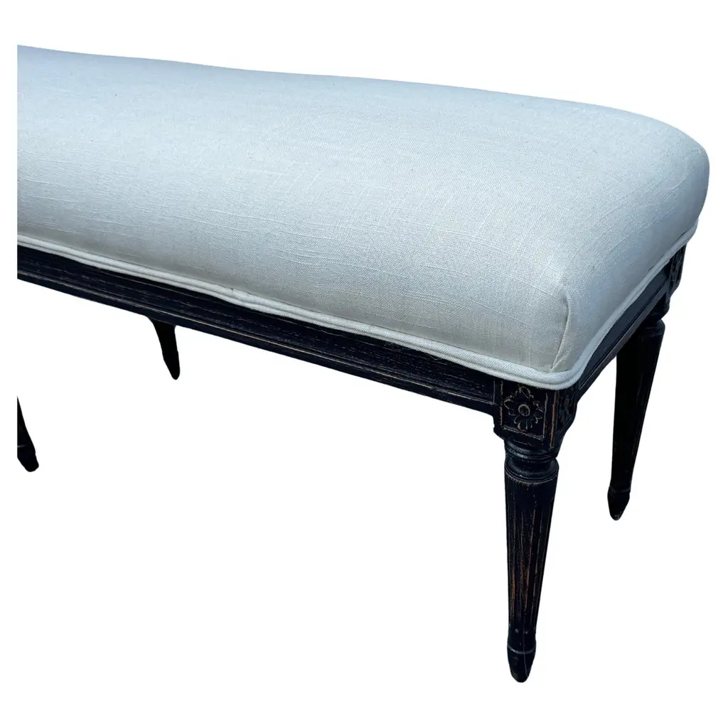 Hand-carved and hand-painted, this 18th Century Gustavian inspired bench from Chelsea Textile features a linen seat on rosette medallion corners, atop tapered fluted legs. The seat has been recently reupholstered in a neural off white linen fabric. A classic minimalist piece that marries elegance with comfort and epitomizes the timelessness of Swedish Gustavian furniture.