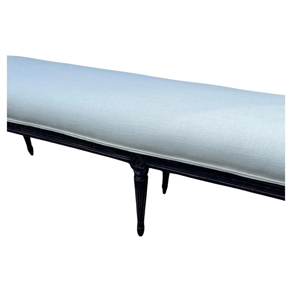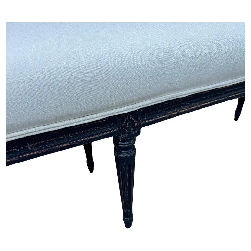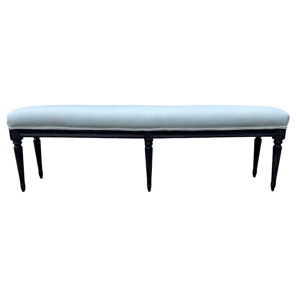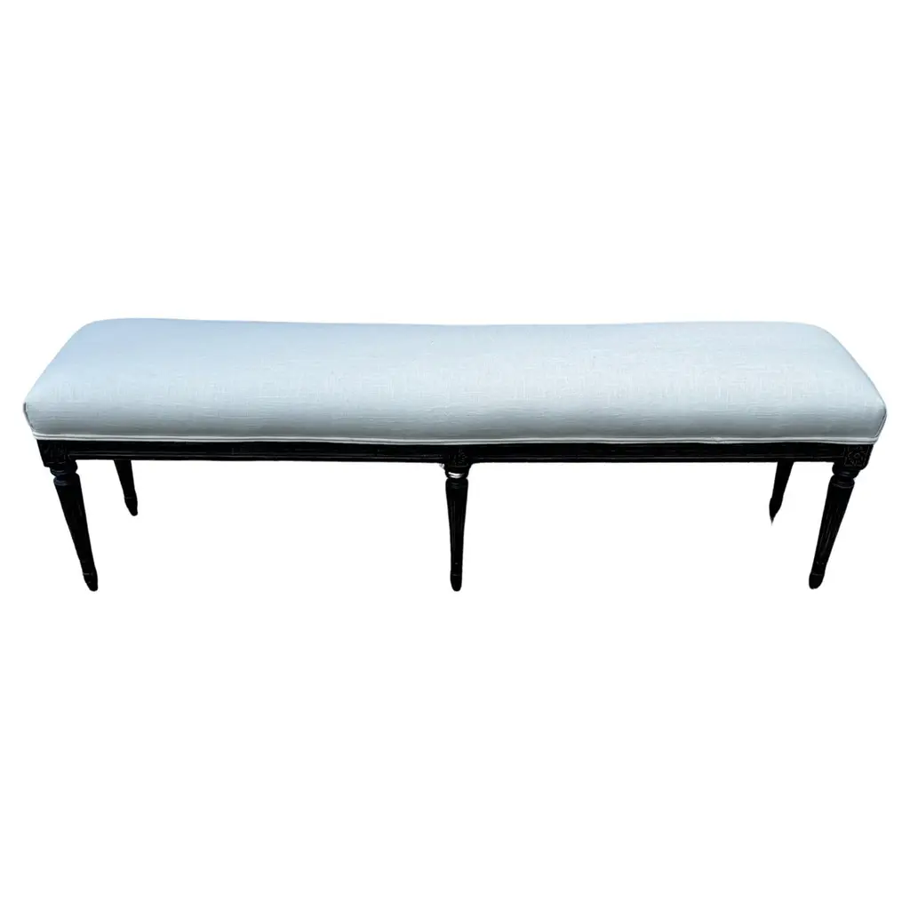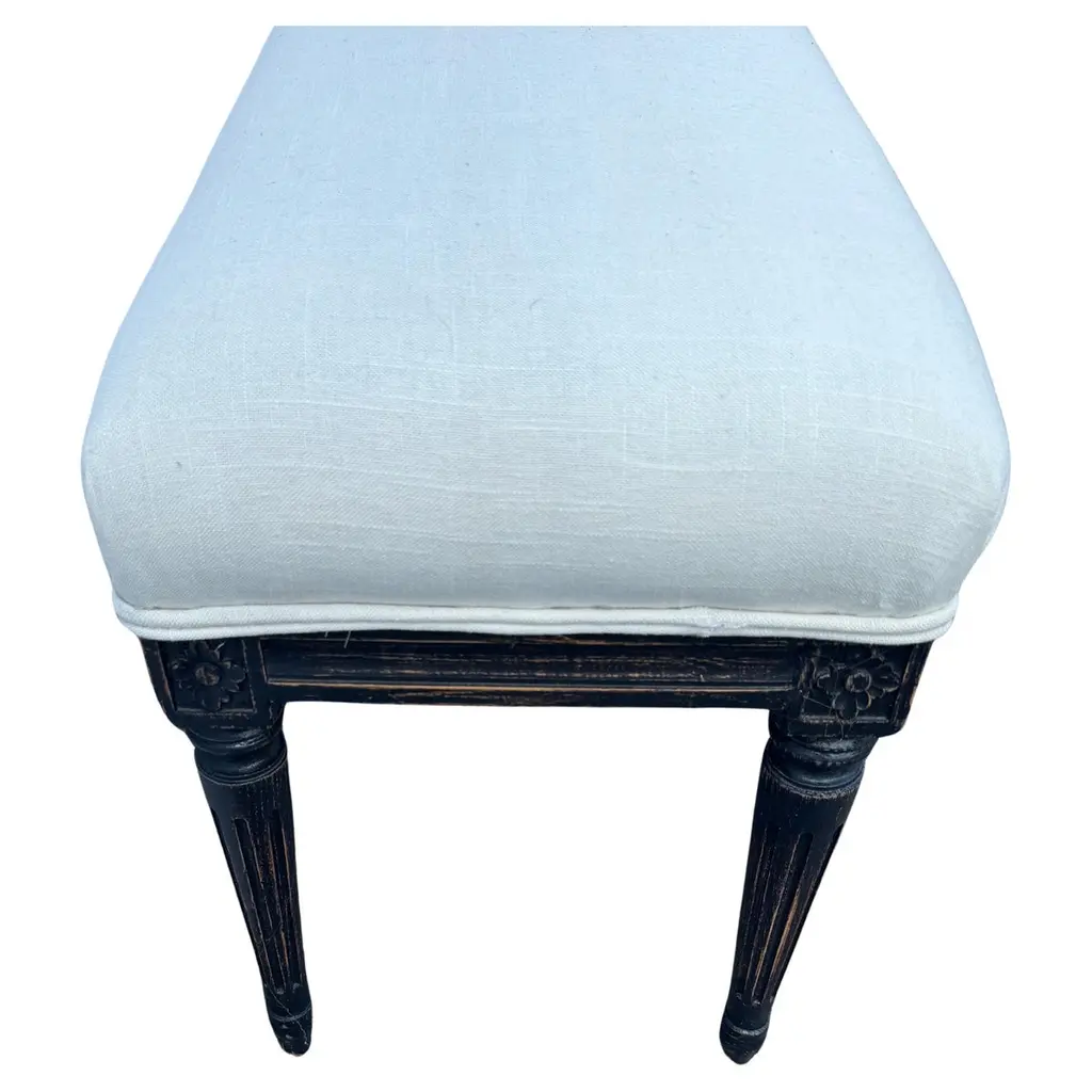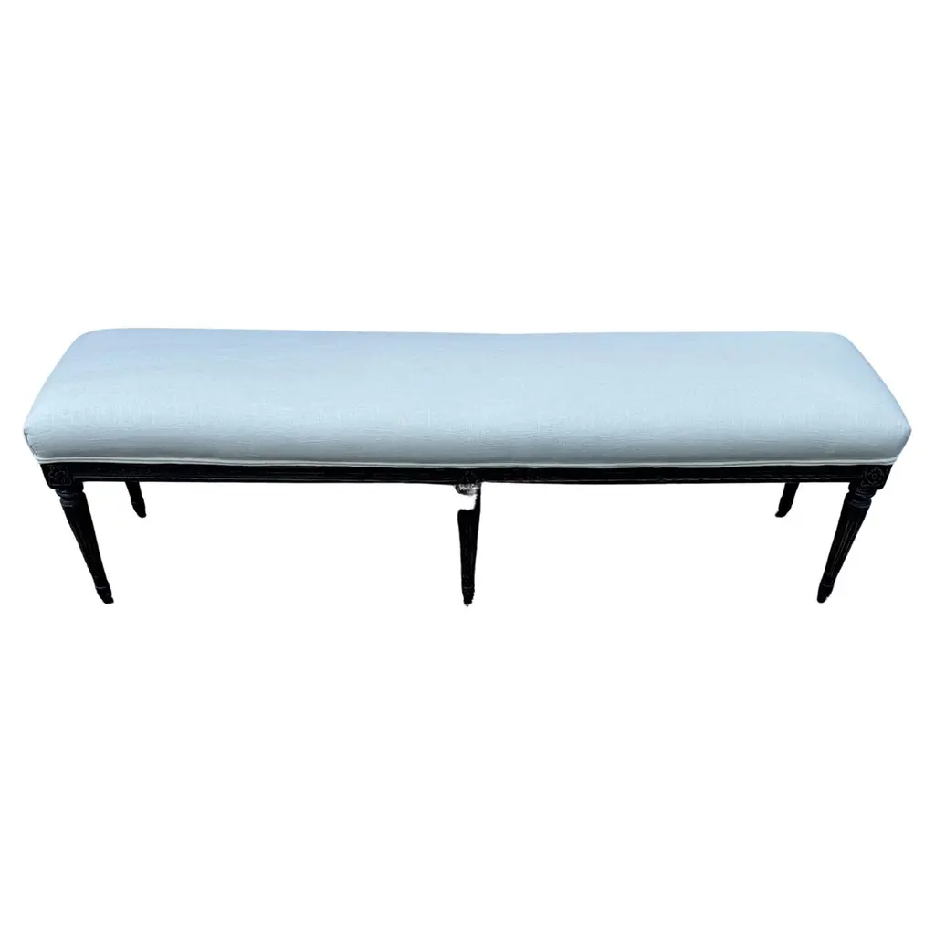 Hand-carved and hand-painted, this 18th Century Gustavian inspired bench from Chelsea Textile features a linen seat on rosette medallion corners, atop tapered fluted legs. The seat has been recently reupholstered in a neural off white linen fabric. A classic minimalist piece that marries elegance with comfort and epitomizes the timelessness of Swedish Gustavian furniture.