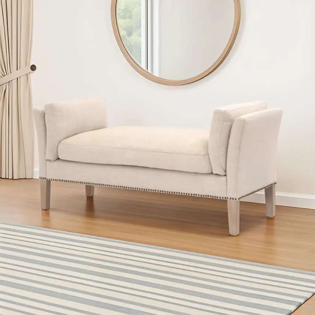 We love this beautifully designed bench and how it brings vintage style to any room in your home. The bench has a sturdy wooden frame with tapered legs and is upholstered in a soft, durable fabric. The button-tufted design adds a touch of sophistication, and the foam-padded seat provides maximum comfort. The bench is available in a variety of colors, so you can choose the one that best matches your decor. Whether you use it as extra seating in your living room or as an accent in your bedroom, this bench is sure to make a statement.