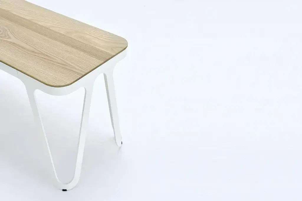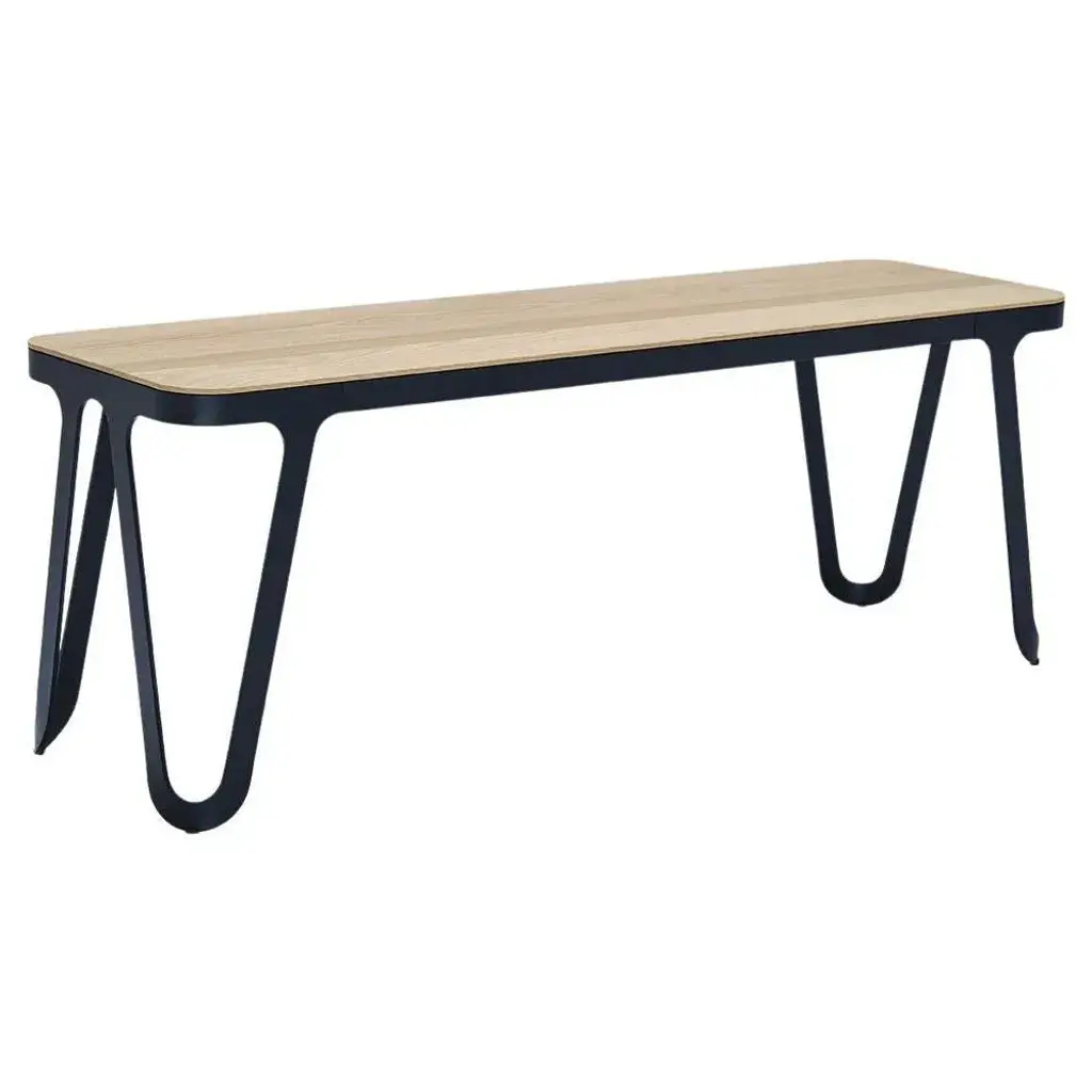 Loop bench 160 Ash by Sebastian Scherer Material: Aluminium, Ash Dimensions: D160x W38 x H45 cm. Weight: 20.4 kg The Loop series is characterized by its elegant and futuristic design language. The soft, yet geometric lines have a Scandinavian design reference, but also reminiscent of metal furniture of the Bauhaus era. All furniture in the series follow the same design principle. The only 6 mm thin aluminum frame is cut from a metal sheet and then bent. This gives it its stability and forms its characteristic, loop-like silhouette. This consistent design principle and craftsmanship make the Loop series so unique. Small embedded plastic gliders are discreetly integrated in the frame without disturbing the overall impression. This piece is attributed to the mentioned designer/maker. It has no attribution mark and no official proof of authenticity, however it is well documented in design history. I take full responsibility for any authenticity issues arising from misattribution