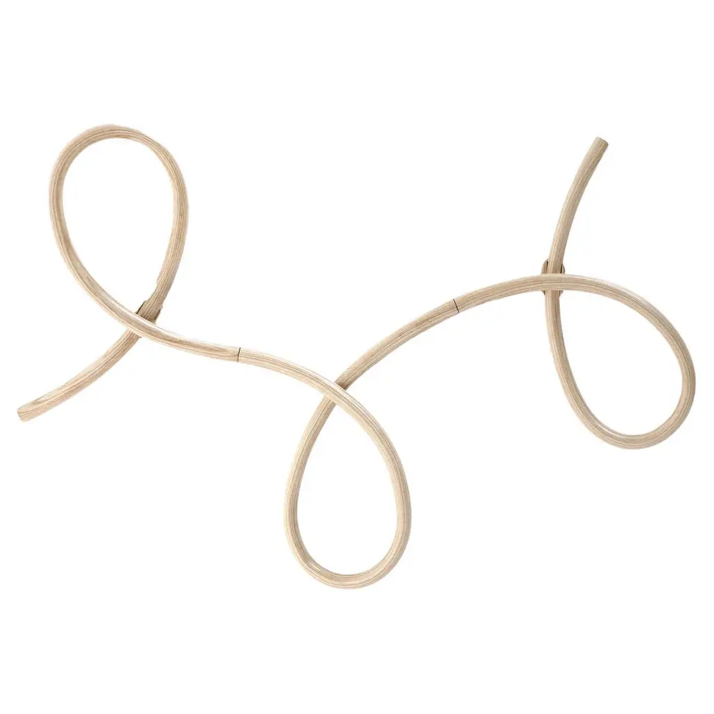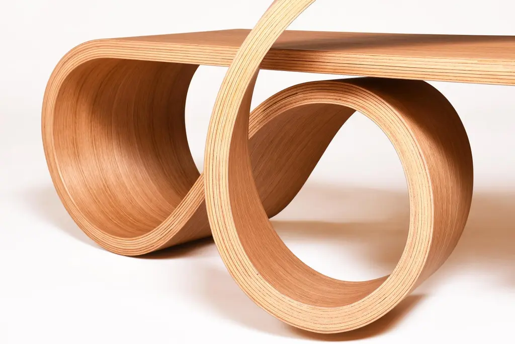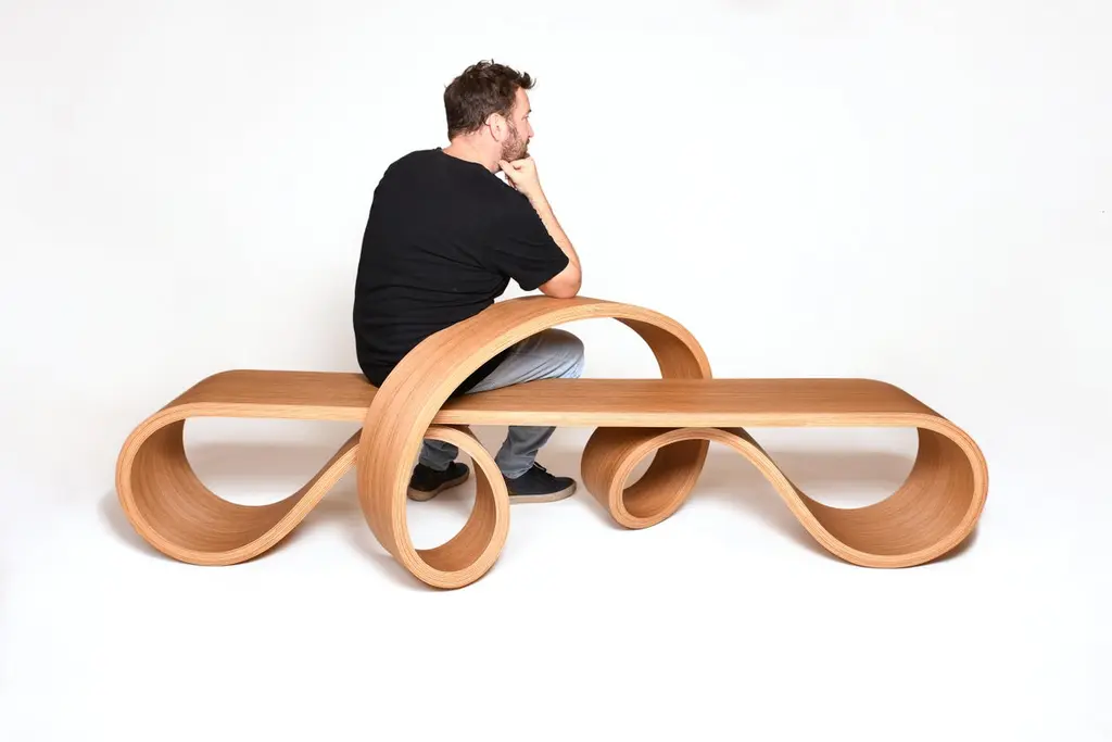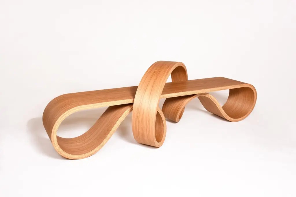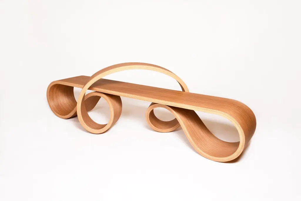 This bench has a very unique design, it's the result of many years of research on the technique of bent lamination. I created it in 2022 for a corporate customer, it was a part of four different benches for a building loby. If you look closely you will see that there is no join in this piece, it's a perfect loop! The one showed on the pictures is made with white Oak rift cut veneer with an oil finish. It can also be finished with lacqer, that would make it looks a bit lighter.