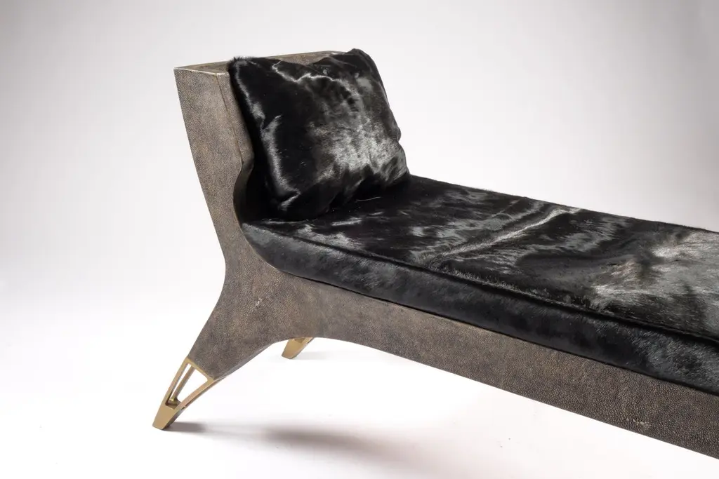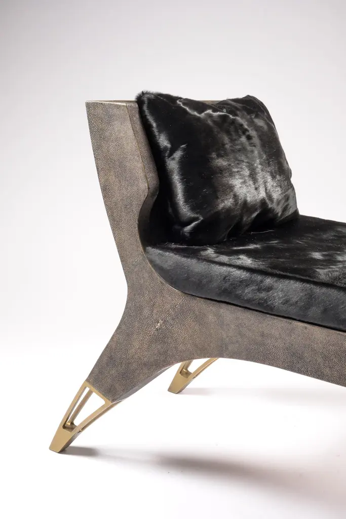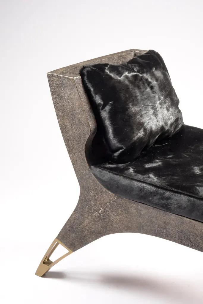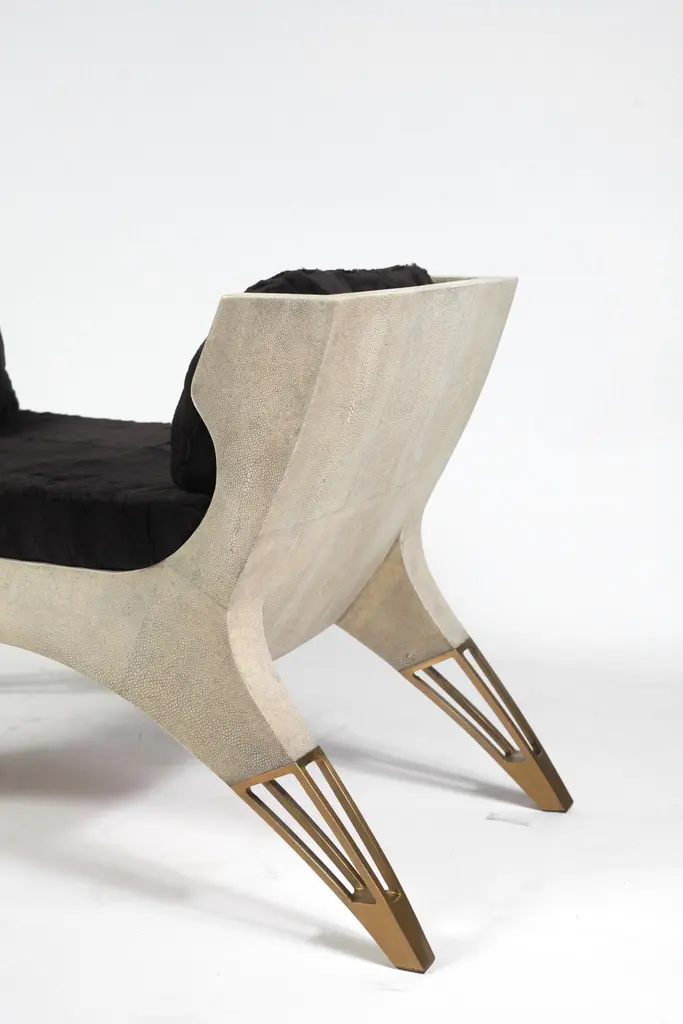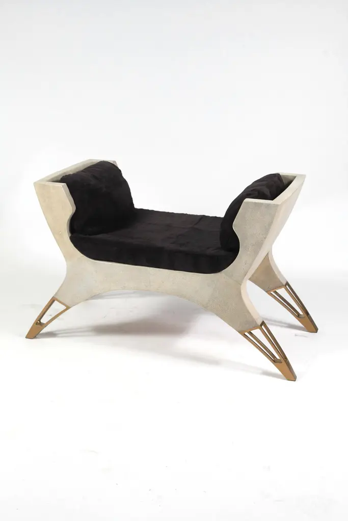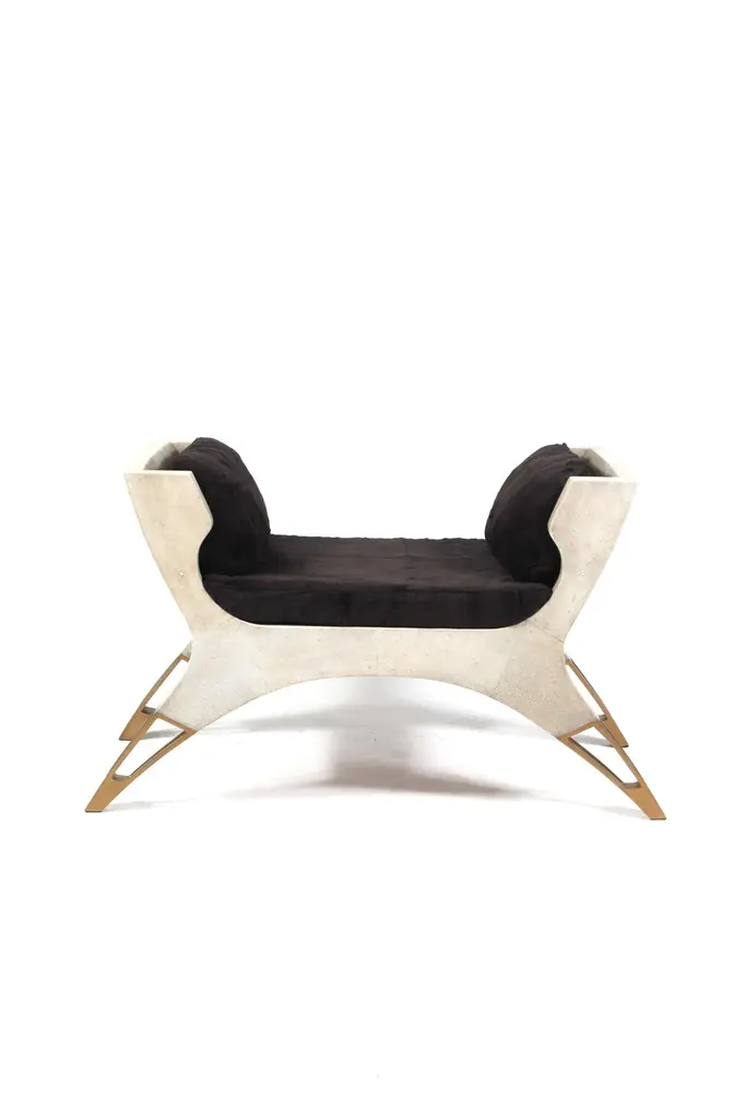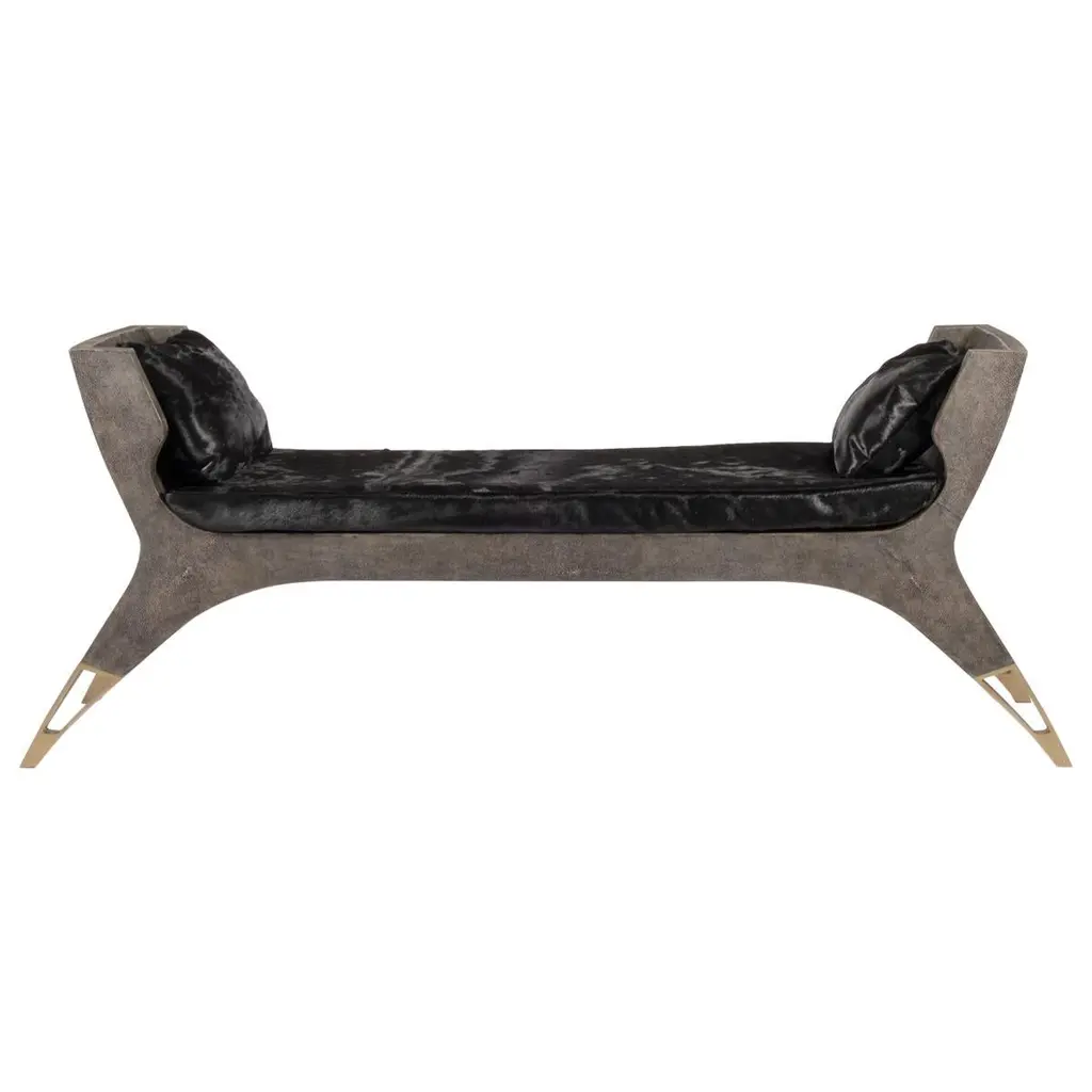 The Paris based label has distinguished themselves since their launch, with their iconic use of shagreen mixed with brass and other exotic materials. All furniture is handcrafted by skilled artisans, ultimately making each piece unique, designed in Paris and produced in the Philippines.The Lord bench is an invitation to as the French would say, “rêveries”. The cream shagreen adds as touch of elegant drama. The perfect piece for a dressing room, entrance or living room. The soft cushions in cream horse hair are the final touch of luxury. The cushions are removable. The legs have discrete bronze patina brass detailing. A black version is also available and a small love seat version is also available, images at end of slide. The finish of the shagreen is authentic as it is hand-dyed and the designer calls the finish look: "antique black shagreen."The dimensions of this piece are 194 x 48 x 78 cm / 52.25" x 15.75" x 28.75"All R&Y Augousti pieces are handmade by artisans, ultimately making each piece unique. Wipe clean with soft dry cloth.Acclaimed design duo Ria & Yiouri Augousti have established themselves since the 1990s as pioneers of modern-vintage style through their luxurious Art Deco inspired collections.The Paris based label has distinguished themselves since their launch, with their iconic use of shagreen mixed with brass and other exotic materials. All furniture is handcrafted by skilled artisans, ultimately making each piece unique. All shagreen-covered items should be kept out of direct sunlight, color variants may occur on the stingray and other exotic finishes, but this showcases the Parisian label's commitment to creating authentic luxurious products using natural components.