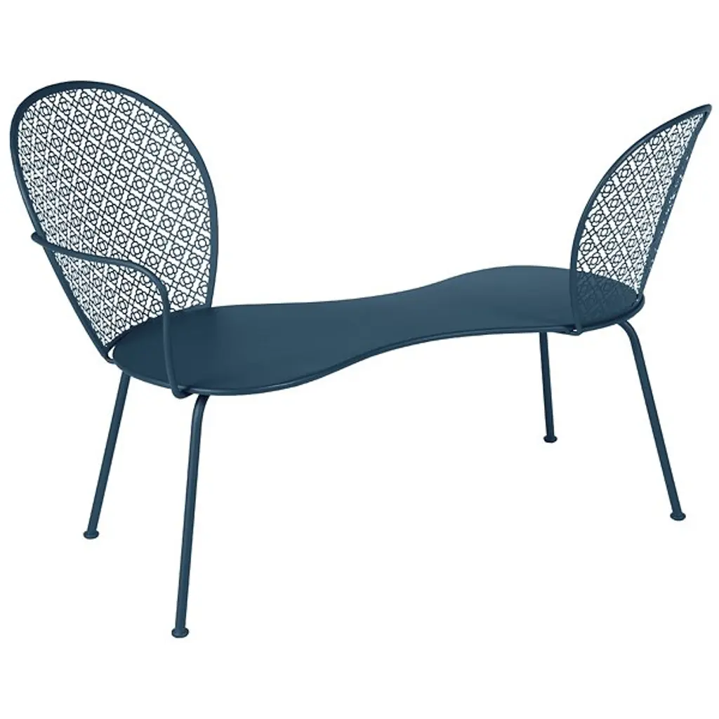The stylish way to share your secrets. The Lorette Conversation Bench by Fermob is a modern design inspired by the tete-a-tetes, or courting benches, first made popular in the Victorian era. This generally minimalist bench pays decorative tribute to ornate furnishings of olde with its intricate, perforated floral pattern made of laser-cut steel sheet. The seat is a curvy panel of steel sheet, supported by a tubular steel frame. One side has a slender steel rod arm, an intentionally asymmetrical touch by designer Frederic Sofia.