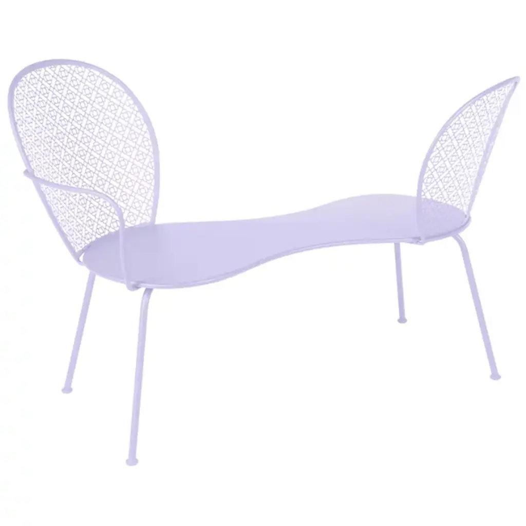 The stylish way to share your secrets. The Lorette Conversation Bench by Fermob is a modern design inspired by the tete-a-tetes, or courting benches, first made popular in the Victorian era. This generally minimalist bench pays decorative tribute to ornate furnishings of olde with its intricate, perforated floral pattern made of laser-cut steel sheet. The seat is a curvy panel of steel sheet, supported by a tubular steel frame. One side has a slender steel rod arm, an intentionally asymmetrical touch by designer Frederic Sofia.