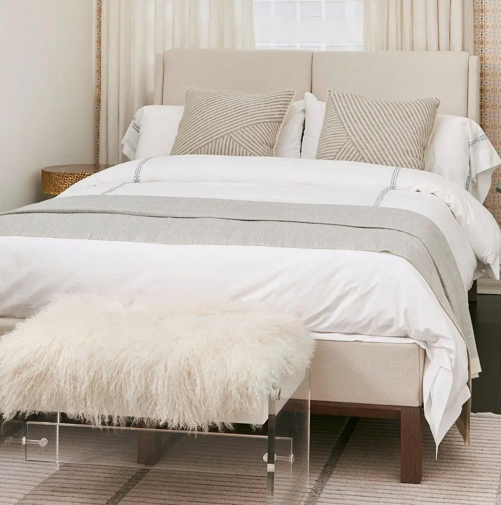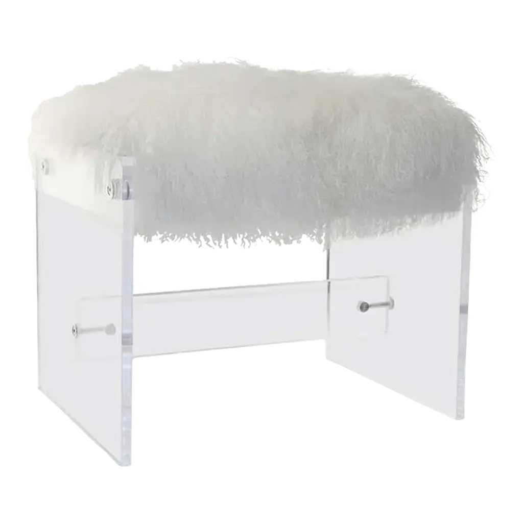 An eye catching bench made with an upholstered seat floating on a Lucite base, affixed with custom engineered hardware. Custom sizes and finishes available.