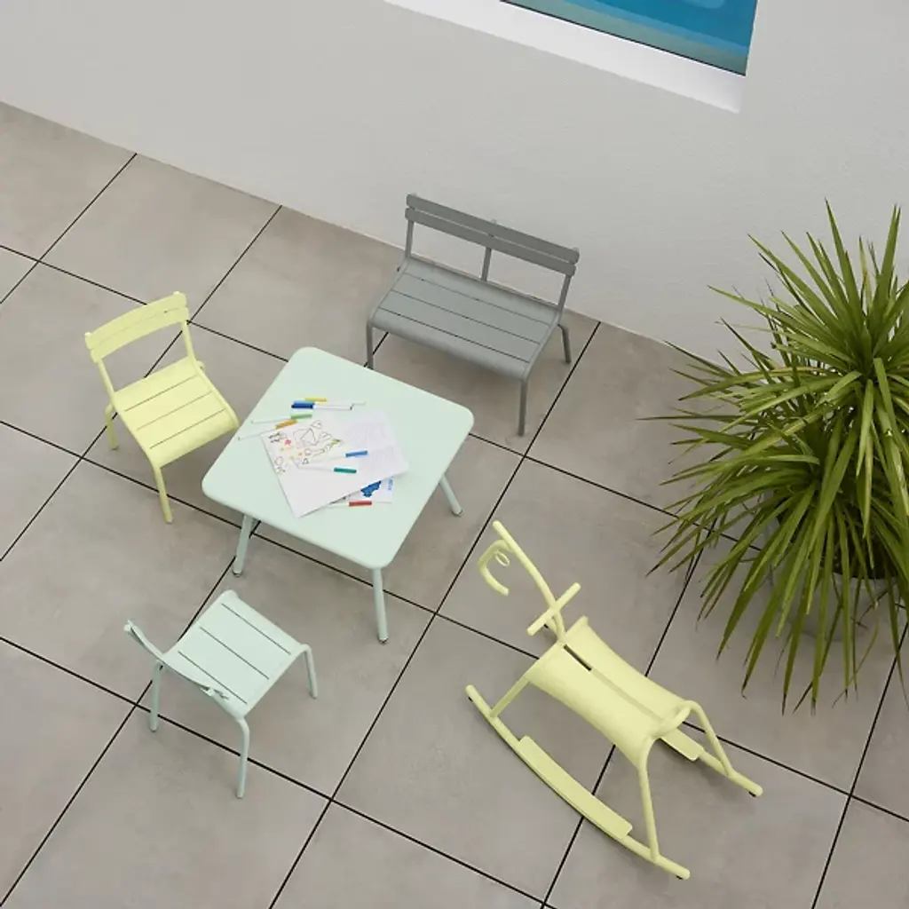 Fine design, perfectly pint-sized. The Luxembourg Kid Bench by Fermob features the Luxembourg collection’s smooth signature style, but it’s scaled down to accommodate younger design lovers (approximately 3-6 years old). It has a curved aluminum slat seat and backrest, both supported by a tubular aluminum frame. A powder coat finish makes this bench colorful and durable—and adorable—for use in a child’s room or play area, outdoors or in. Designed by Frederic Sofia.
