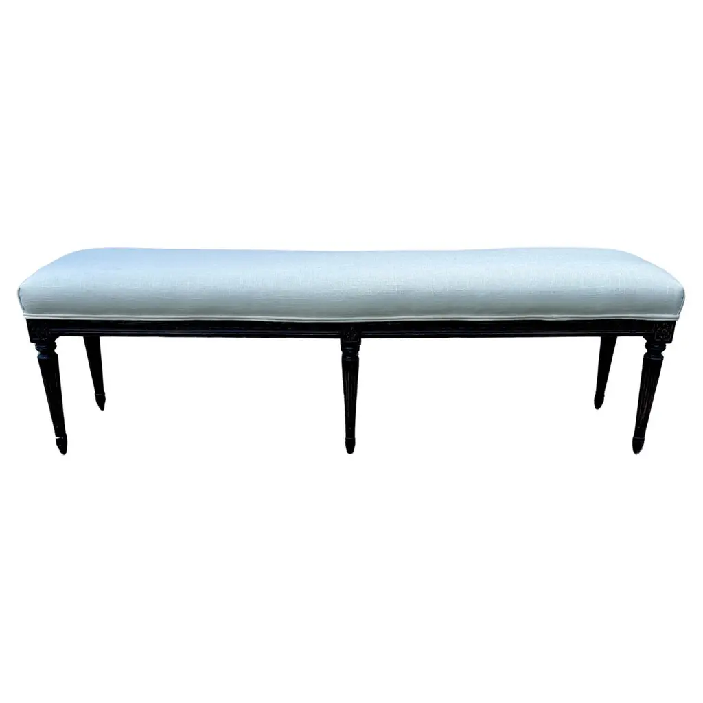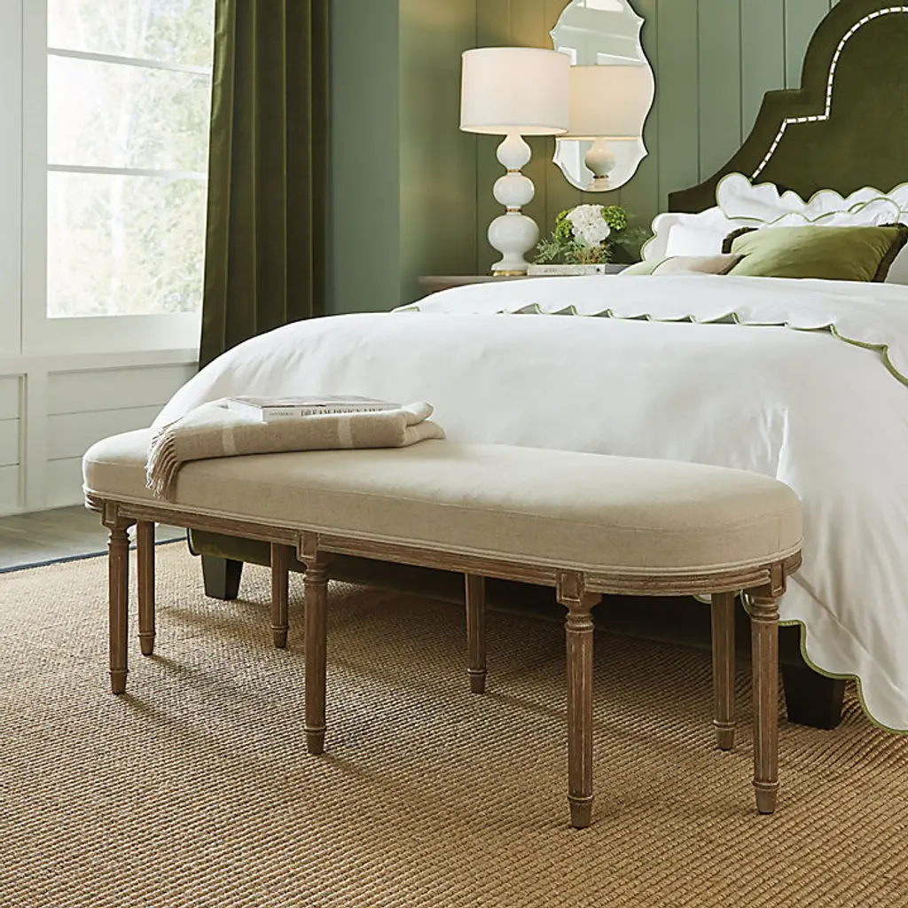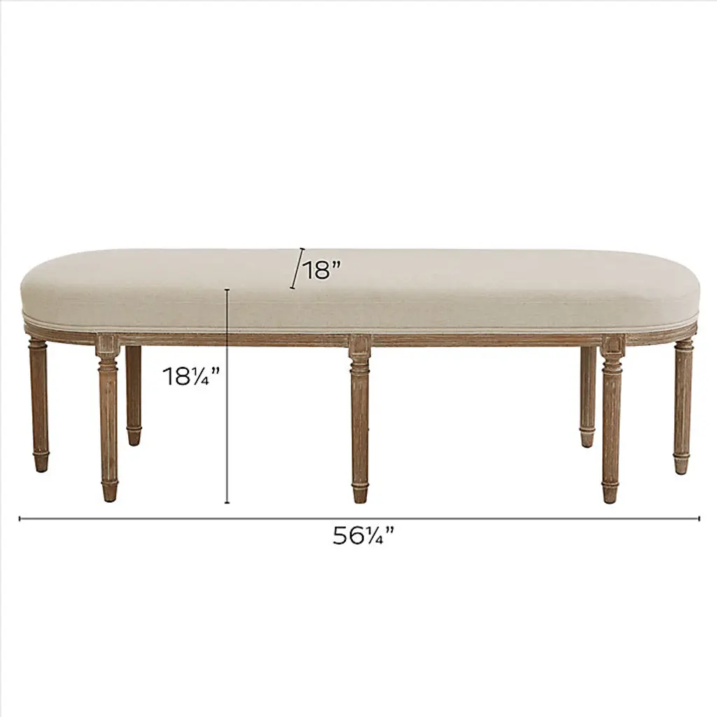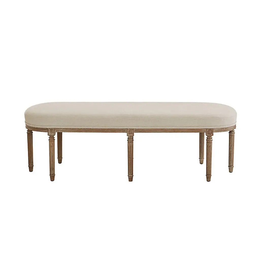 Elegant seating in the timeless Louis XVI style. Our Madeline Upholstered Bench is hand crafted of solid limed oak in a graceful oblong silhouette with fluted apron, eight simply turned legs, and refined corner blocks. The updated look blends effortlessly with any decor, and works beautifully as an entryway bench or as a comfy perch at the end of bed. Luxurious down blend seat is expertly covered in natural linen blend. Madeline Bench features: