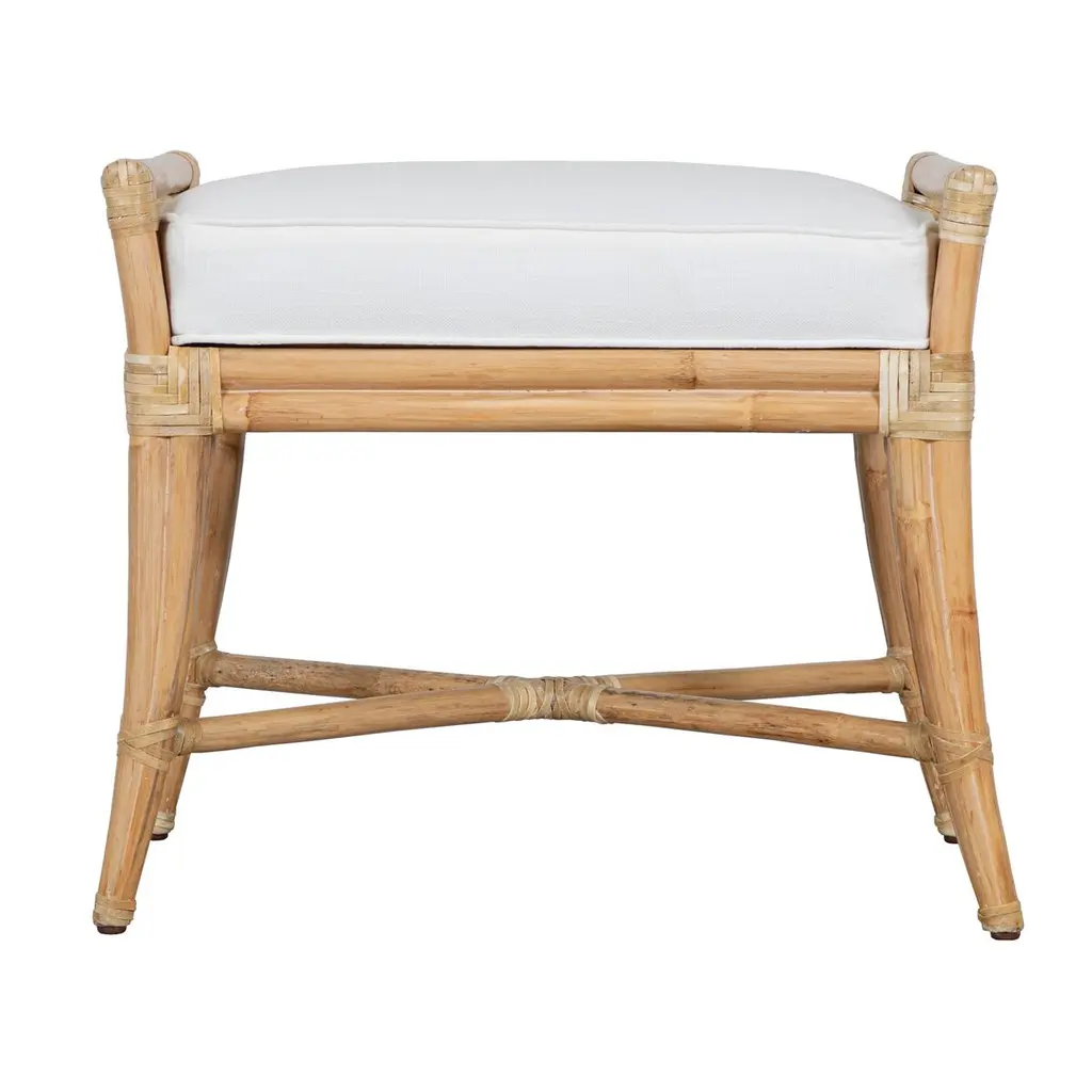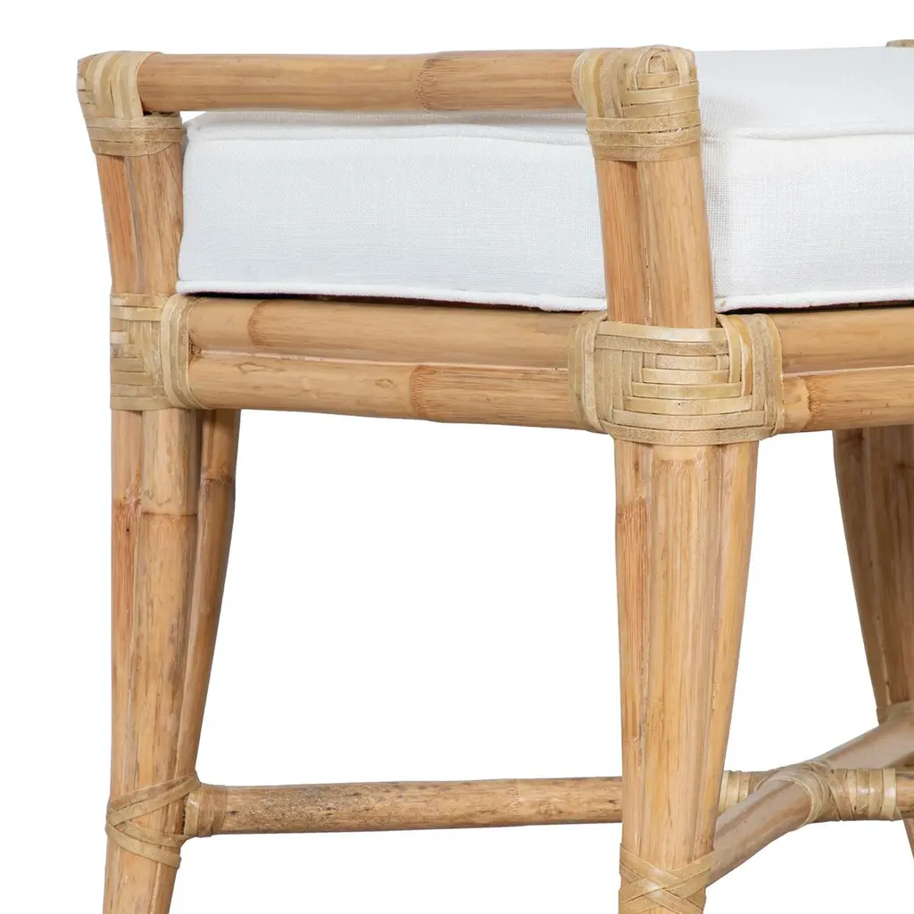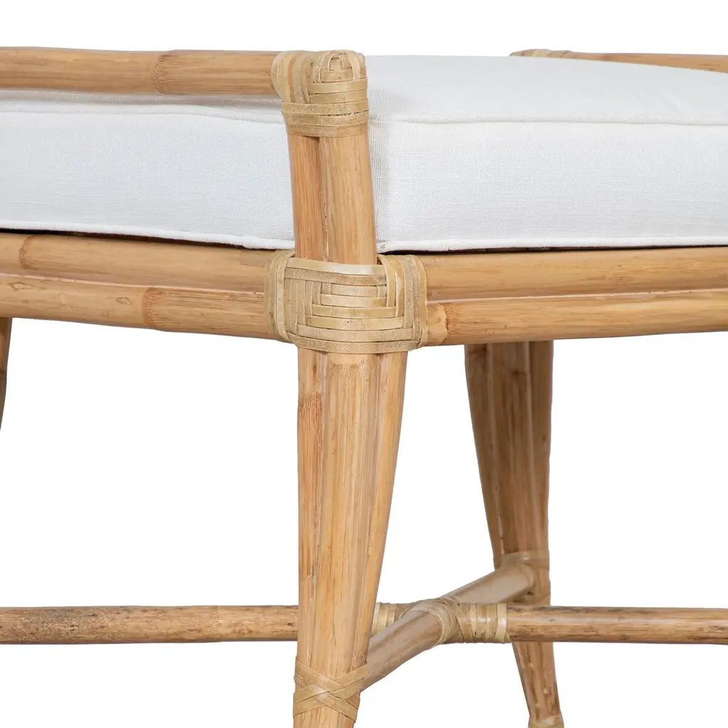 The sophisticated design of the Malacca Bench will complement any space. Hand-crafted with natural Rattan and leather-wrapped bindings to add strength and stability. The tightly boxed seat cushion is covered in InsideOut Performance Fabric. This bench is available in two wonderful sizes. Each piece is finished and upholstered to order at our Florida factory. Show off your style with this timeless design that is finished to order just for you!
