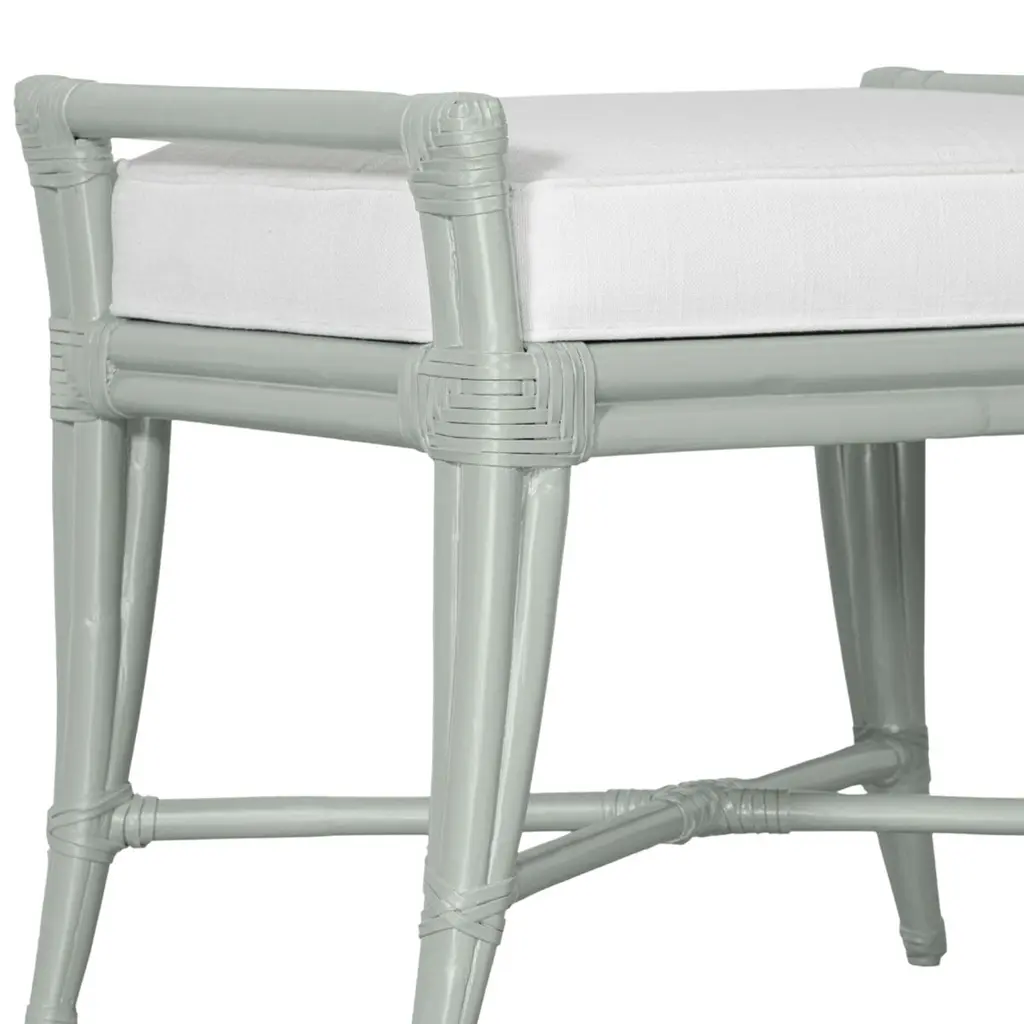The sophisticated design of the Malacca Bench will complement any space. Hand-crafted with natural Rattan and leather-wrapped bindings to add strength and stability. The tightly boxed seat cushion is covered in InsideOut Performance Fabric. This bench is available in two wonderful sizes. Each piece is finished and upholstered to order at our Florida factory. Show off your style with this timeless design that is finished to order just for you!
