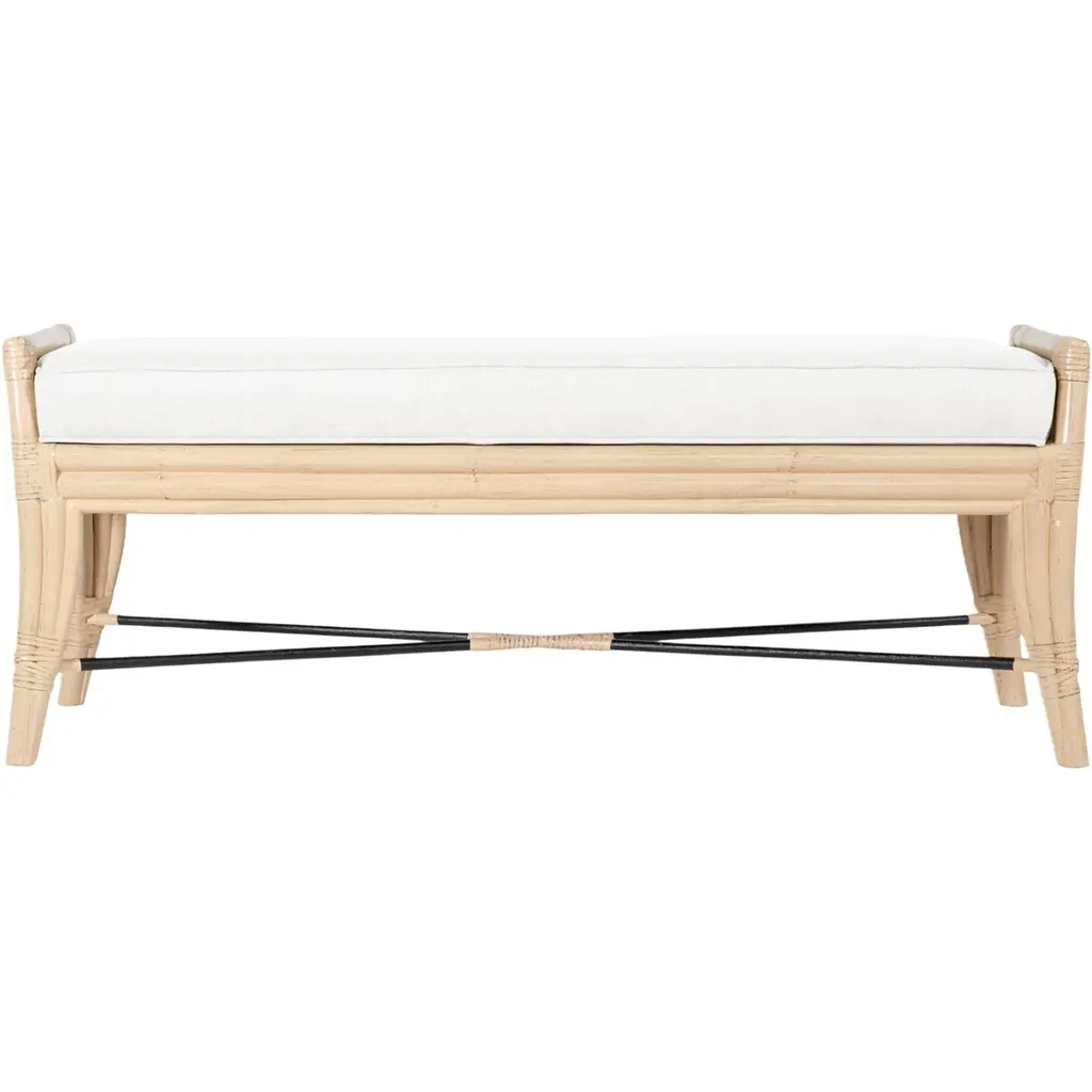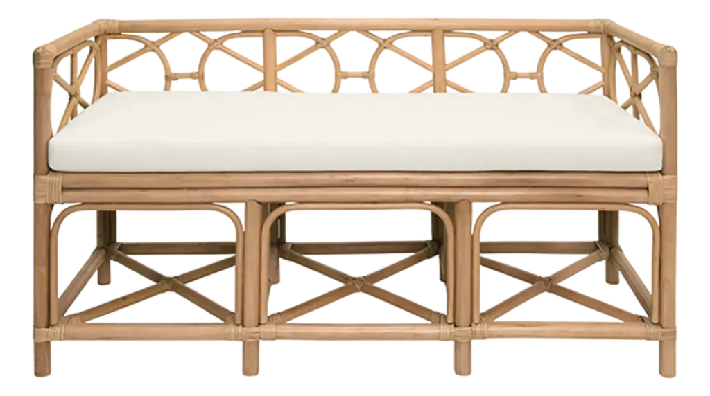 The sophisticated design of the Malacca Bench will complement any space. Hand-crafted with natural Rattan and leather-wrapped bindings to add strength and stability. The tightly boxed seat cushion is covered in InsideOut Performance Fabric. This bench is available in two wonderful sizes. Each piece is finished and upholstered to order at our Florida factory. Show off your style with this timeless design that is finished to order just for you!