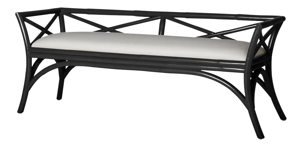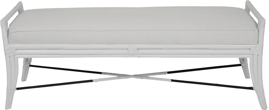 This beautifully designed bench from David Francis features a Rattan frame, rawhide-wrapped joints and a tight boxed seat upholstered in a soft white fabric. Each David Francis bench is hand-finished and upholstered in the USA. Please allow time for delivery.