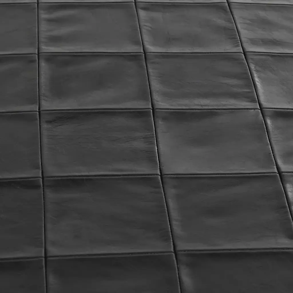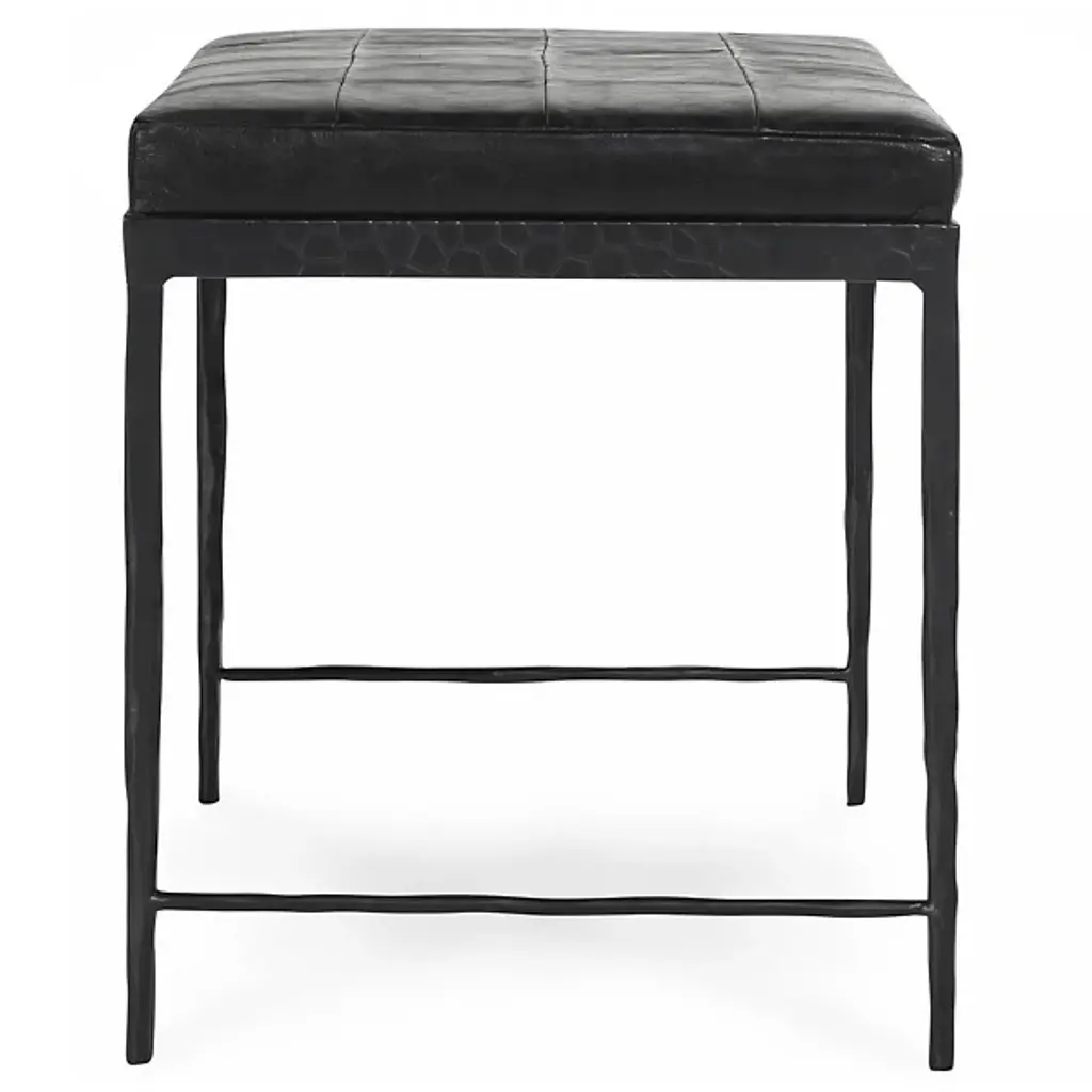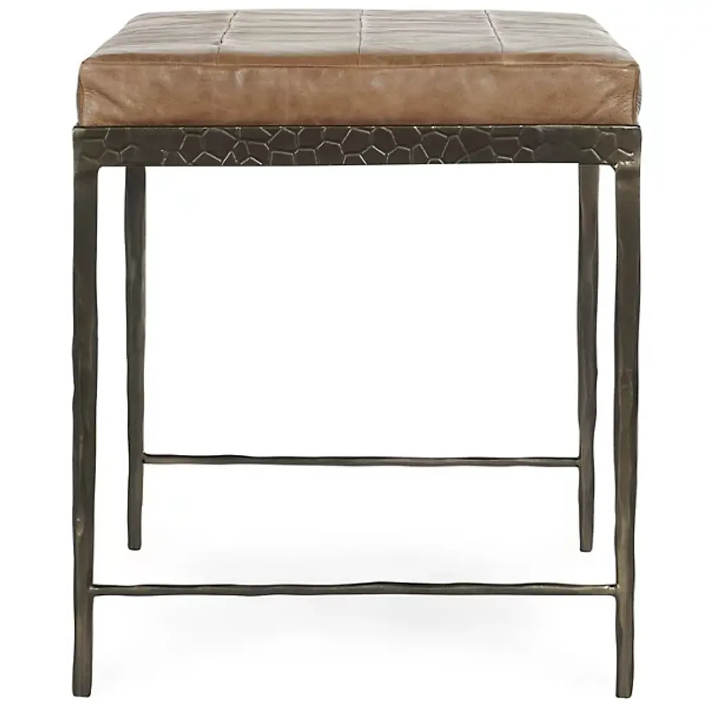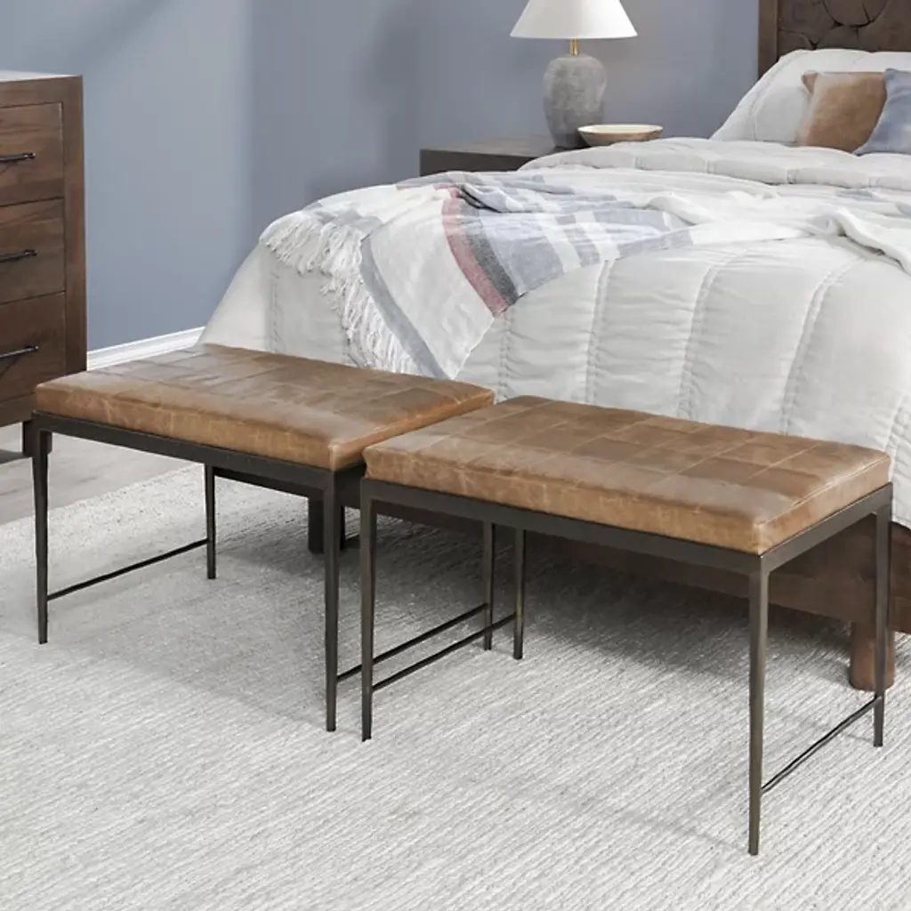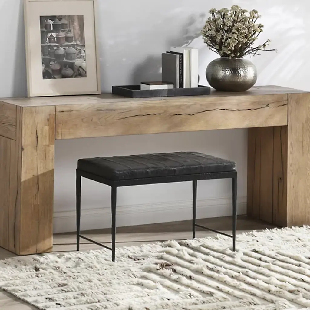 The Malo Bench from Classic Home unites hand-hammered iron with quilted leather craftsmanship. The patchwork seat cushion uses genuine top-grain leather, creating a comfortable perch atop the metalwork frame. Dark finishing on the iron framework reveals subtle textures from the hammering process while supporting bars underneath provide stability. The thin legs maintain a delicate appearance despite their sturdy construction. This single-seat bench balances the raw quality of hammered metal against buttery-soft leather upholstery, making it suitable for entryways or as accent seating.