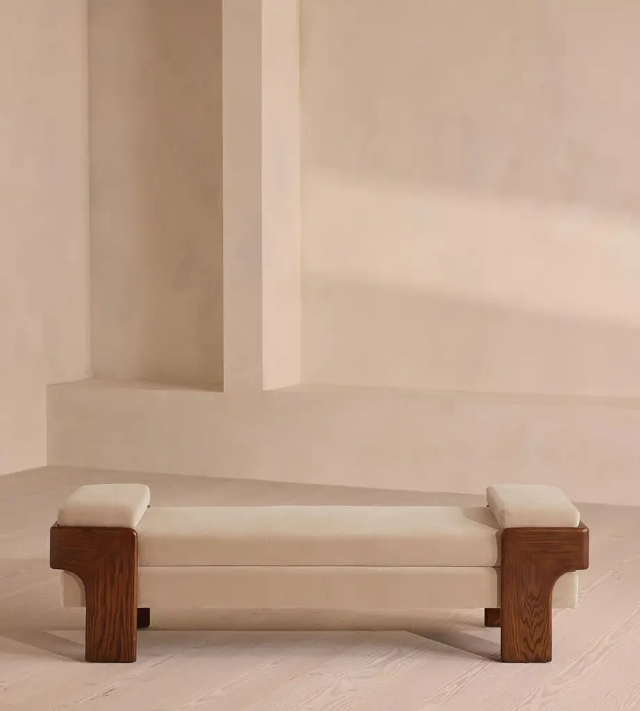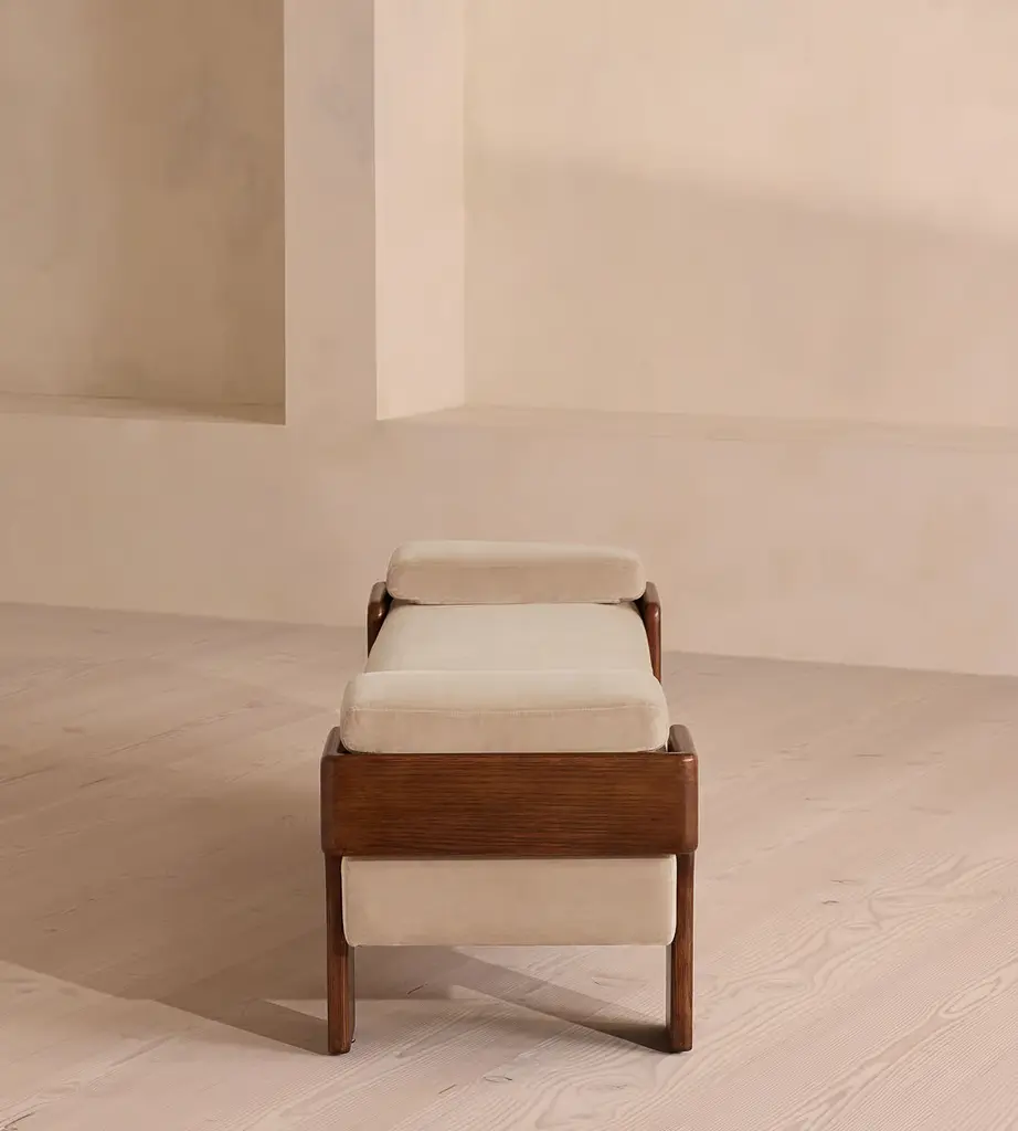 The relaxed silhouette is finished with feather-wrapped cushions upholstered in velvet. Designed as part of our Marcia collection, this bench similarly echoes the relaxed social setting of Shoreditch House. Secured by a solid oak framing at either side, its silhouette is fitted with a feather-wrapped seat cushion and two bolster cushions fully upholstered in velvet in our made-to-order palette.