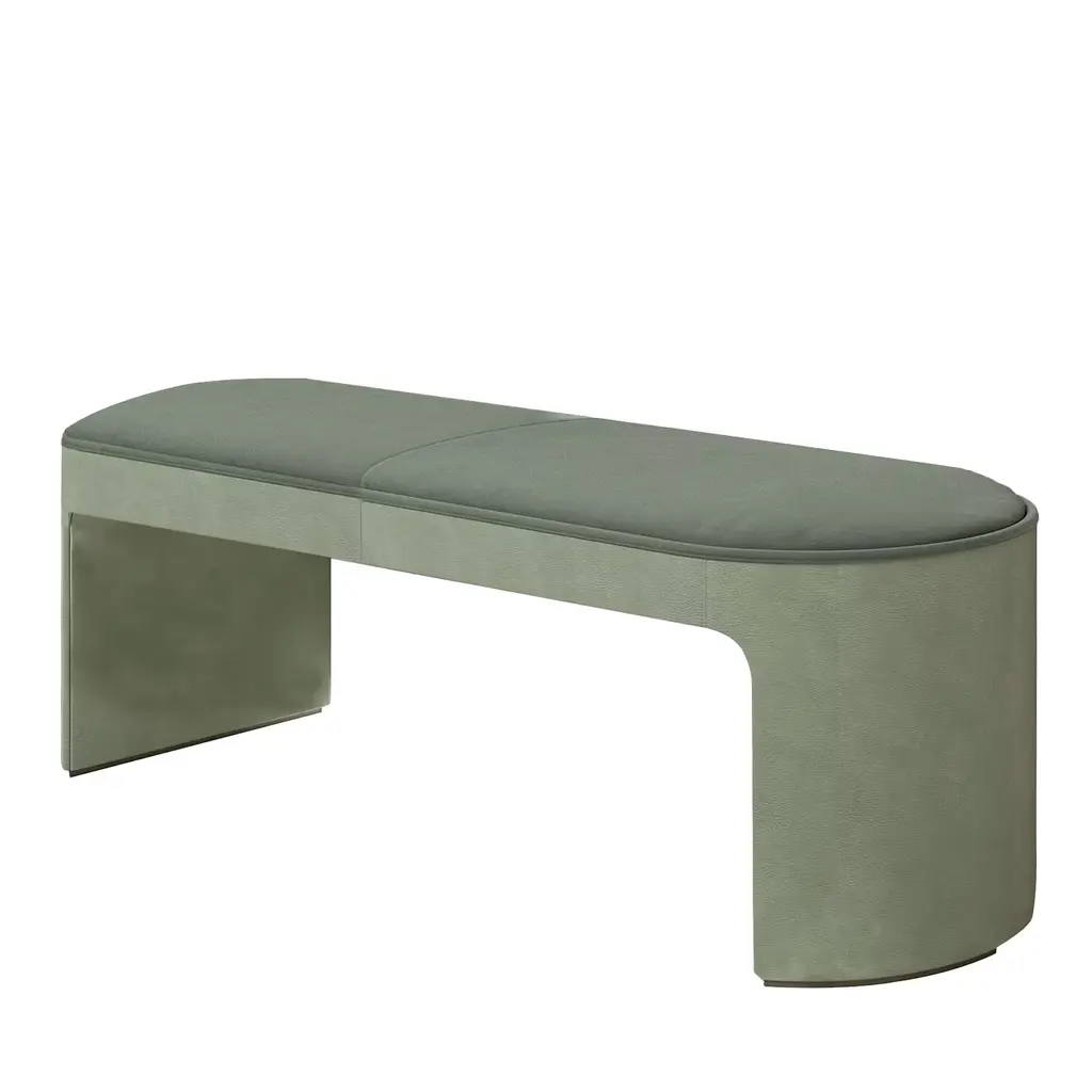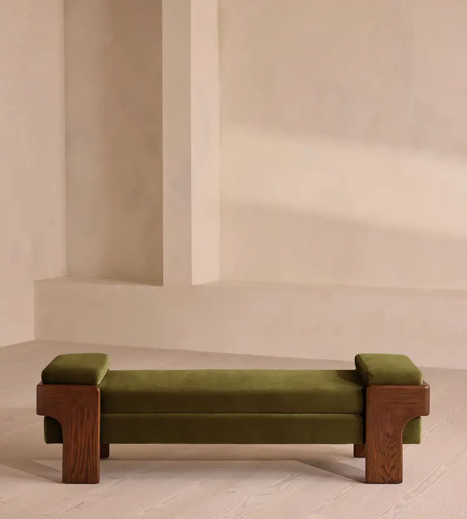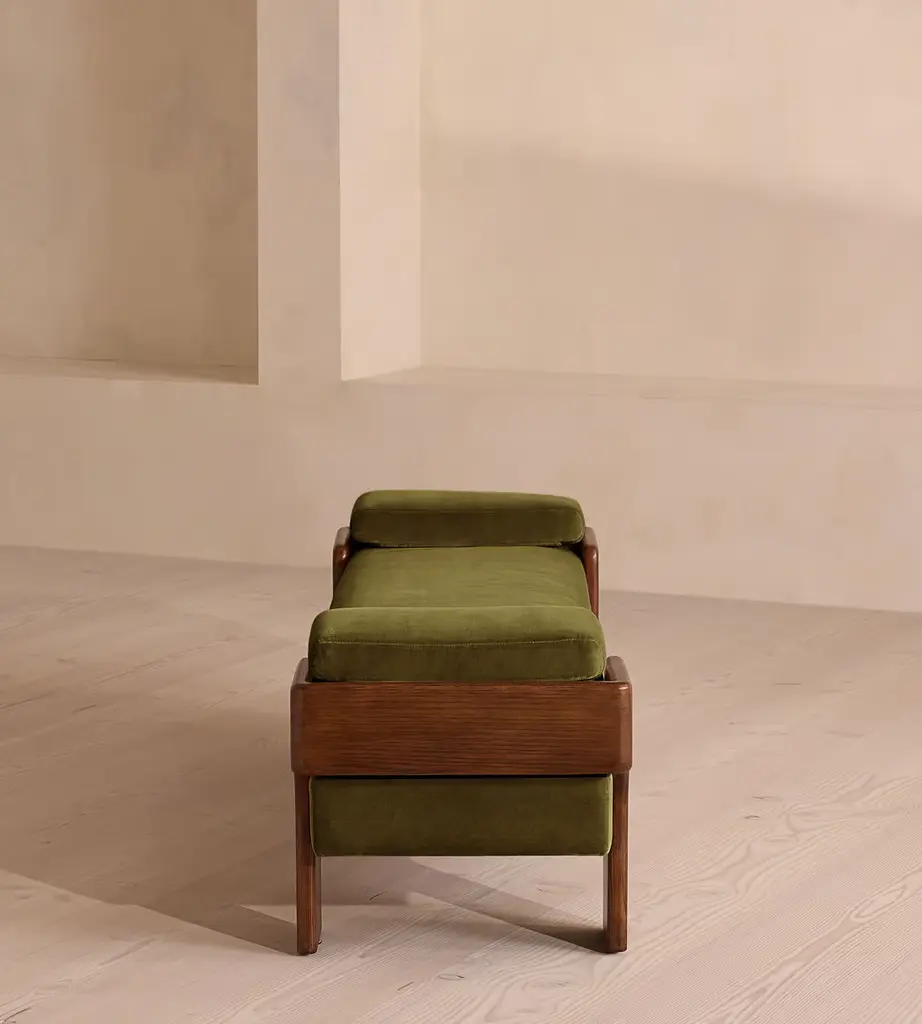 The relaxed silhouette is finished with feather-wrapped cushions upholstered in velvet. Designed as part of our Marcia collection, this bench similarly echoes the relaxed social setting of Shoreditch House. Secured by a solid oak framing at either side, its silhouette is fitted with a feather-wrapped seat cushion and two bolster cushions fully upholstered in velvet in our made-to-order palette.