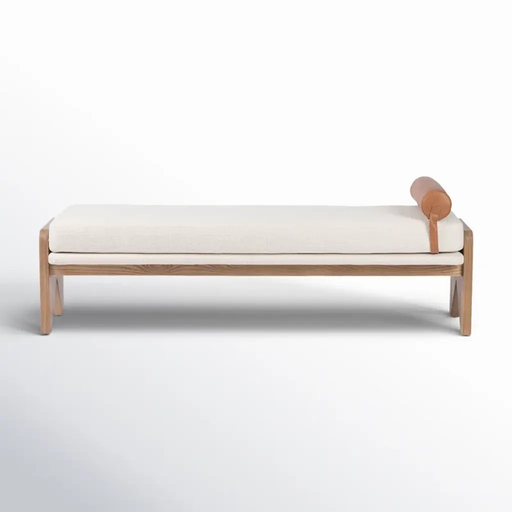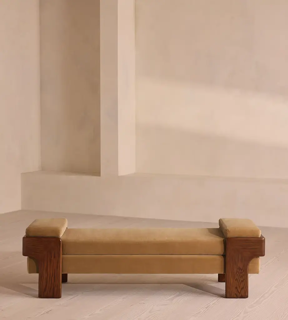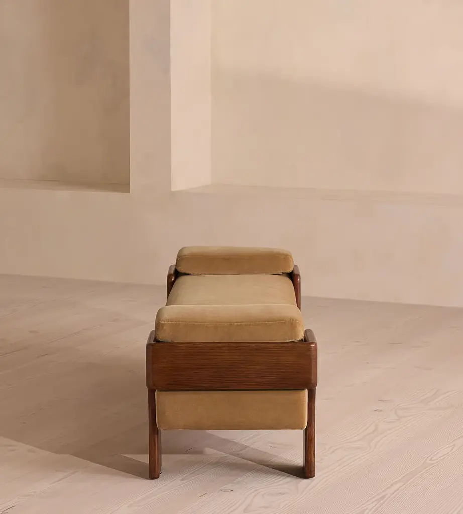 The relaxed silhouette is finished with feather-wrapped cushions upholstered in velvet. Designed as part of our Marcia collection, this bench similarly echoes the relaxed social setting of Shoreditch House. Secured by a solid oak framing at either side, its silhouette is fitted with a feather-wrapped seat cushion and two bolster cushions fully upholstered in velvet in our made-to-order palette.