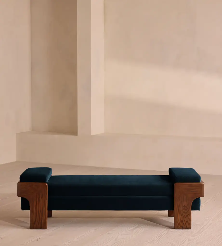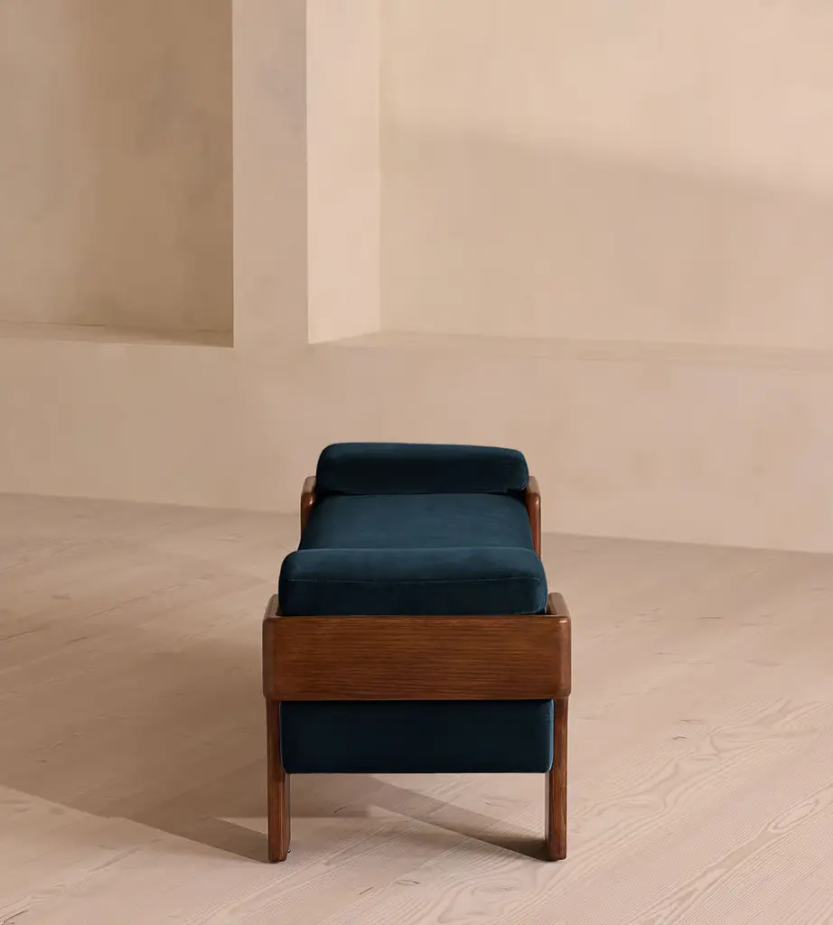 The relaxed silhouette is finished with feather-wrapped cushions upholstered in velvet. Designed as part of our Marcia collection, this bench similarly echoes the relaxed social setting of Shoreditch House. Secured by a solid oak framing at either side, its silhouette is fitted with a feather-wrapped seat cushion and two bolster cushions fully upholstered in velvet in our made-to-order palette.