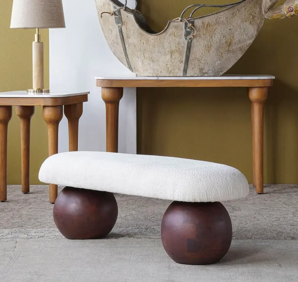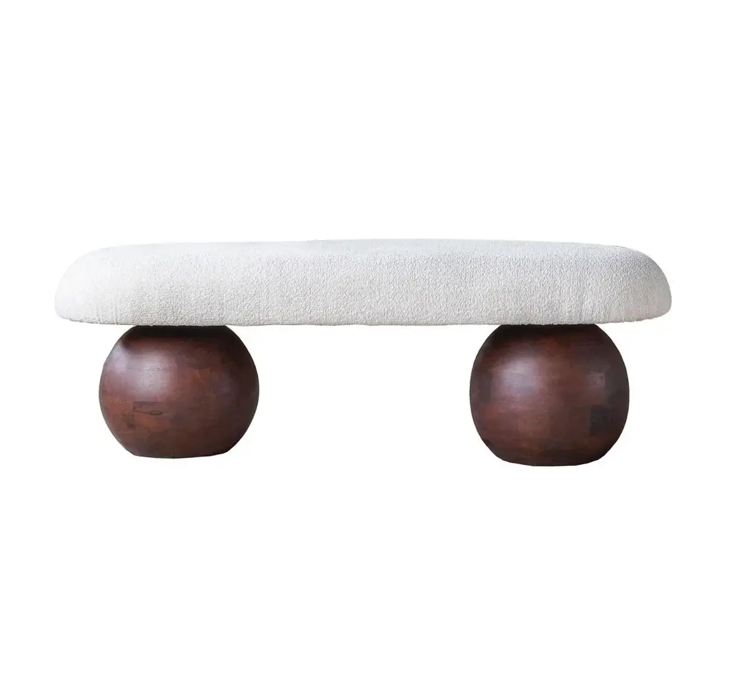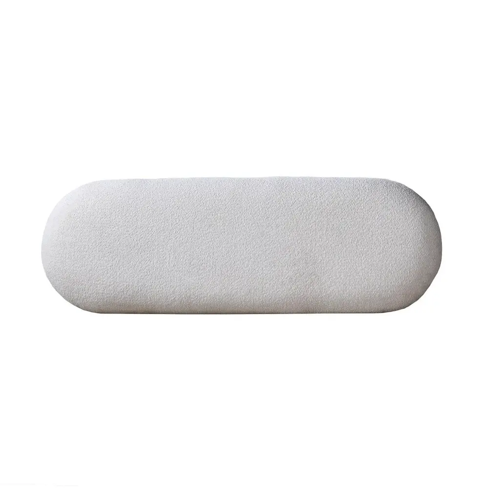 The long, oval-shaped surf Bench is upholstered in a white fabric and is comfortably stylish. The surf Bench has two, ball-shaped legs for a sensuous look.