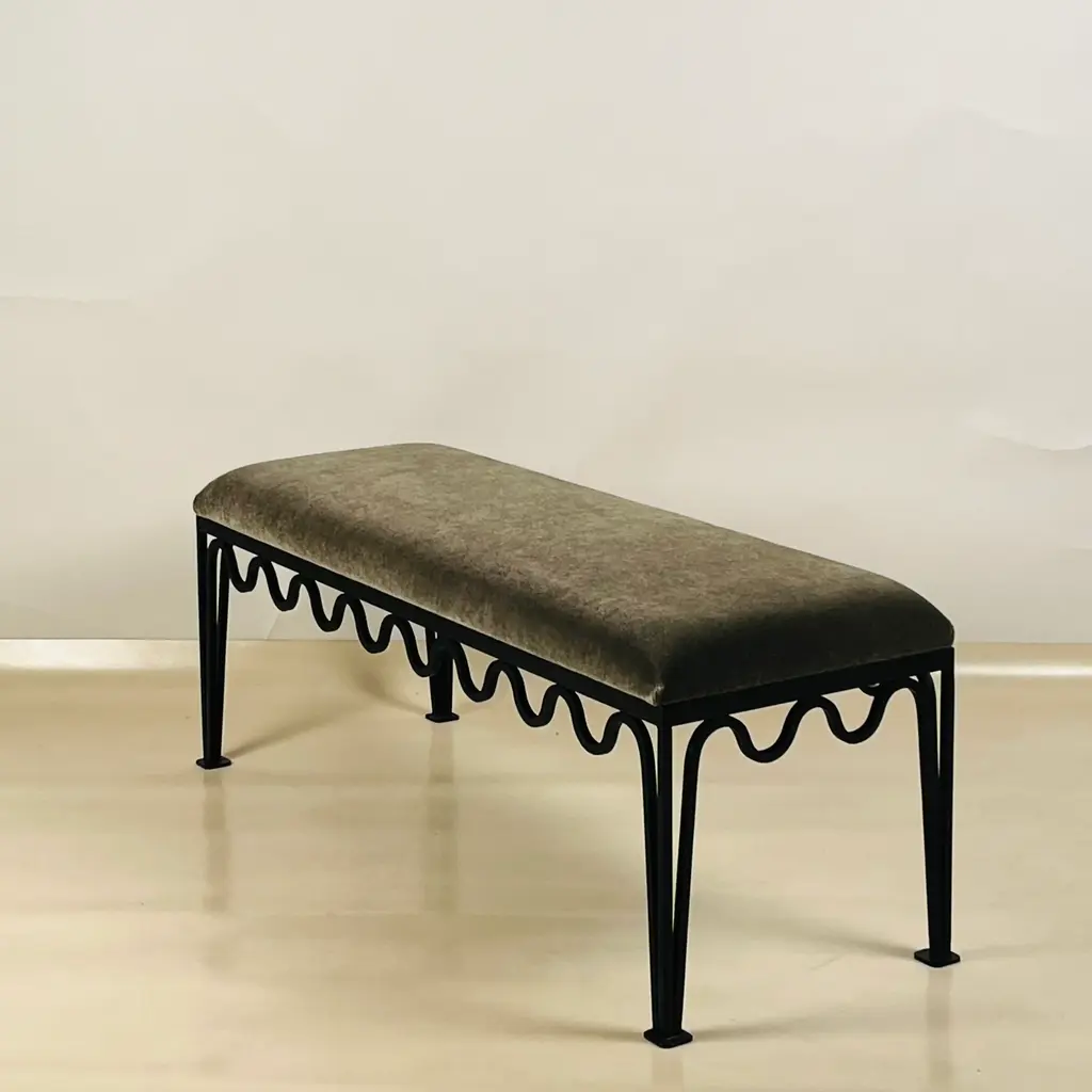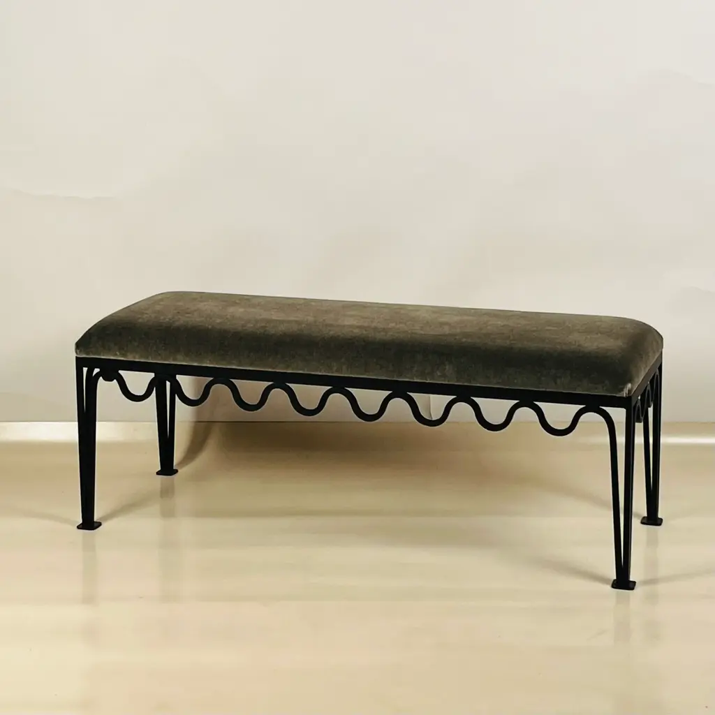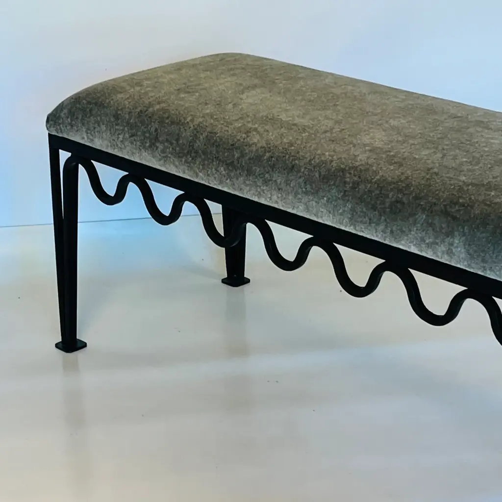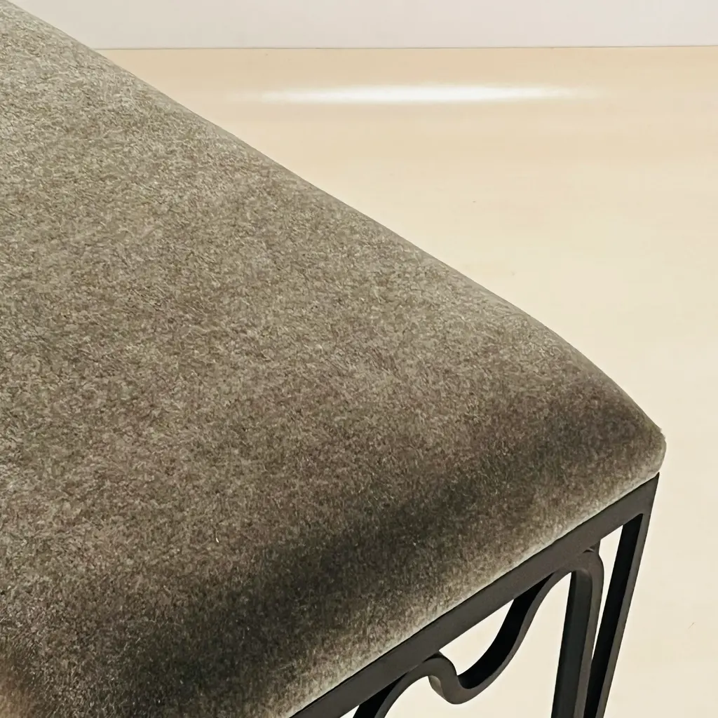 The Méandre™ bench by DESIGN FRÈRES® in mohair velvet. Upholstered firm in mohair velvet. Mohair velvet is extremely durable and resists dirt and crushing. If a piece is going to be heavily used, mohair is the gold standard. Perfect for an entry, a hallway or a the foot of a bed.