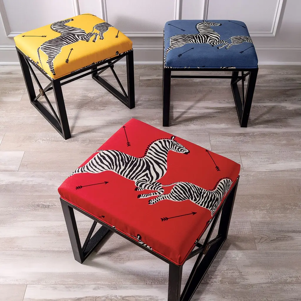 Right-facing prancing zebras of Scalamandré's iconic print grace this bench's bold red seat cushion, which is amply filled with foam for long-lasting comfort and support. Cast-metal X-shape sides joined by a trestle beam and accented with golden medallions adds to the elegance.