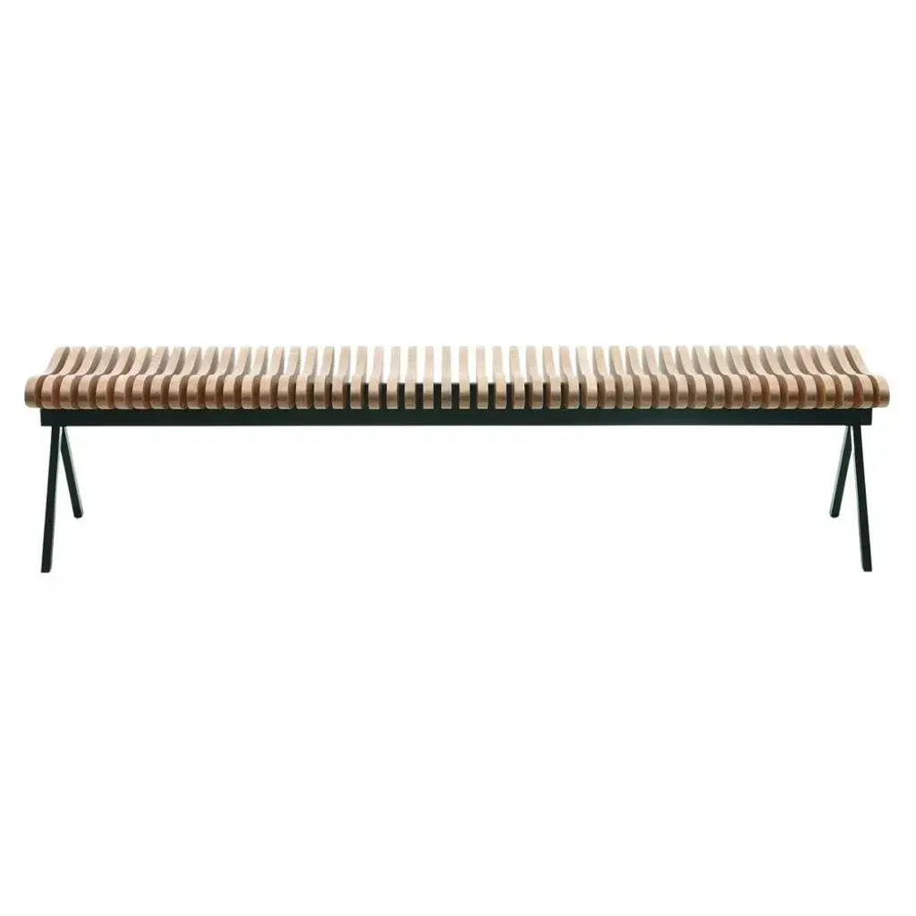Perlude oak bench medium by Caroline Voet. Dimensions: 50 x 150 x H 43 cm. Materials: Natural oak. Also available in seating oak black, seating walnut natural, seating teak (outdoor). The Perlude benches are assembled from top grade FSC-labelled wood, solid oak for indoor use, and teak for outdoor use, fixated to a minimal steel base frame lacquered black. By combining a sturdy metal base with the fluent and elegant lines of the repetitive wooden parts of the seating surface, the PRELUDE bench creates a surprising visual effect while still keeping very comfortable. The Perlude can be used as a free standing bench or as a seat to a table playing its role as resting point at home as well as in a commercial environment and the public space, by inviting in a subtle and elegant way to a conversation as a true prelude to a dialogue. PU.