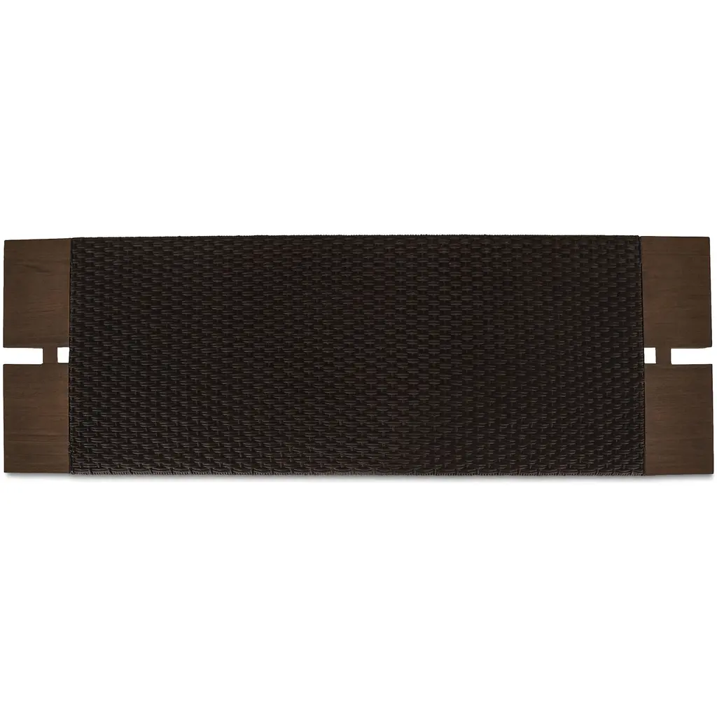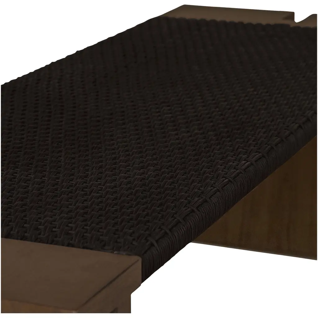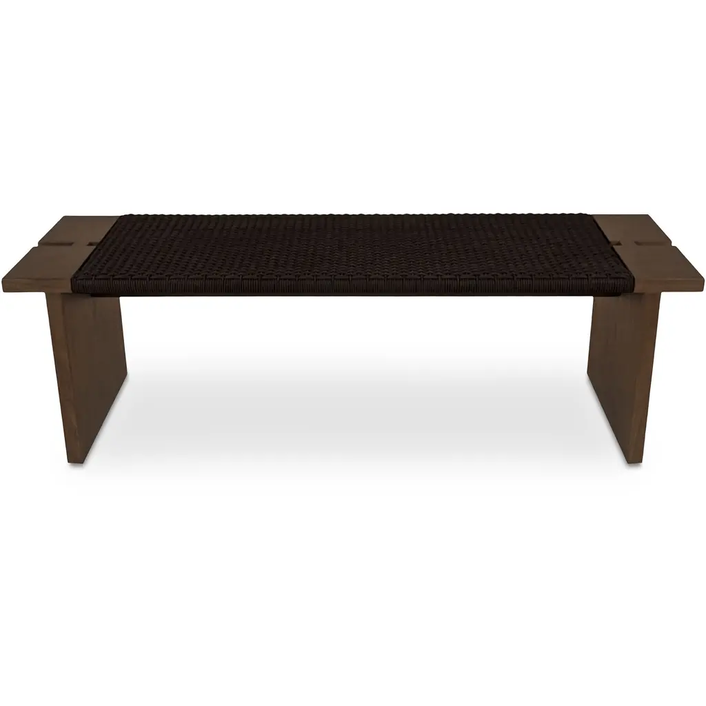 The Merritt outdoor bench blends indoor refinement with outdoor durability. This versatile bench features a solid teak frame complemented by woven, twisted synthetic hyacinth. The dark brown finish adds a touch of sophistication to any setting. Suitable for both outdoor use and as an entryway bench, it provides stylish seating and a subtle textural element to elevate any space.