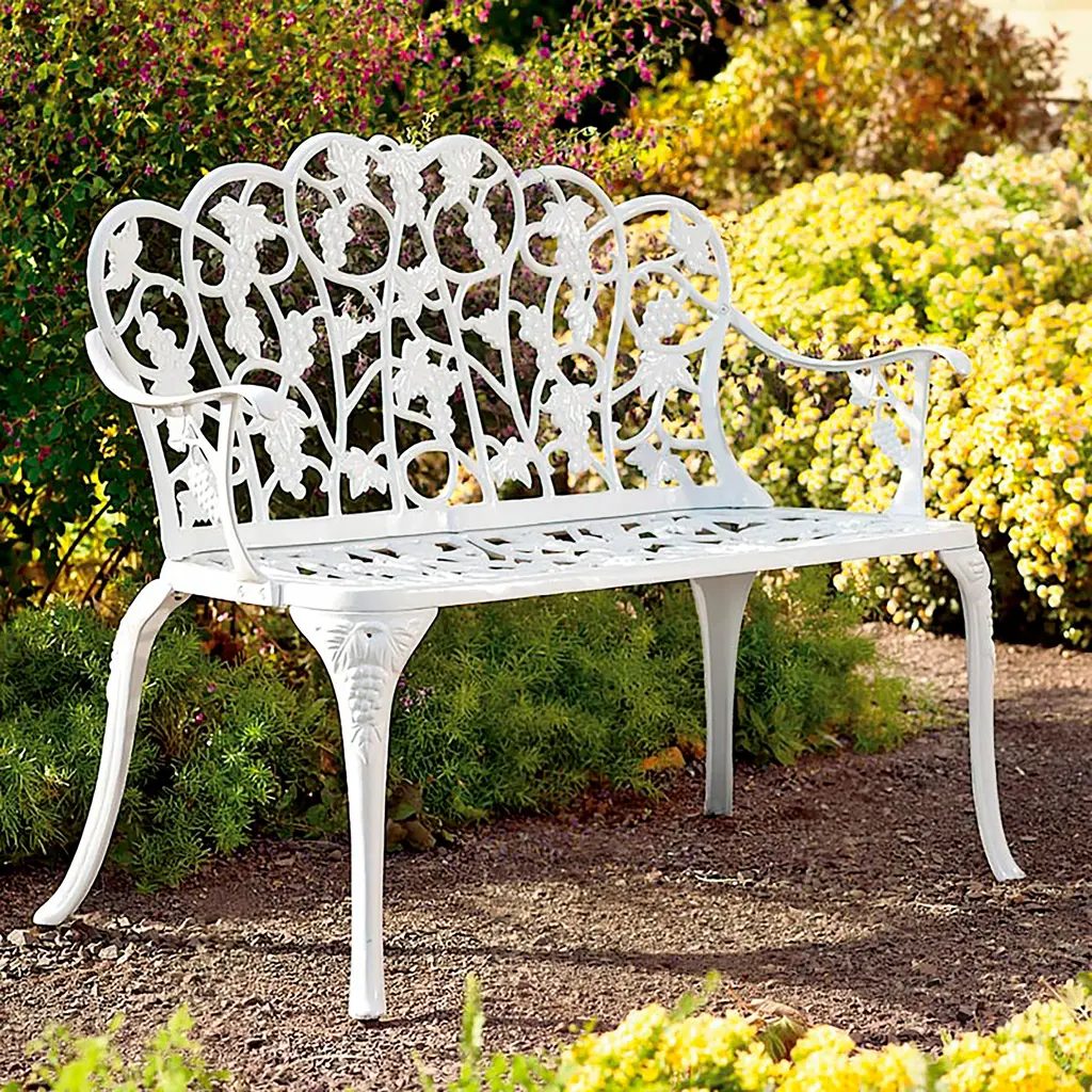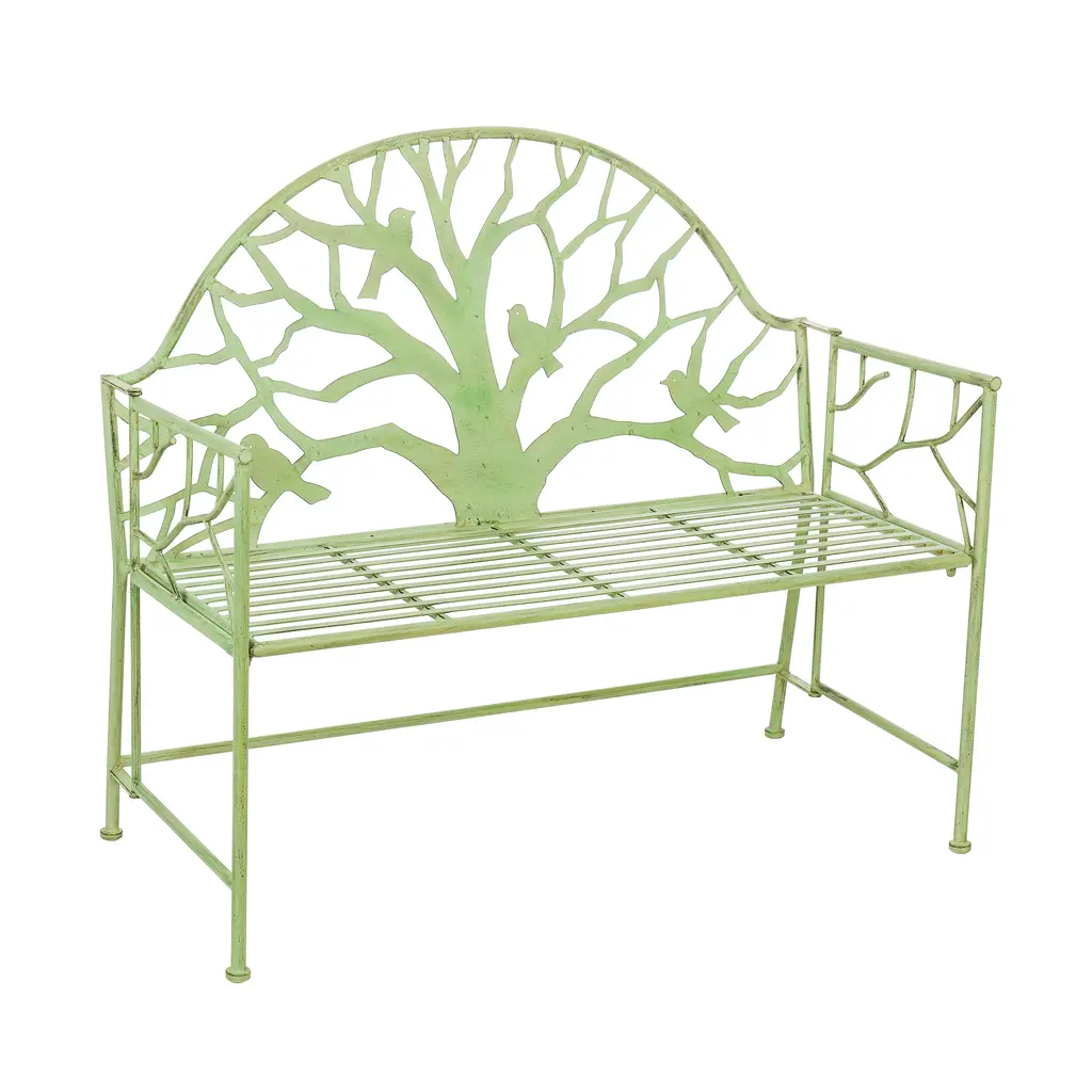 This bench is elegant and functional. It features a cutout design of a beautiful tree with birds in the center in a modern mint green metal. With standard panel slats, this bench is the perfect accent piece in any garden. Whether seeking solace in nature or simply enjoying a quiet moment alone, this bench is a great place to let every worry melt away.