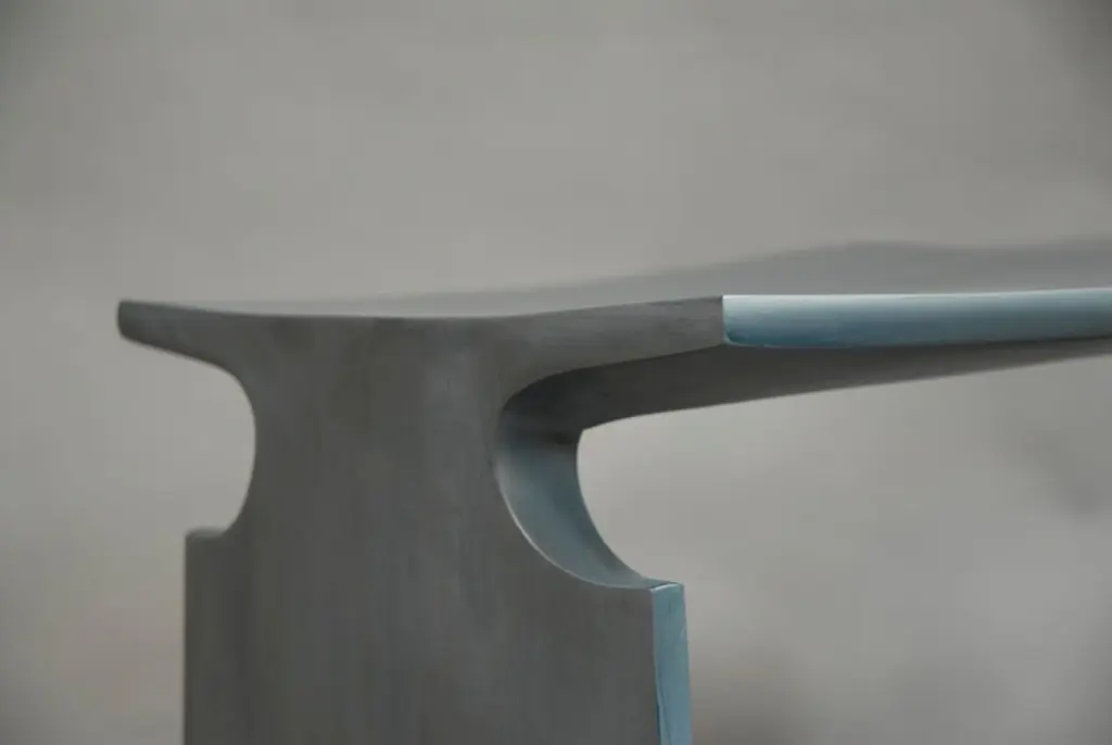 An MFA (Museum of Fine Arts) burnished blue milk paint bench over maple wood, by American studio Craft artist David N. Ebner.Note: All works signed by the artist, David N. Ebner.Please see the newly published book "David Ebner: Studio Furniture" by Nancy Schiffer.Through the use of stripped down Classic forms, David Ebner has updated and extended the mode of furniture solidified by Wharton Esherick, George Nakashima, Sam Maloof and the early Wendell Castle. Mr. Ebner's works are in the permanent collections at the Smithsonian Institute, The Museum of Fine Arts in Boston, The Art Institute of Chicago, and have been featured in the New York Times, Art & Antiques, House & Garden and Art + Auction. "As a designer," he says, "I like to find the essence, remove the embellishment and get down to the spirit of a line or design."