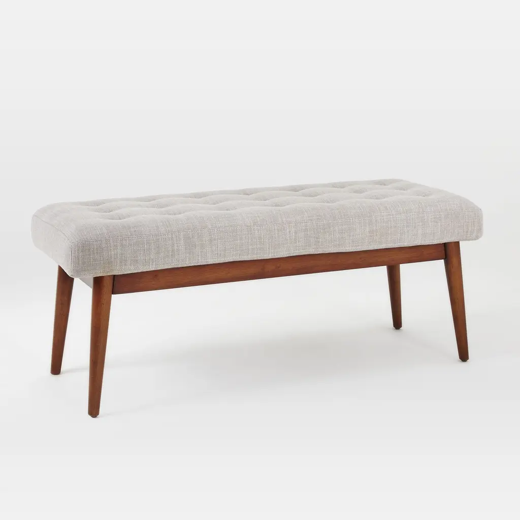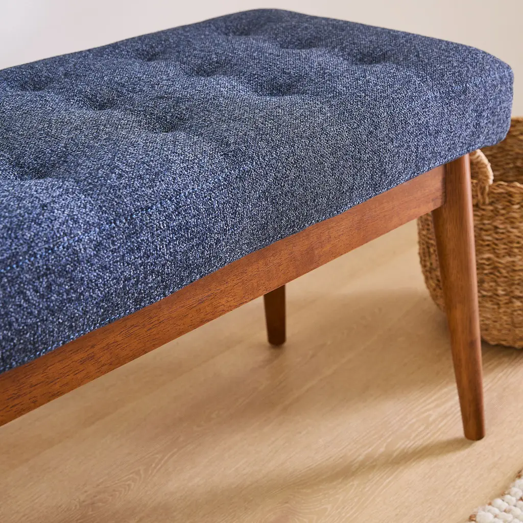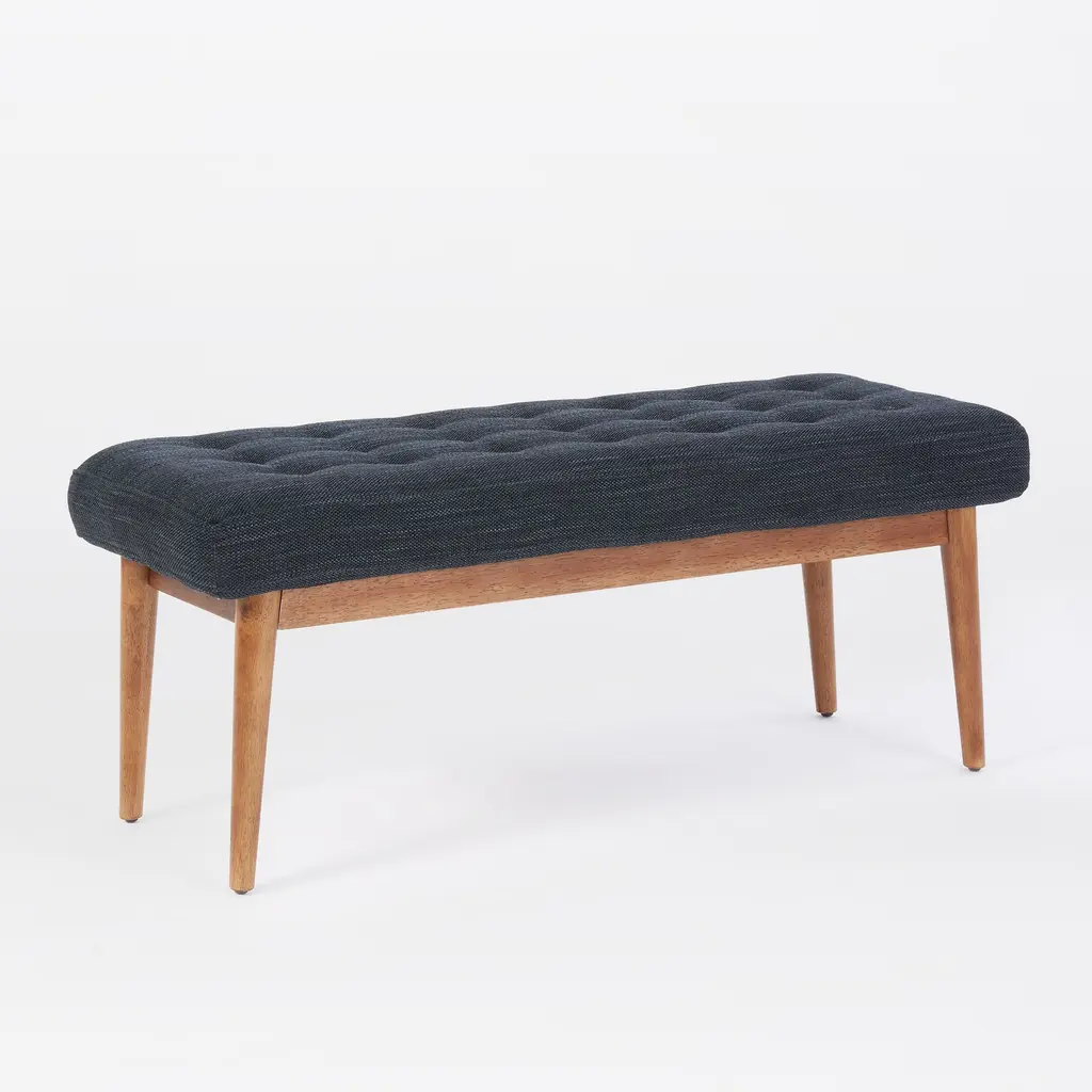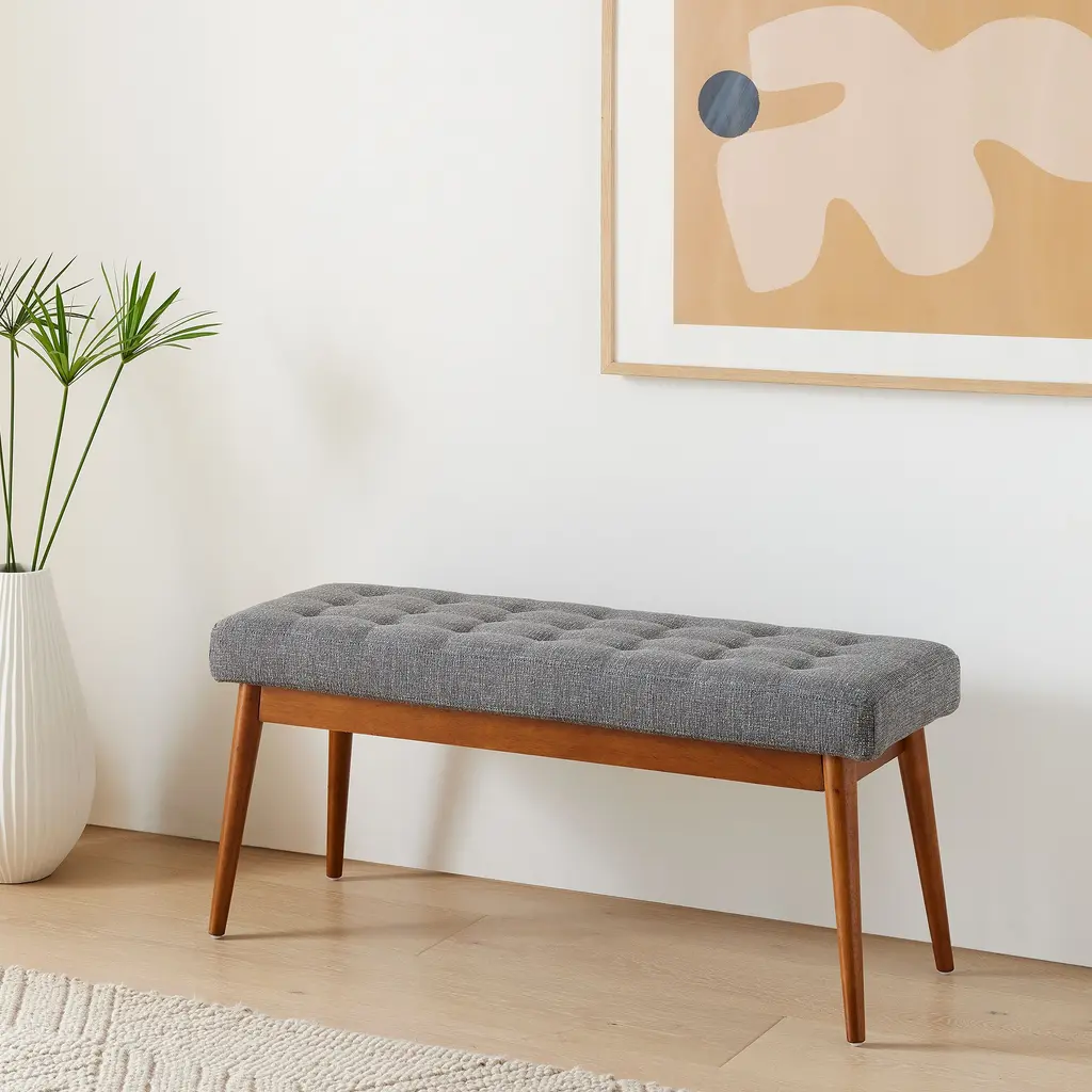 It's mid-century inspired, with a timeless look. Provides easy extra seating in any room you choose. All wood is kiln-dried for added durability. The wood used is sustainably sourced.