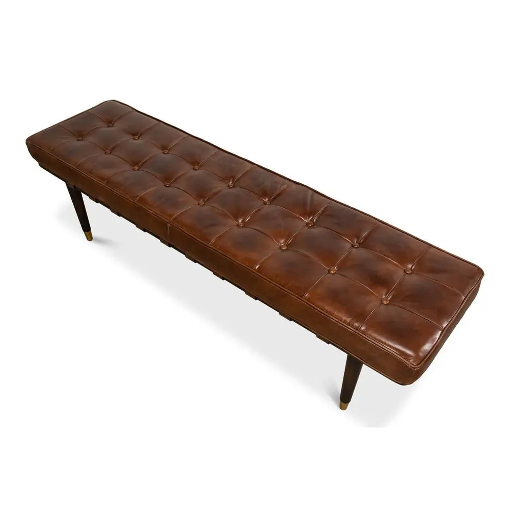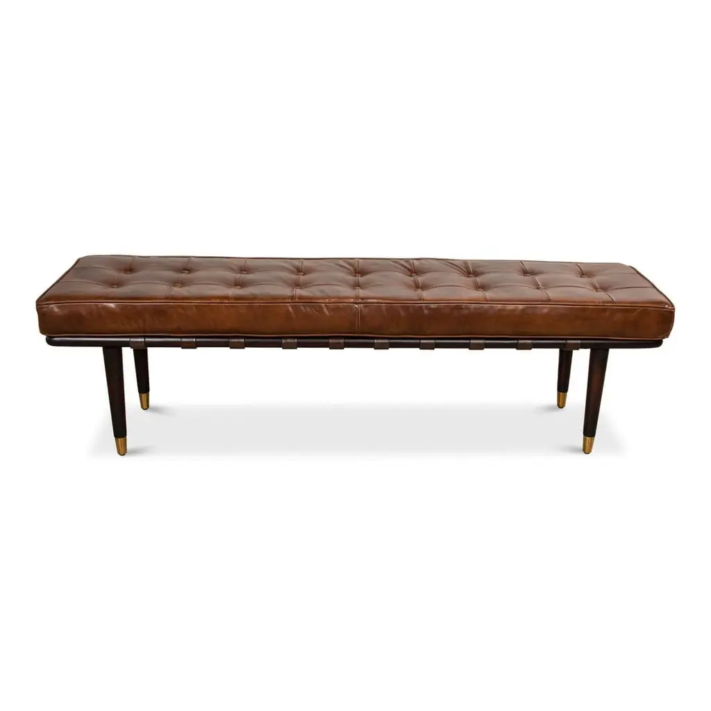 A Mid-Century Modern style tufted leather top bench. This boxed cushion benchtop is crafted in top grain leather in rich brown color with button tufting. It sits on four slender dark brown brass-capped wood legs. Dimensions: 64" W x 16" D x 18" H Color variation is common and acceptable on vintage-style leather.
