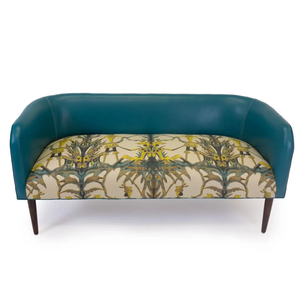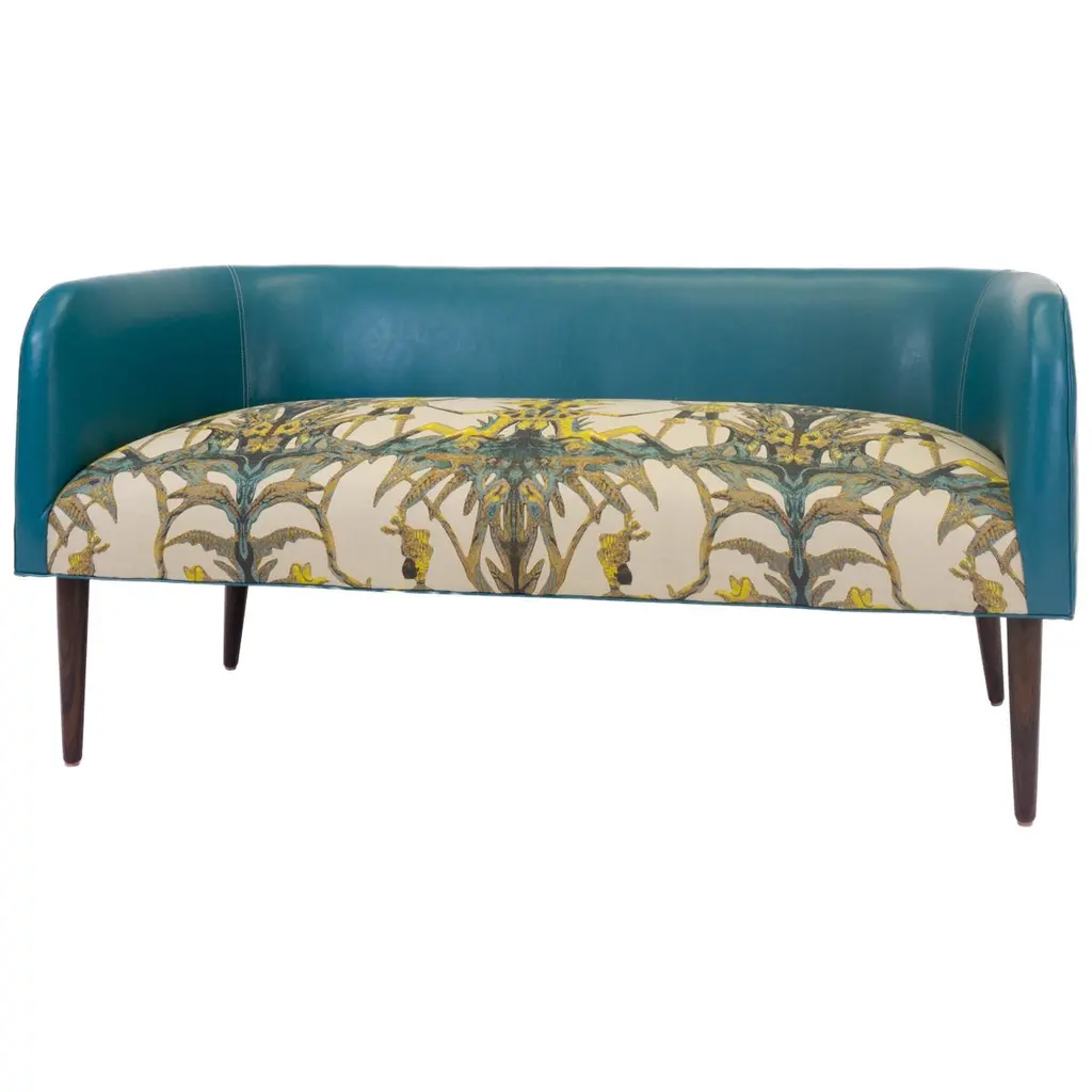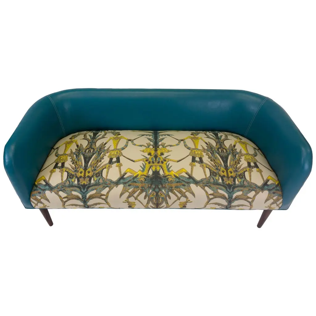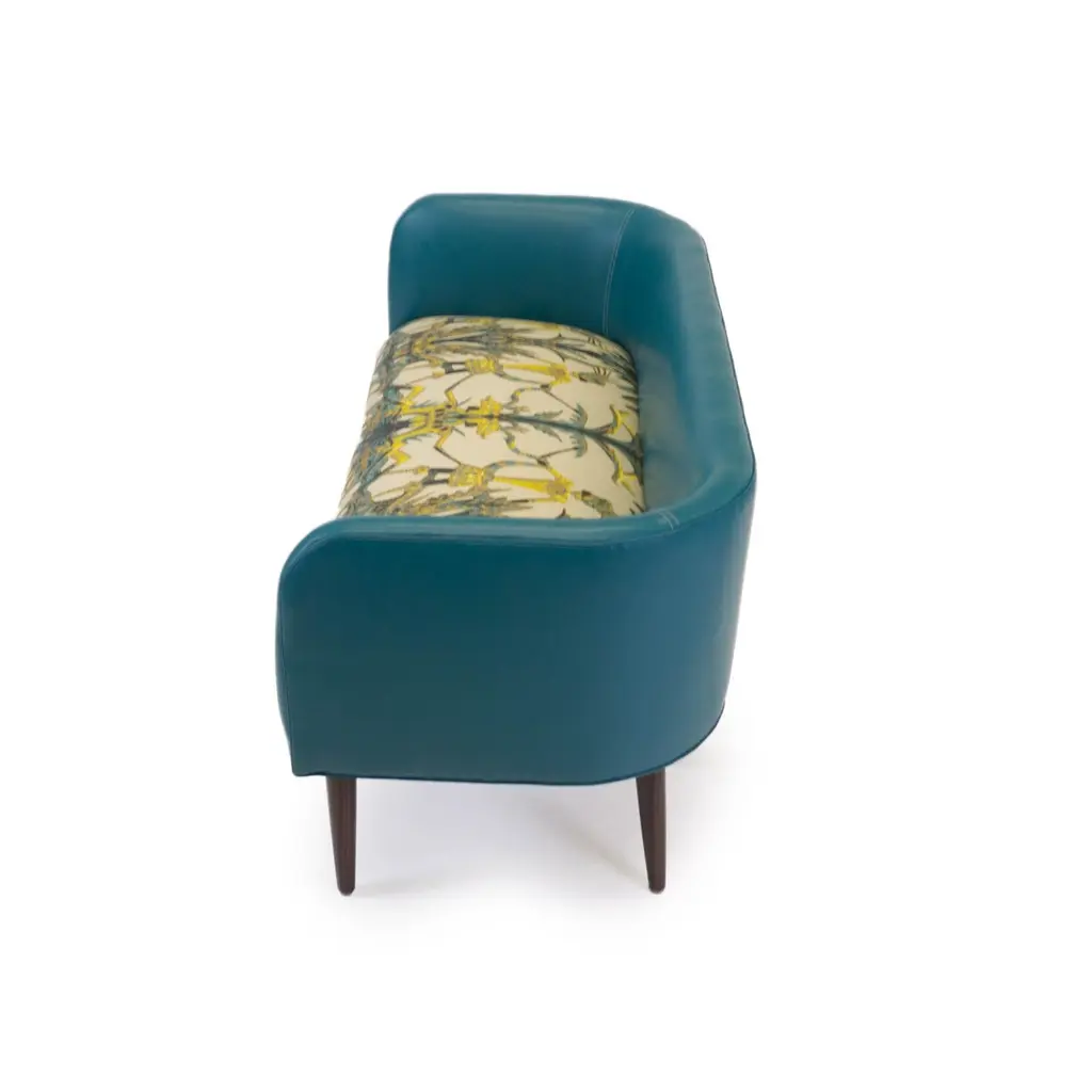 Petite banquette/bench made of solid hard maple is inspired by Mid-Century Modern design. The tight seat bench made with a high density cushion, sitting atop 8-way hand tied springs, features colorful combinations of fabrics. The back is upholstered in a blue vinyl set against a contrasting yellow and gold printed linen with a camel colored ground by Jim Thompson on the seat. The tapered wooden legs are dark carbon finish. This piece can be customized in size, fabric and wood finish. Measurements:Overall: 51”W x 22”D x 24”HInside: 46”W x 18”D x 8”HSeat height: 16"Price As Shown: $3,310 eachCOM Price: $2,860 eachCustomization may change price.How We Work:Made to order by Connecticut-based furniture design and manufacturing company The Tailored Home. Submit your customization desires by 1stdibs messenger for a quote. After orders are placed our workshop manager creates a visual work order for your approval for quality assurance.Customization Options:Dimensions can be customized. Ask for details.The fabric shown may come in more colors. We also carry thousands of other materials and can send you samples and fabric pricing upon request. We accept your fabric for a COM fee of 5% of the cost of the piece. Welting, piping, tape, or trim can be added. Different species are available for pieces with exposed wood and can be painted & lacquered in any Benjamin Moore color (for an additional charge) or stained in one of our stain options. Custom color matches cost $75 per sample.We accept inspiration photos of pieces you like.2021 - Made to OrderThis piece can be made as is or custom-made with the customer’s choice of materials and size adjustments.9-10 weeks
